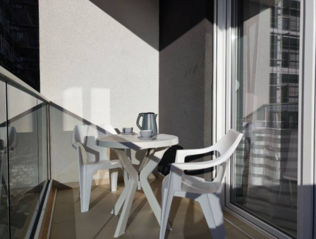 Stylish studio apartment with an area of 33 m2 is located on the 2nd floor of the first tower of the Emerald complex. Layout: kitchen, cozy living room with a fold-out sofa bed, modern bathroom with a glass shower cabin, terrace with a view of the mountains and a side view of the sea. The floors are covered with ceramic tiles that imitate marble, and the corridor and bathroom have underfloor heating. Large panoramic windows fill the space with light and warmth, while Fujitsu air conditioners provide comfort year-round. The complex is located in a quiet and peaceful area, just a 20-minute walk from the sea and 10 minutes from the center of Bar. The well-maintained territory includes a promenade, swimming pool, children's playground, parking, and well-kept green spaces.