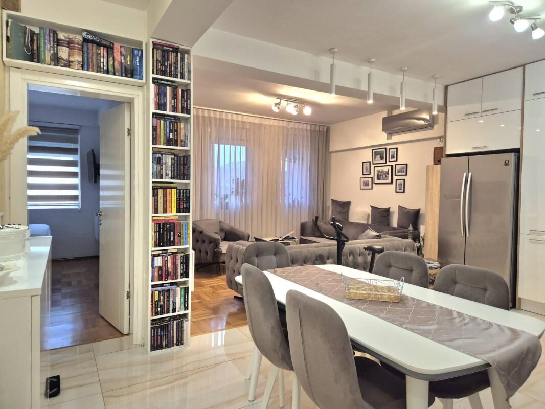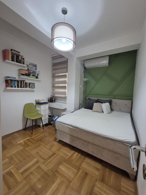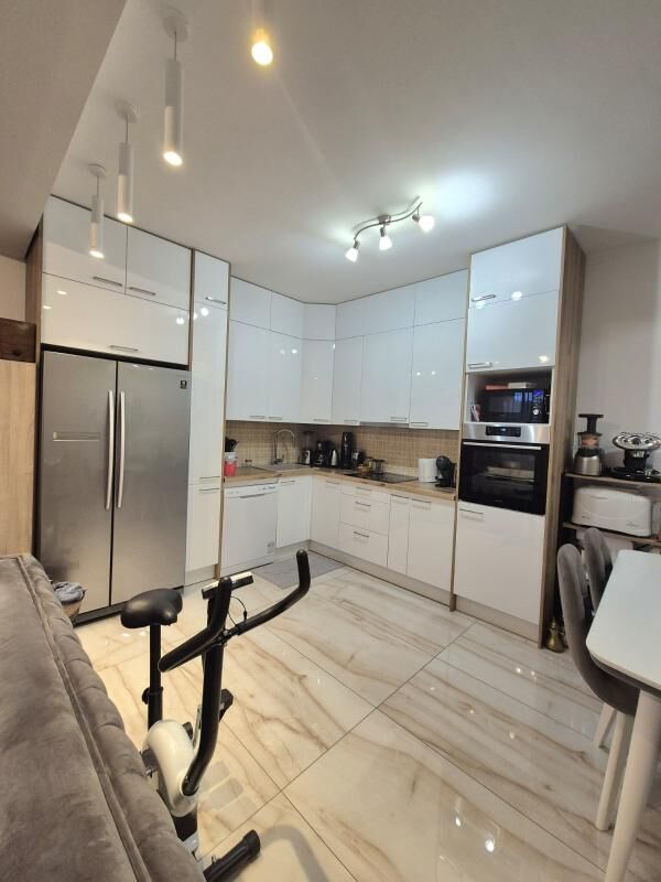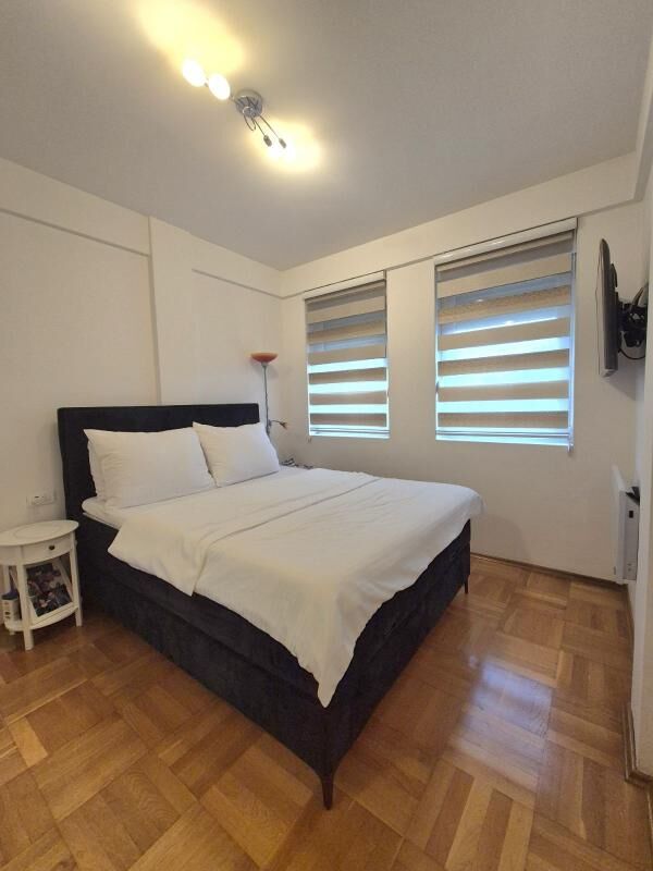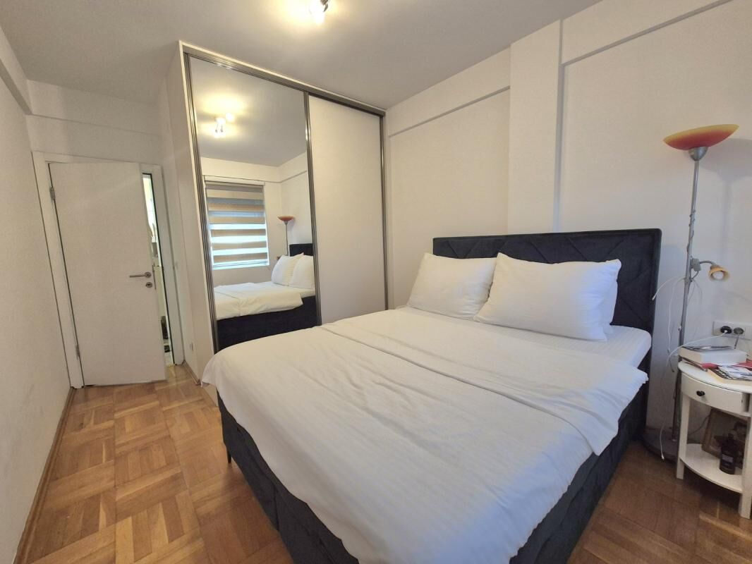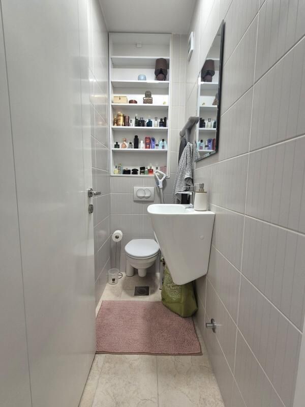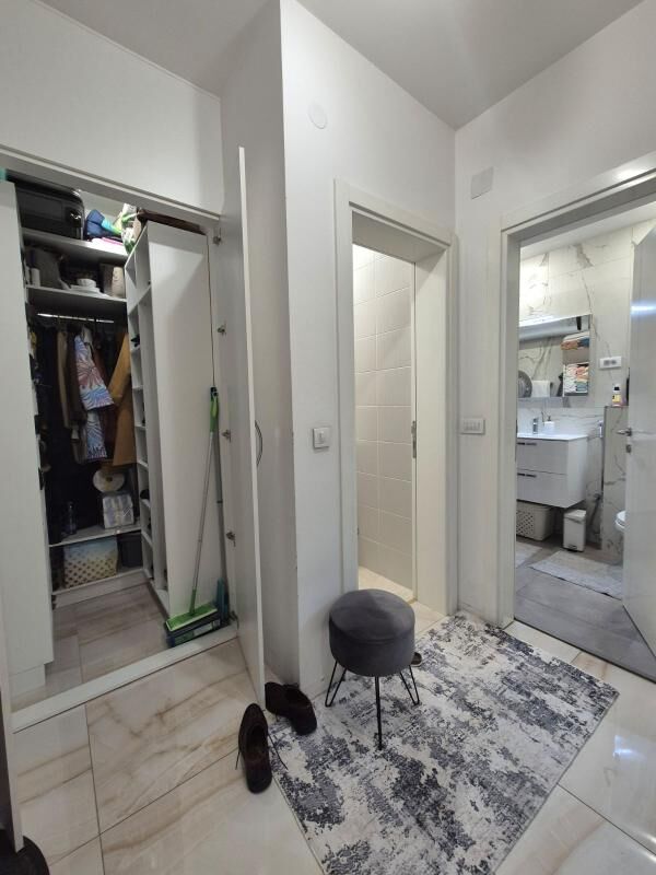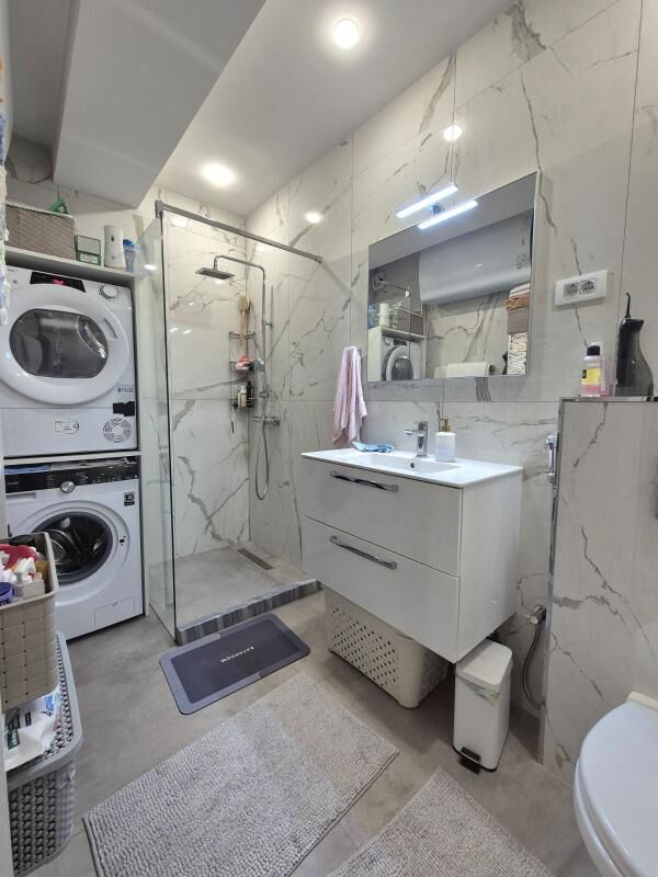 Cozy, fully equipped apartment with an area of 70m2 in a new building with an elevator. The apartment includes: 2 bedrooms, a living room with a kitchen, a bathroom + an additional toilet, a dressing room, a terrace with a view of the mountains. Private parking space. Sold with furniture and household appliances including 2 air conditioners, radiators, washing and drying machines, a dishwasher, etc. The building is located in a quiet and beautiful area, near Kips, other shops, a school, 3 minutes by car to the sea, and 540m to the city center. Documents are in order.