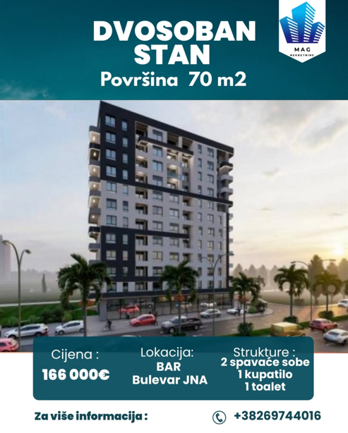 For sale two-bedroom apartment in Bar, Bulevar JNA Area 69.97 m2 The apartment consists of a living room with a kitchen, two bedrooms, a bathroom, a toilet, and a terrace. Northeast oriented. Medium floor level. The building has an elevator. The property is located just a few minutes' walk from the city center. Completion of works is in October 2026. Exempt from tax when purchasing the apartment ✅️ Price 166,000€ +38269744016 #apartmentforsale #montenegro #MagNekretnine