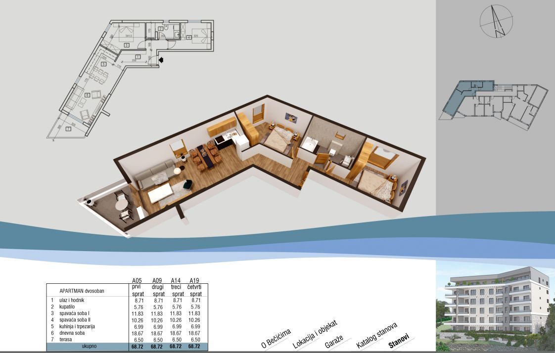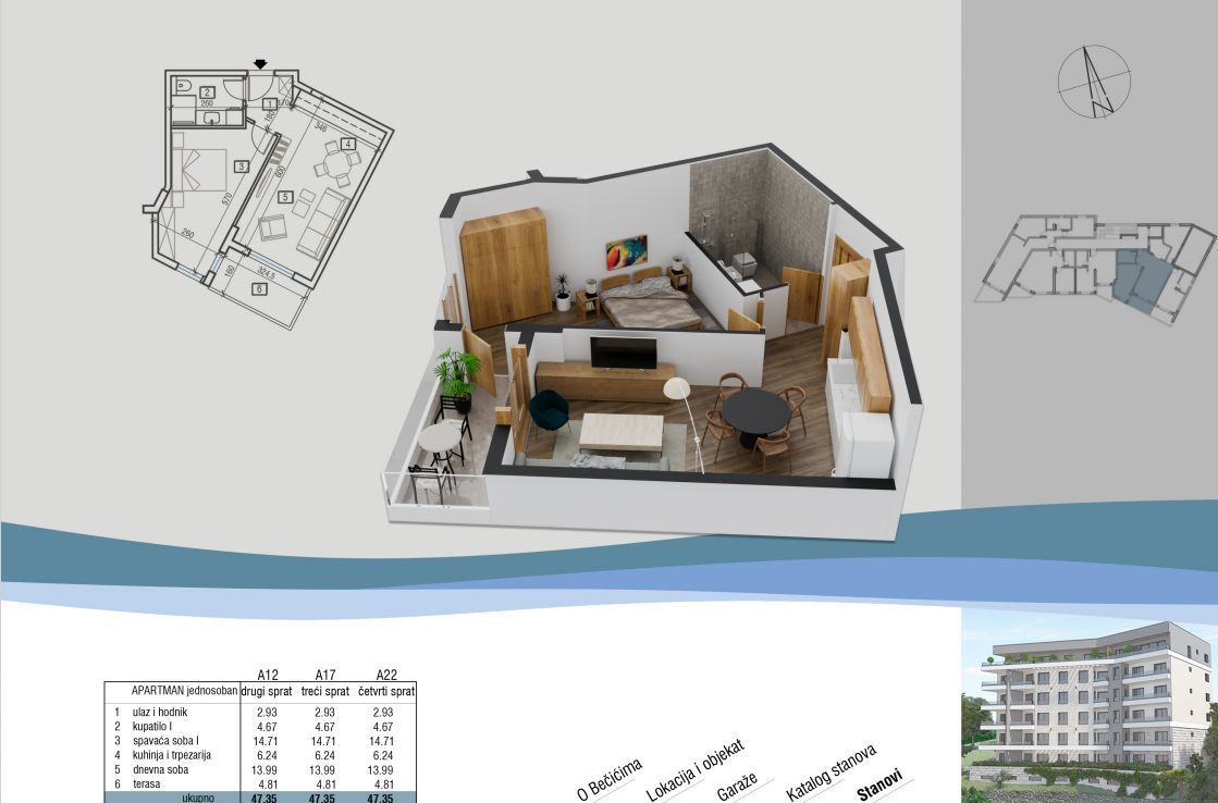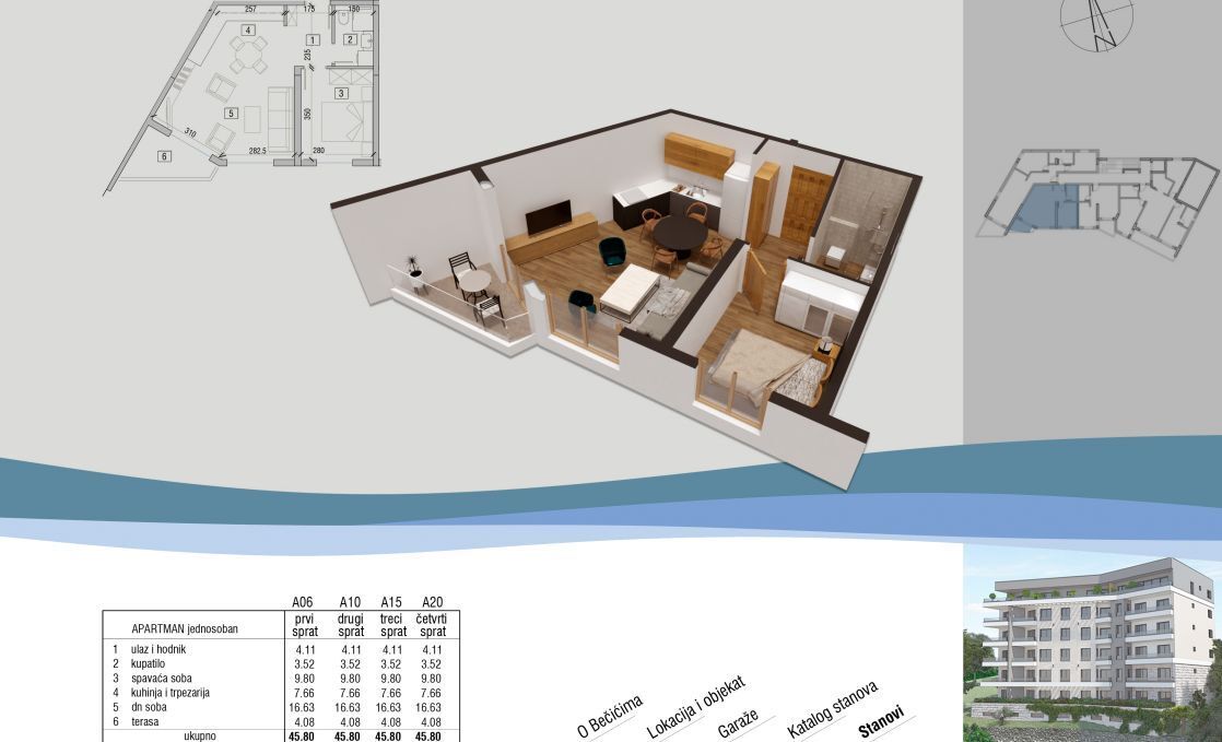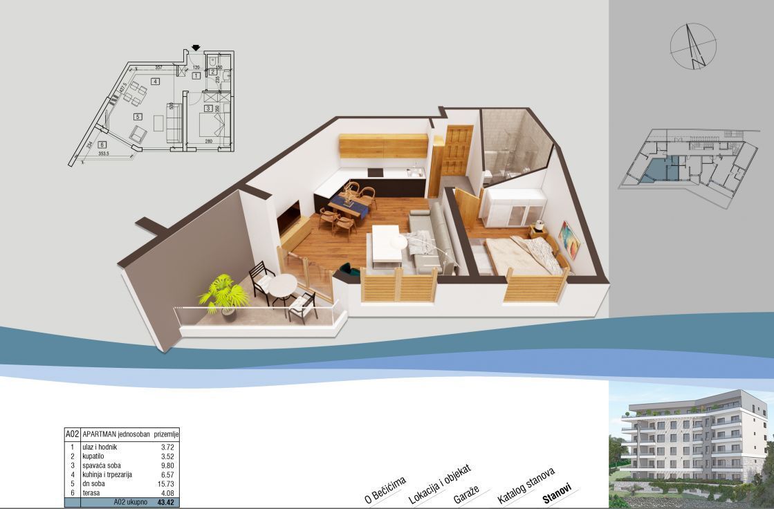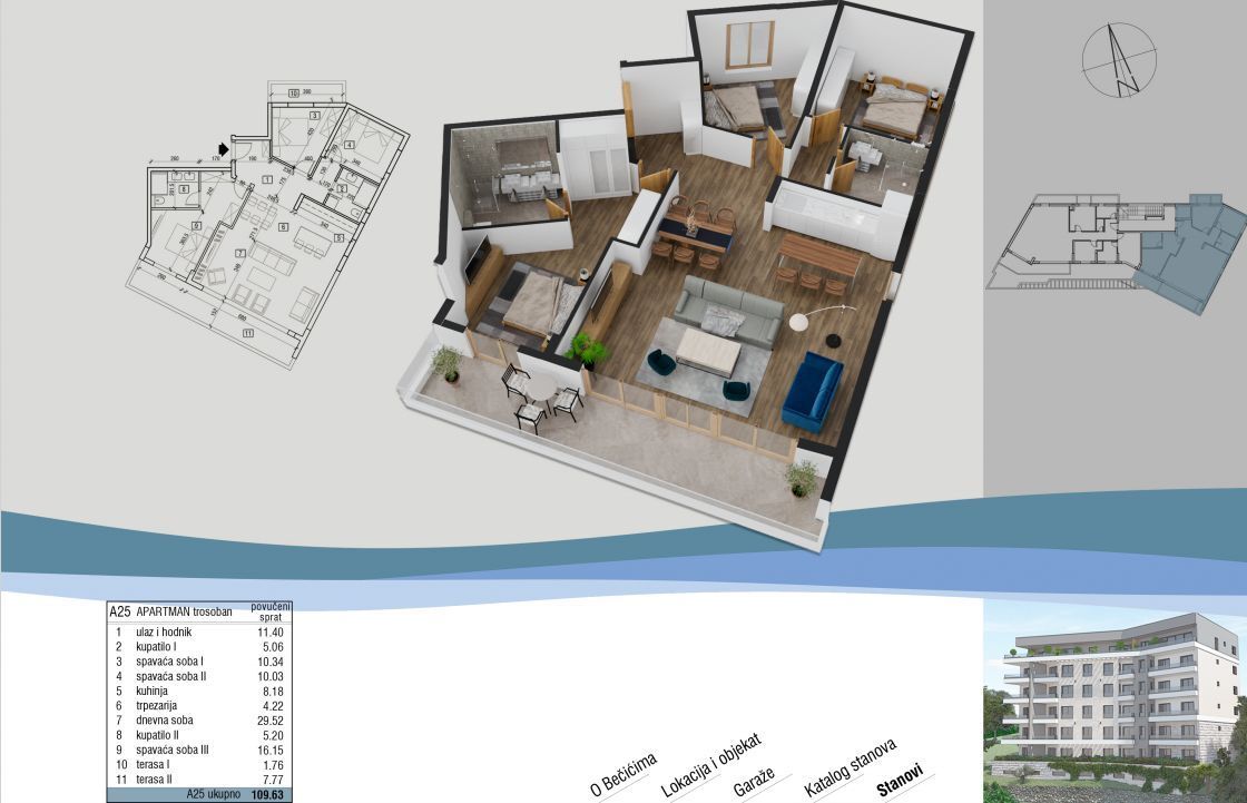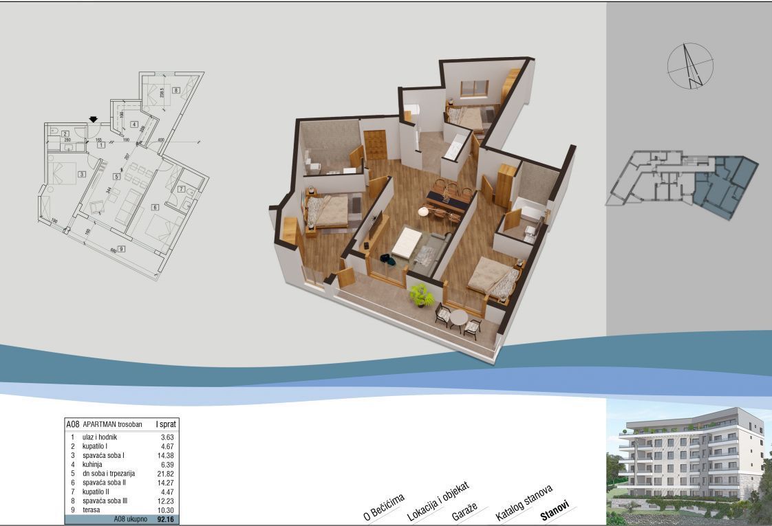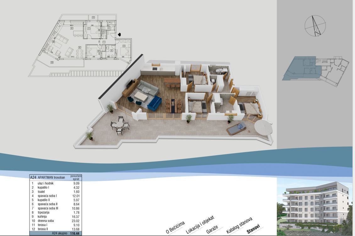 Three-bedroom apartment 92.16 m² with sea view in a new complex under construction – Bečići At an altitude of around 65 meters, just 500 meters from the beautiful Bečići beach, construction will soon begin on a modern residential complex designed for complete enjoyment in a peaceful setting with panoramic views of the Budva Riviera. The complex consists of three buildings, with planned completion by October 1, 2027. All apartments are positioned to offer spectacular sea views thanks to the elevated location above the main road. Available units include various layouts – from studios to three-bedroom apartments, ranging in size from 32 m² to 116 m². Complex features: Two levels of garages and a car lift Spa center and two jacuzzis on the rooftop Only 10 minutes’ walk to the beach Close to restaurants, cafés, post office and supermarket High-quality construction and finishing materials Panoramic view of the Adriatic Sea from every apartment Payment terms: Payment is made in four installments, with the final installment upon handover of the keys. Part of the amount can be paid in cash by agreement. Planned completion date: Two years from the start of construction, scheduled for the end of September 2025. This exclusive complex represents an ideal opportunity for peaceful family living or a secure investment in one of the most sought-after locations on the Montenegrin coast. Possibility to purchase a garage space.