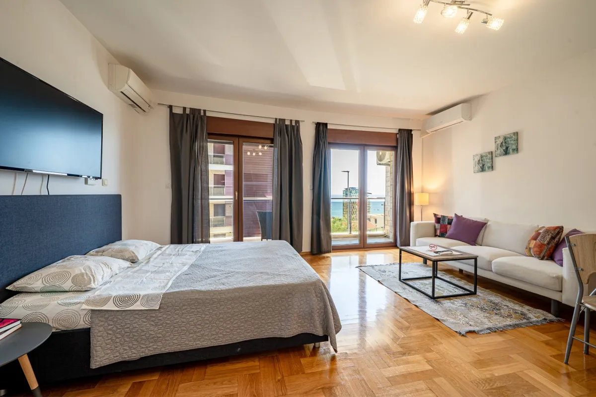 Sale of Bečići No. 7490. A studio is for sale, with an area of 45 m2. Located on the 2nd floor, with an elevator. Partial sea view. Fully equipped with everything necessary. 200 meters to the sea. A parking space can be purchased for an additional fee. Excellent offer for comfortable living or for renting out. No additional investments needed!