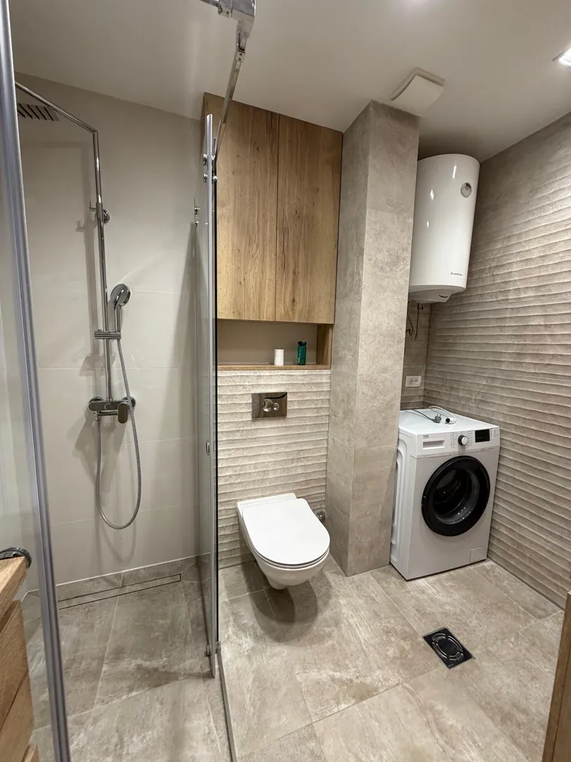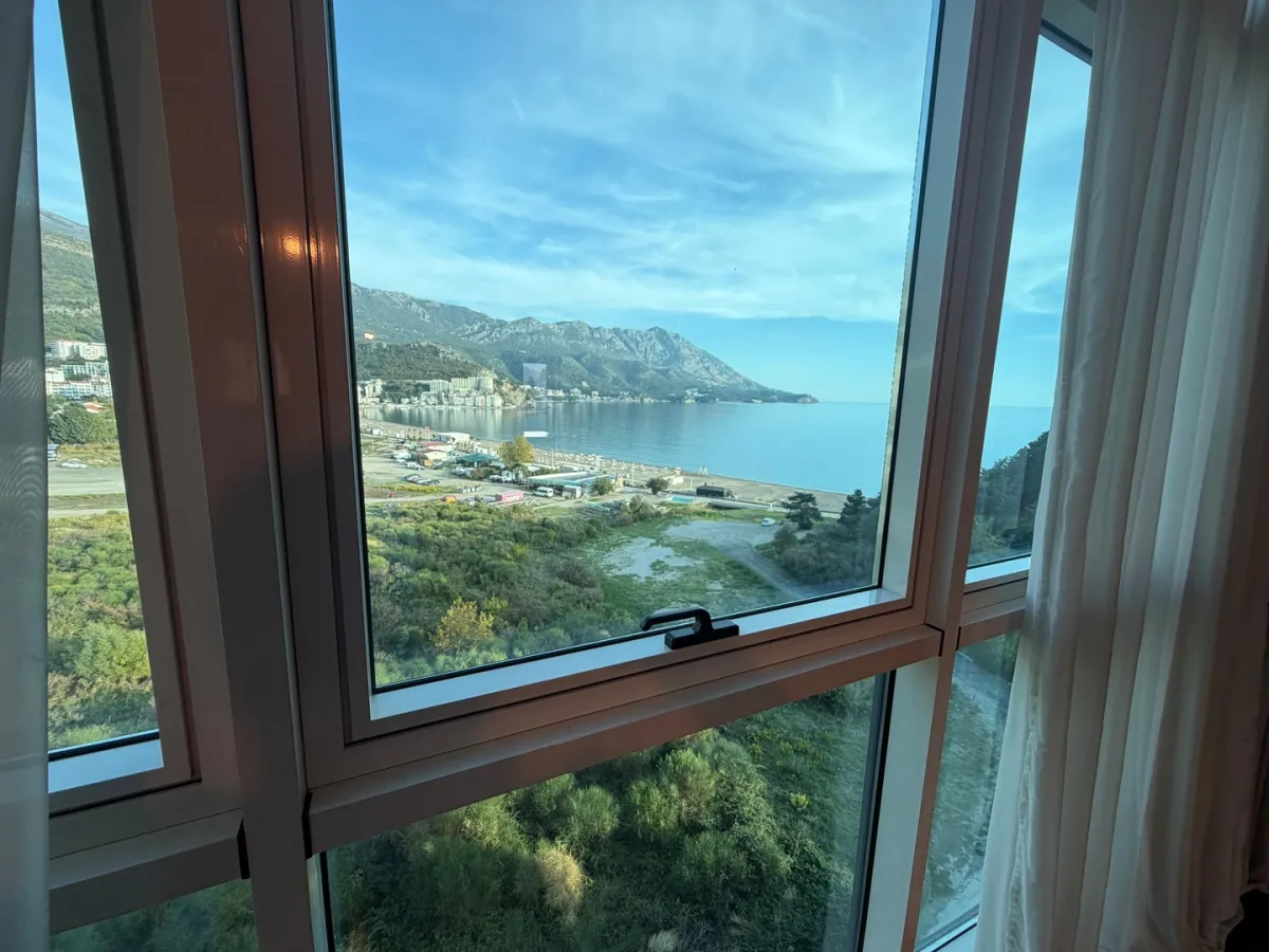 Becici for sale #7563. This seafront apartment is located on the 4th floor of a 6-story building, just 50 meters from the sea, offering stunning views of the beach and park (St. Thomas Church). It offers 89 m², two bedrooms, one bathroom, two terraces, luxury furniture, high-quality appliances, and a modern kitchen. Excellent offer for comfortable living and rentals. No additional investment required!