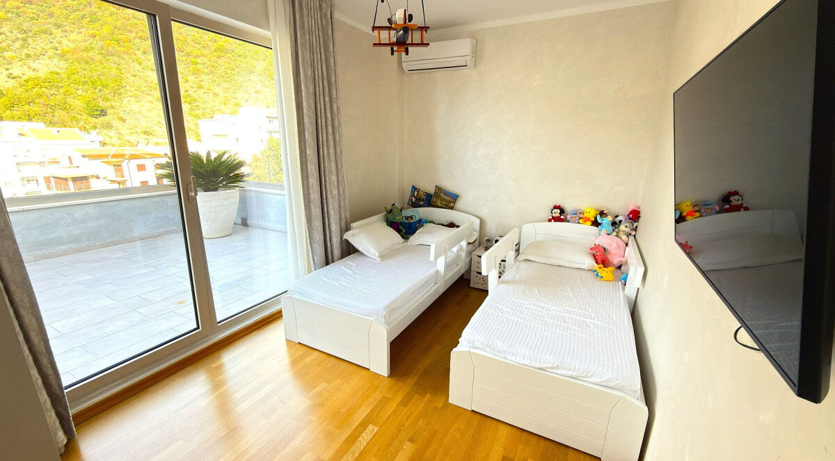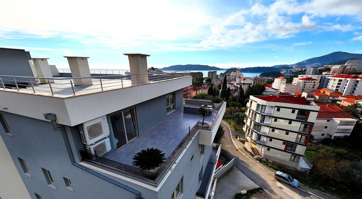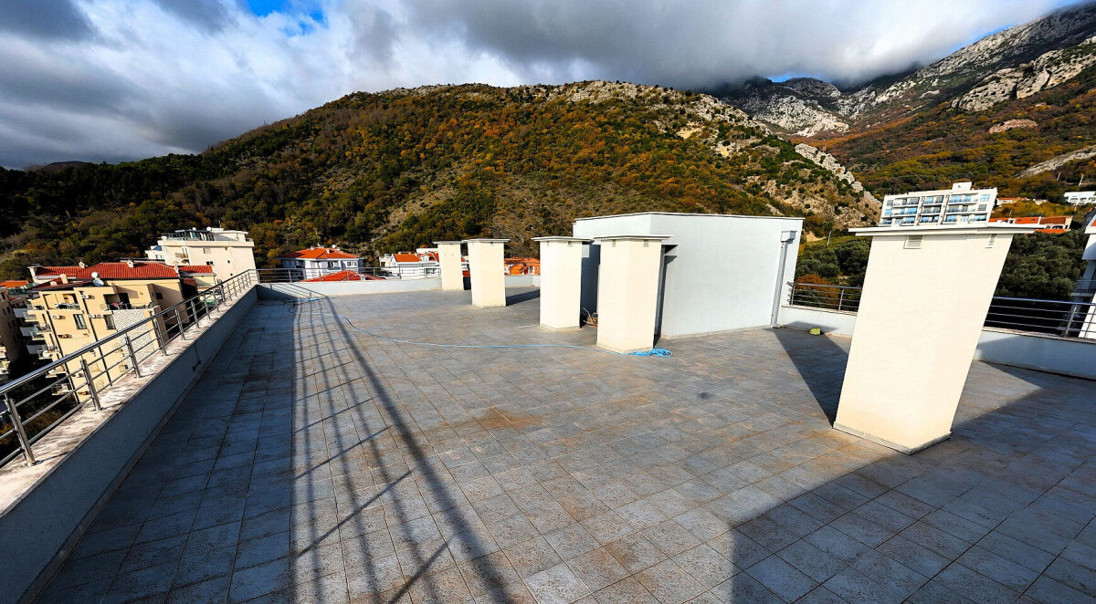 The penthouse consists of two levels, where the first level on the 5th floor occupies 104 m2 of clean interior space and 80 m2 of equipped terrace, while the second level is 279 m2 of roof terrace. The structure consists of: Spacious entrance hall Large open-plan living room with dining area, island and kitchen Master bedroom with large bathroom Children's rooms Office (which can be converted into a bedroom if necessary) Guest bathroom with bathtub Large terraces with furniture (80 m2) Large roof terrace of 279 m2 The penthouse is equipped with the highest quality materials, first-class furniture, built-in elements, lighting, plumbing, as well as a multi-split air conditioning system. There are numerous infrastructure facilities in the immediate vicinity: a large number of restaurants, hotels, football and basketball courts, gyms, spas and fitness centers. The price includes a garage space of 15 m2 and a storage room of 25 m2 in the neighboring building.