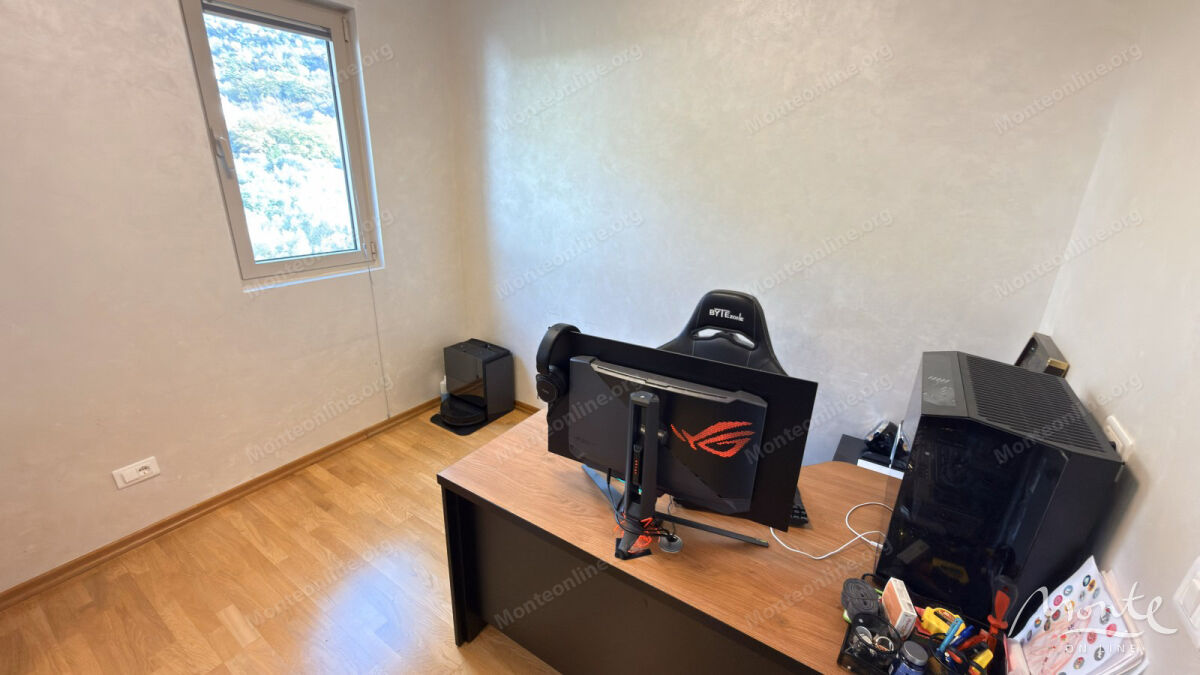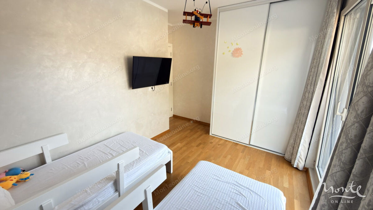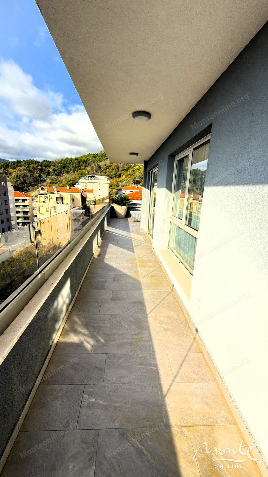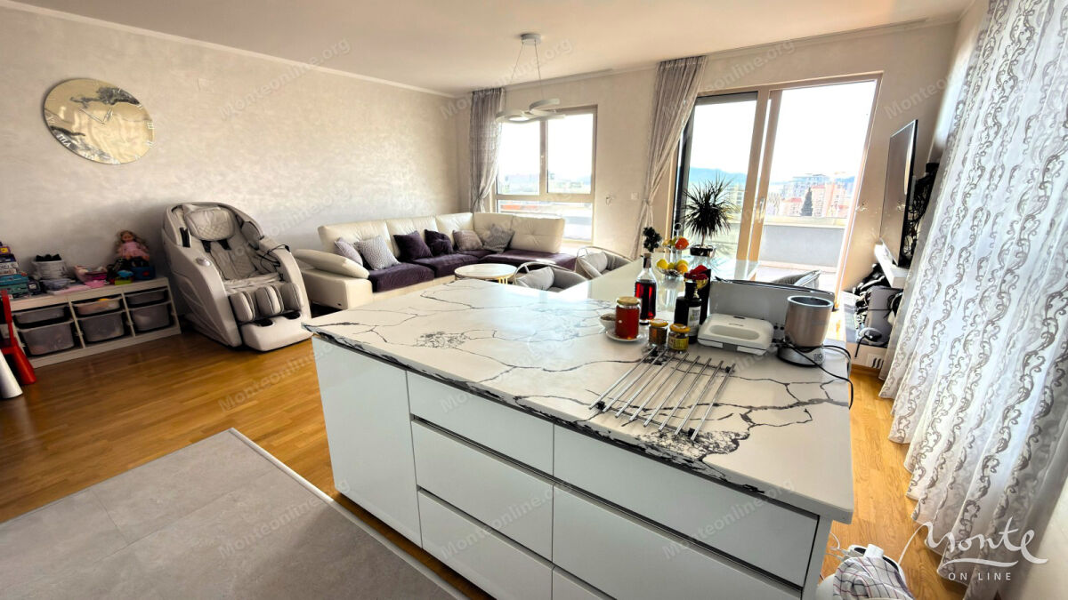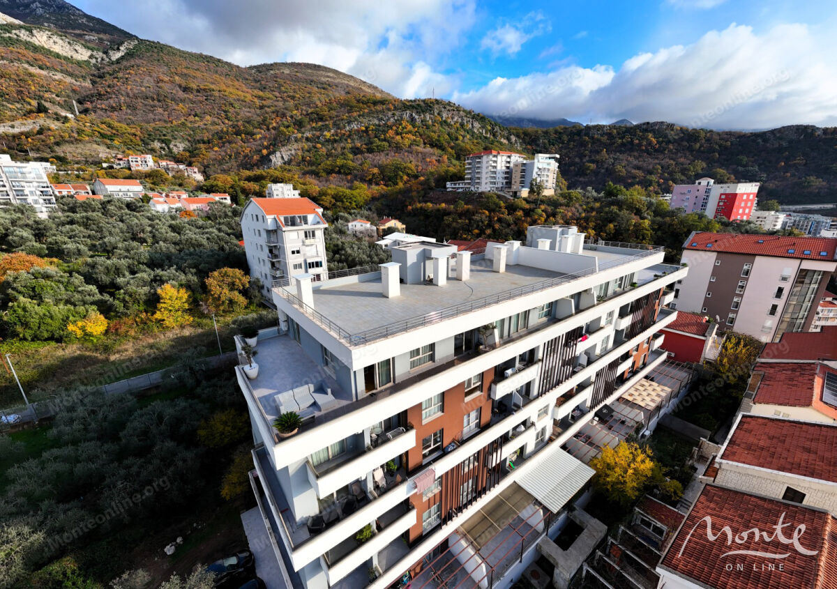 In a new residential building (completed in 2020 and occupied in 2021), a modern, fully equipped apartment with a stunning sea view, a private garage space, and a storage room is for sale. The building is located in Bečići, just 350 meters in a straight line or 500 meters walking distance from the famous Bečići beach. The penthouse consists of two levels, where the first level on the 5th floor occupies 104 m² of net indoor area and 80 m² of furnished terrace, while the second level is a 279 m² rooftop terrace that can be customized in your own style and used as a relaxation area. Structurally, it is a three-room apartment, which consists of: • a spacious hallway; • a large open-plan living room with dining area, island, and kitchen; • a master bedroom with a large bathroom; • a children's room; • an office (which can be converted into a bedroom if necessary); • a guest bathroom with a bathtub; • a large terrace with furniture set (80 m²); • a large rooftop terrace of 279 m². The penthouse is equipped with the highest quality materials, first-class furniture, built-in elements, lighting, plumbing, as well as a multi-split air conditioning system. Under all ceramic surfaces (in two bathrooms and the kitchen), underfloor heating is installed for additional comfort. Excellent room layout and southwest orientation make the apartment bright, with plenty of sunlight throughout the day. From the living room and spacious terrace, there is a sea view stretching from Zavala to Rafailovići, as well as the island of St. Nicholas. In the immediate vicinity of the building, there are numerous infrastructure facilities: a large number of restaurants, hotels, football and basketball courts, gyms, spa and fitness centers. The price of this property also includes a garage space of 15 m² and a storage room of 25 m² in the neighboring building.