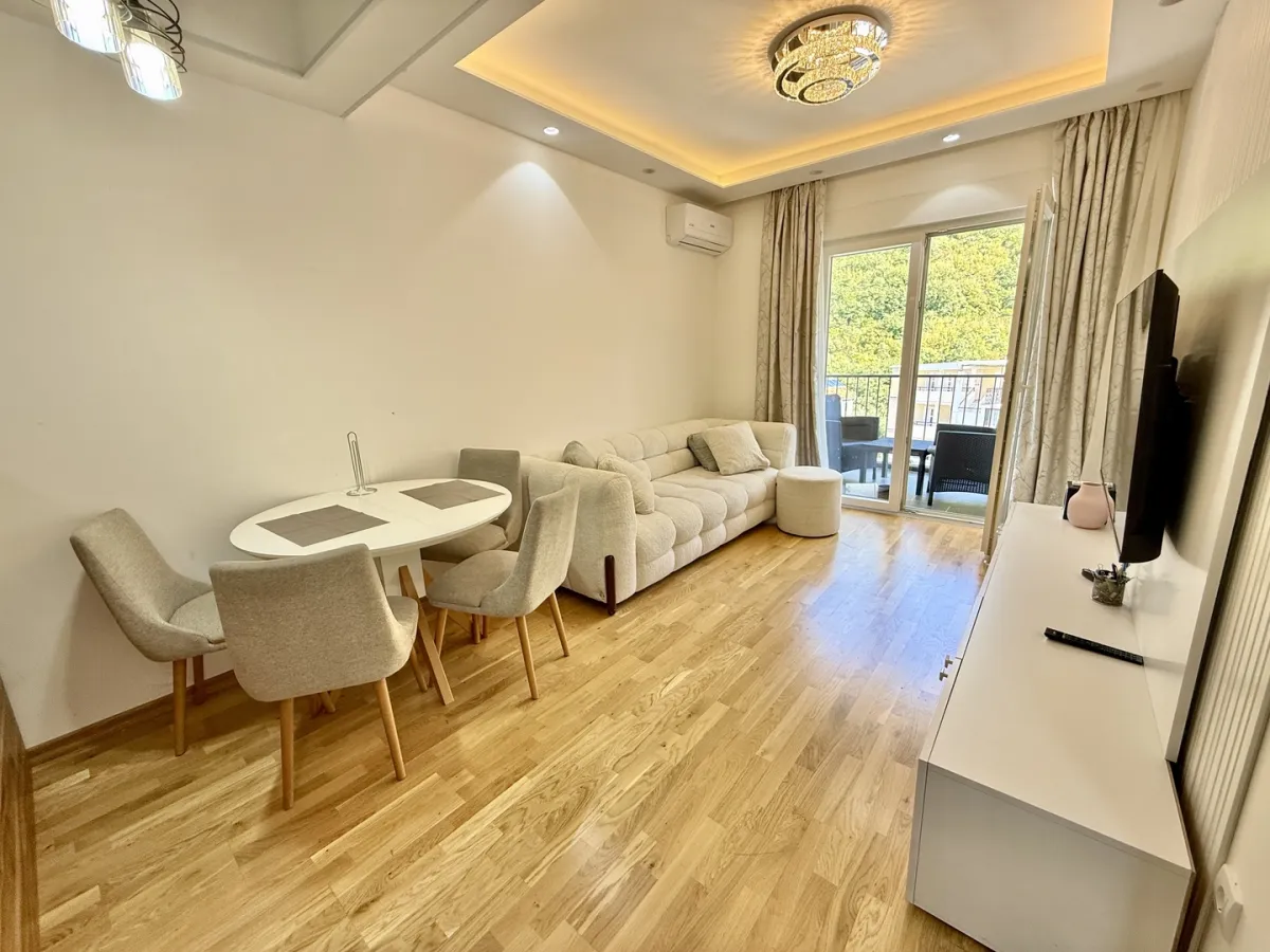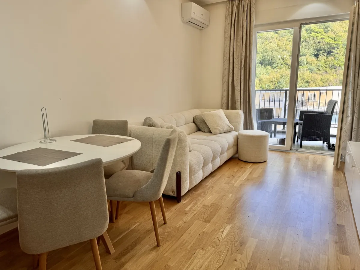 For sale in Budva #7432. One-bedroom apartment, 42 m², 3rd floor, new building with elevator, Podkošljun district. The apartment is fully furnished with new furniture and appliances. The apartment has parquet floors. The terrace offers a partial sea view. The apartment is ready for comfortable occupancy or for renting out. No additional investment required!