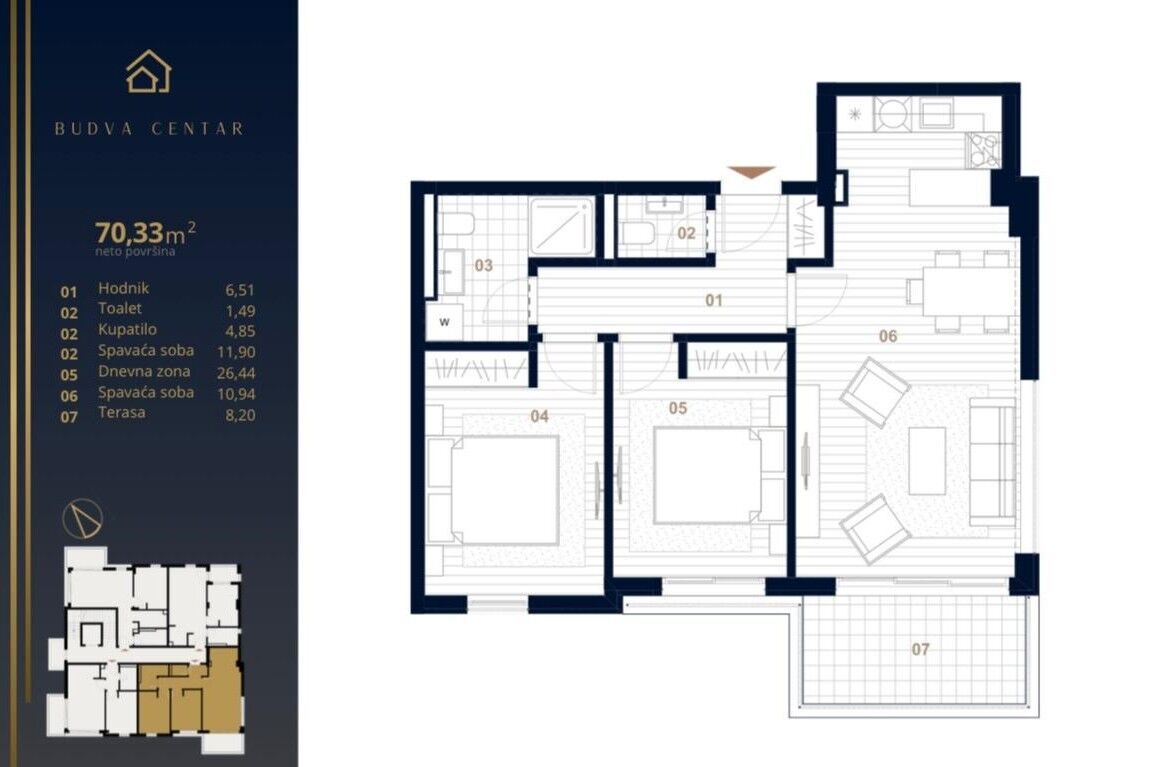 A 71 m² apartment located on the 2nd floor of a 6-storey building is available for purchase. Layout: Entrance hall, spacious living room with a designated kitchen area and access to the terrace, guest toilet, bathroom, and two bedrooms.The apartments are sold with high-quality final finishes, unfurnished.The developer plans to hand over the keys in December 2025.The residential complex includes: underground parking, elevator, and landscaped surroundings. A garage can be purchased separately for €35,000. All infrastructure is within walking distance: supermarkets, central market, shopping malls, school, children’s playgrounds, medical facilities, beauty salons, pharmacies, government institutions, beaches and promenade. The main attraction of the Budva Riviera—the Old Town and the stunning Mogren Beach with crystal-clear water—is also nearby. No property tax is payable upon purchase. Also available for sale: а ground floor apartment of 64 m² and ground floor apartment of 70 m²