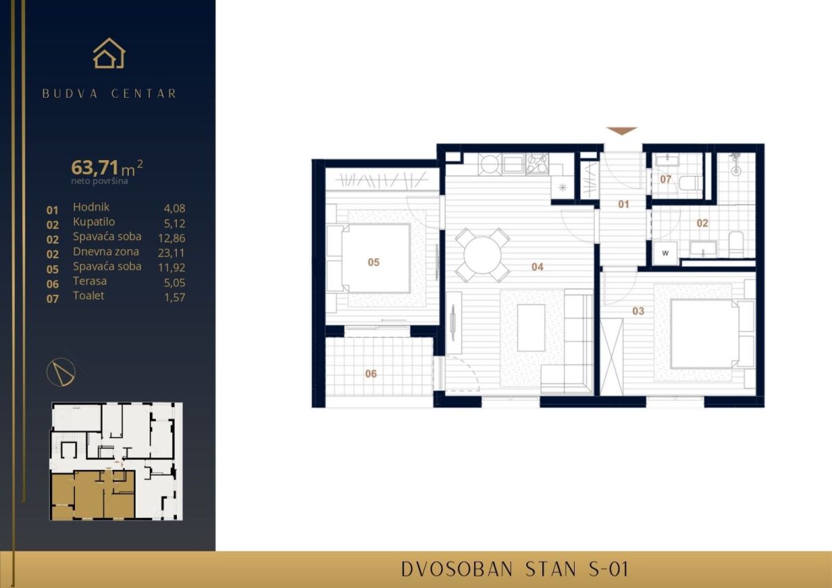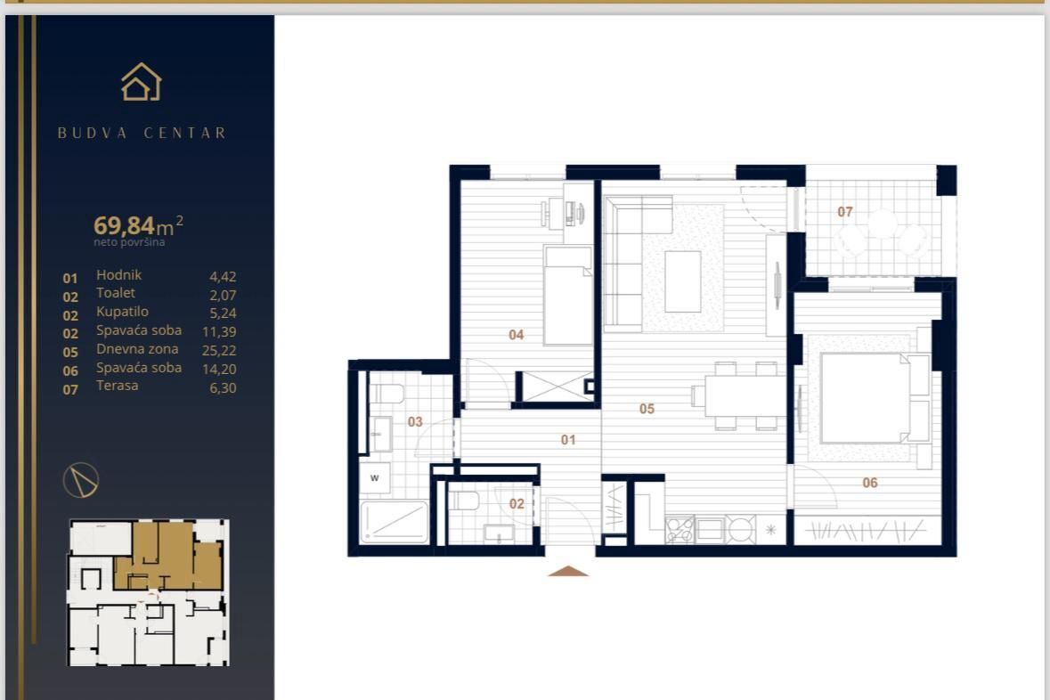 For sale: a two-bedroom apartment of 69.84 m² in a new residential building in the center of Budva. In the very center of Budva, just a few steps from the Old Town, we present a new residential complex. The investors behind this project have extensive experience, and the building will consist of a ground floor and four floors, with a total of 19 units. The apartments include one-bedroom and two-bedroom layouts, ranging from 46 m² to 72 m². Construction completion is planned by the end of 2025. Don't miss the opportunity to become part of this exclusive residential complex in the heart of Budva.