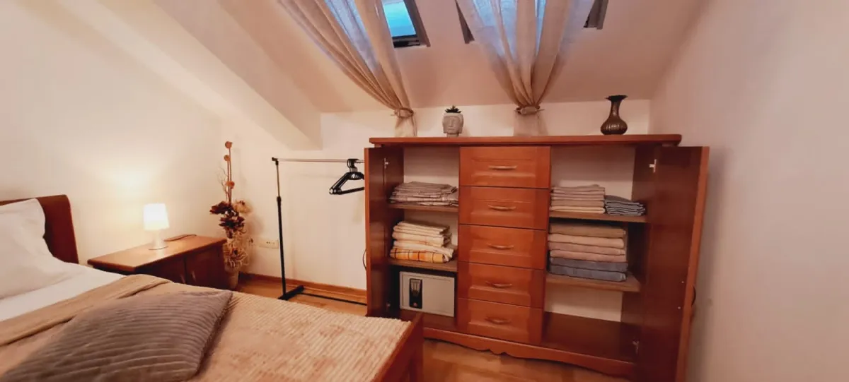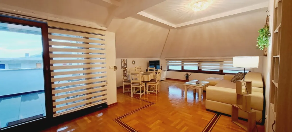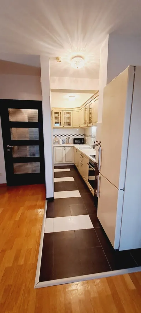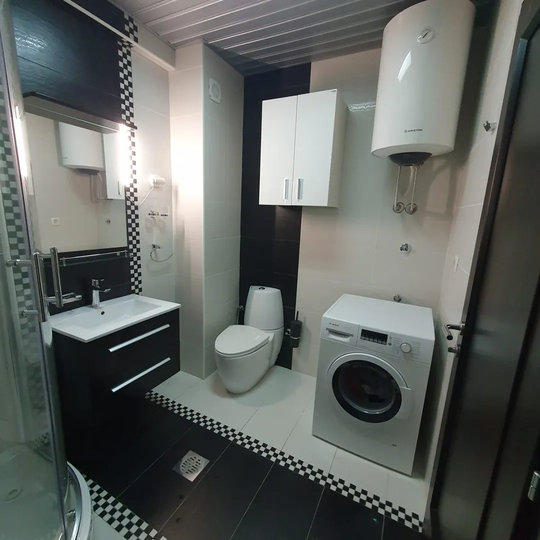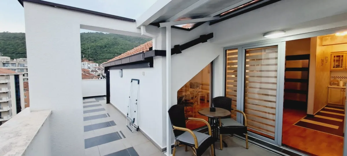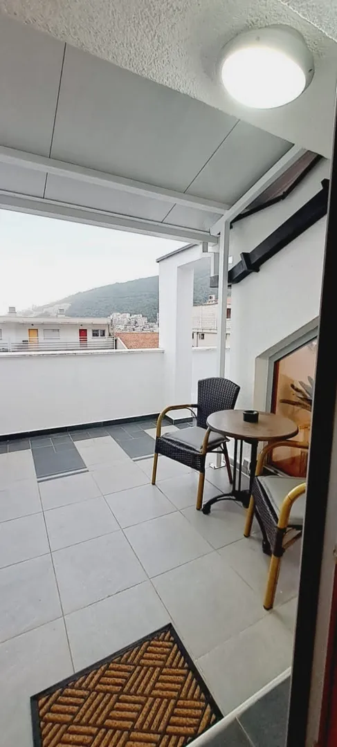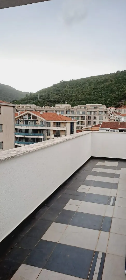 Budva, #7642 for sale. Apartment in the building where the CUNGU store is located. 7th floor — gated (private), elevator access with a special chip. The building boasts high construction standards and high-quality materials. The entrance features a reception, security, and video surveillance. Area: 108 m², 2 bedrooms, living room, kitchen, large terrace, bathroom with shower. Fully furnished and equipped with appliances: Bosch washing machine, Liebherr refrigerator, Gorenje cooktop, oven, dishwasher, 2 air conditioners (in the living room and bedroom) + a fan in the other bedroom. Everything for a comfortable stay or for renting out.