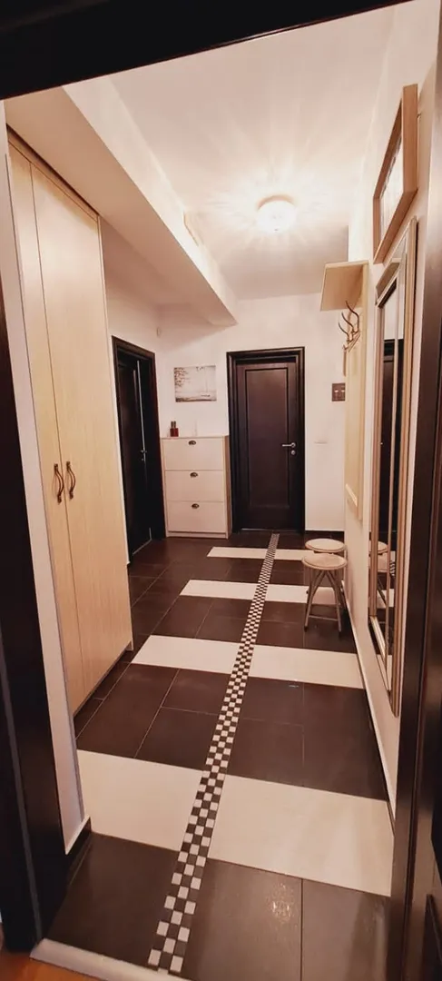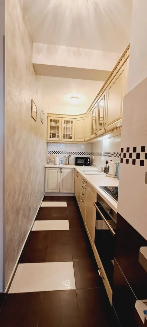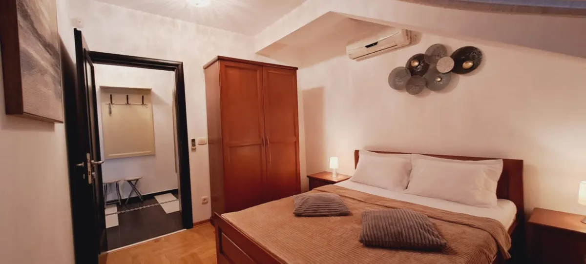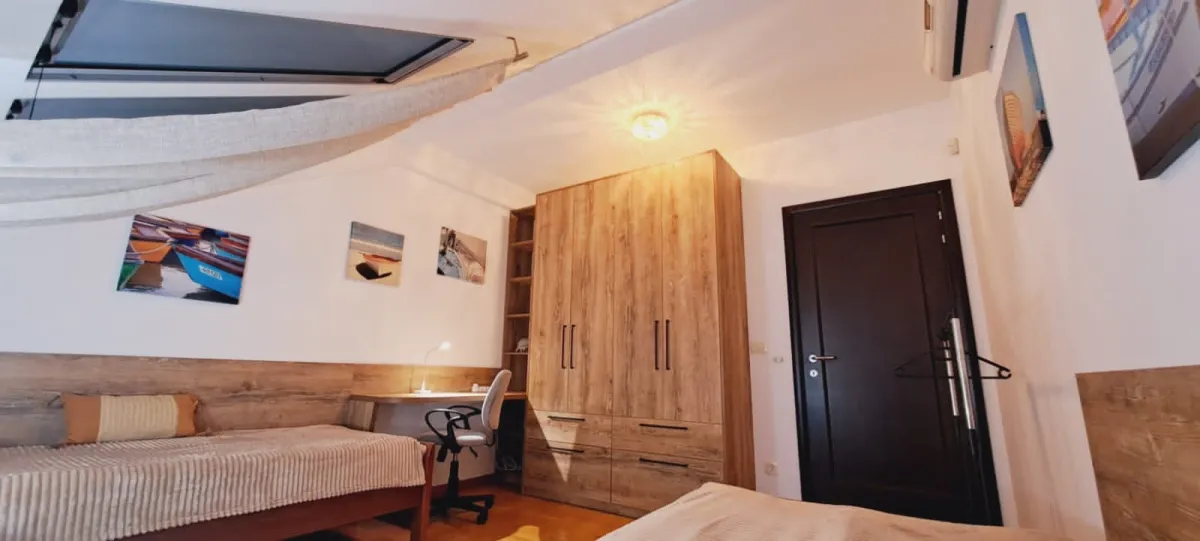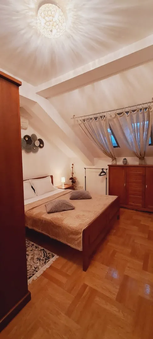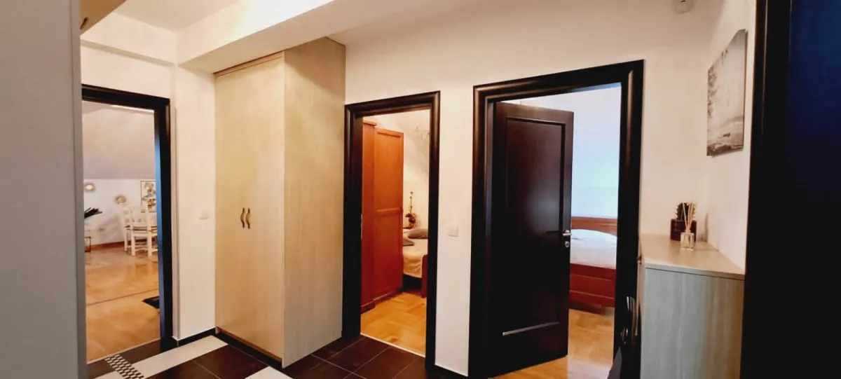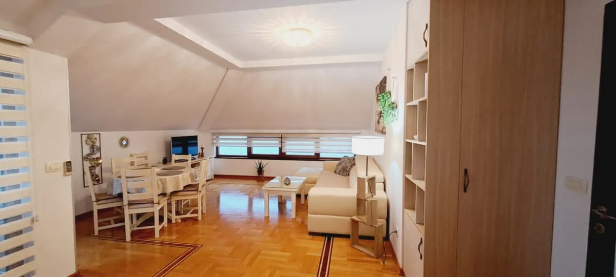 Budva, #7642 for sale. Apartment in the building where the CUNGU store is located. 7th floor — gated (private), elevator access with a special chip. The building boasts high construction standards and high-quality materials. The entrance features a reception, security, and video surveillance. Area: 108 m², 2 bedrooms, living room, kitchen, large terrace, bathroom with shower. Fully furnished and equipped with appliances: Bosch washing machine, Liebherr refrigerator, Gorenje cooktop, oven, dishwasher, 2 air conditioners (in the living room and bedroom) + a fan in the other bedroom. Everything for a comfortable stay or for renting out.