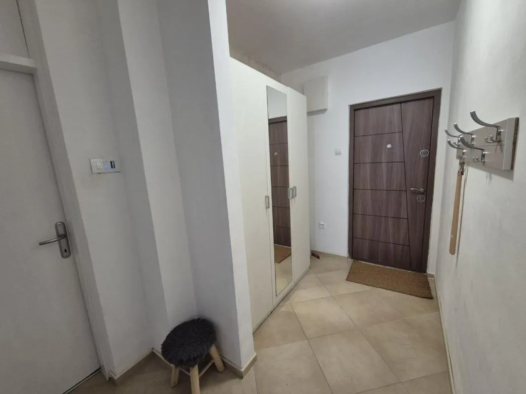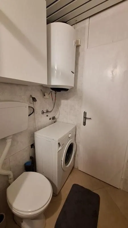 Petrovac for sale #7434. This cozy 2-bedroom apartment is located on the 1st Montenegrin floor (2nd) in a 4-story building. It features a comfortable entrance hall with a storage closet, a living room with a large fold-out sofa with air conditioning, a new kitchen with a dishwasher, a dressing room or study area, one bedroom with a double bed and a wardrobe, and a second bedroom with a bunk bed, a desk, and a wardrobe. It overlooks a quiet green courtyard and has a small sea view. The total area is 60 m2 (37 m2 + a closed terrace converted into a separate bedroom). The distance to the sea with a sandy beach is 650 meters. The bus station is a 2-minute walk. Shops, restaurants, cafes, and bakeries are a 5-7-minute walk away. Enclosed green courtyard with a recreation area. Public parking is available near the building (there are always spaces). Good rental potential.