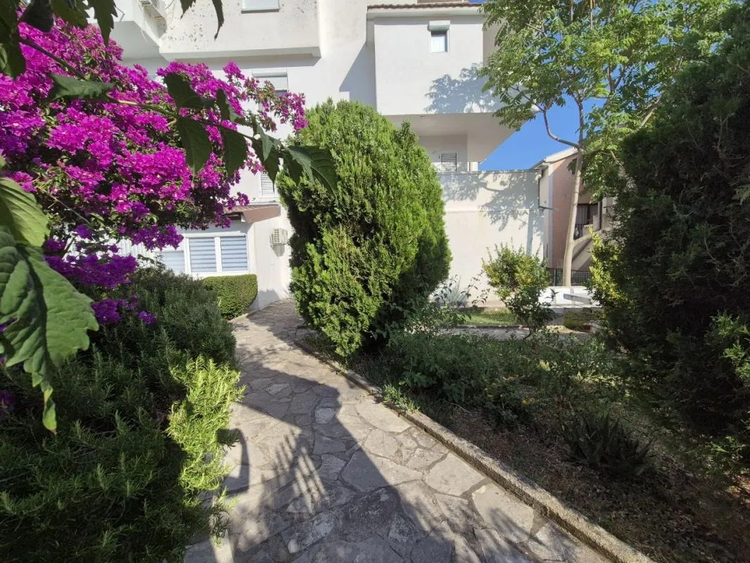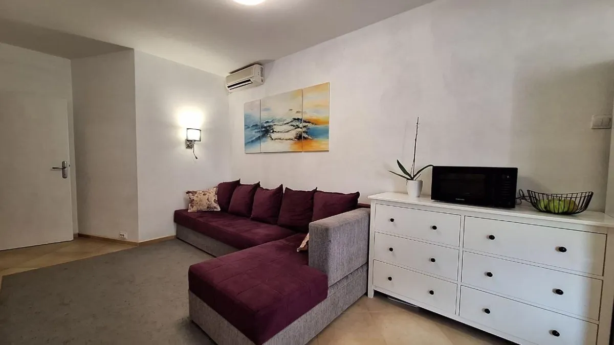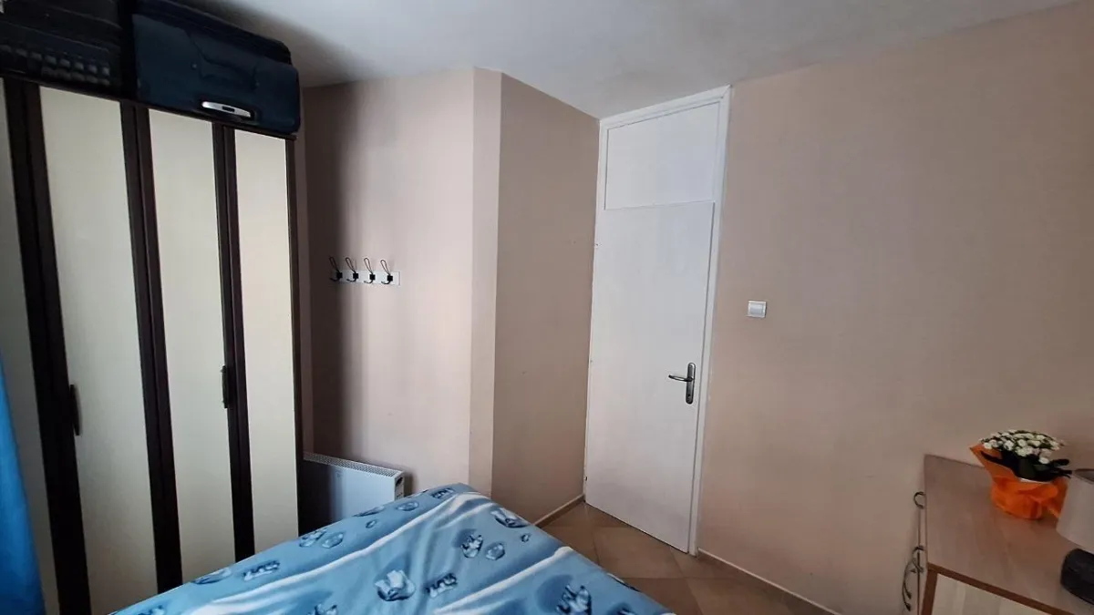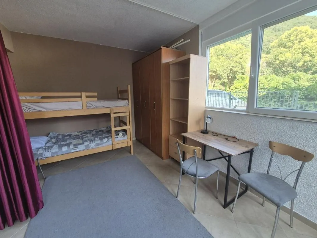 Petrovac for sale #7434. This cozy 2-bedroom apartment is located on the 1st Montenegrin floor (2nd) in a 4-story building. It features a comfortable entrance hall with a storage closet, a living room with a large fold-out sofa with air conditioning, a new kitchen with a dishwasher, a dressing room or study area, one bedroom with a double bed and a wardrobe, and a second bedroom with a bunk bed, a desk, and a wardrobe. It overlooks a quiet green courtyard and has a small sea view. The total area is 60 m2 (37 m2 + a closed terrace converted into a separate bedroom). The distance to the sea with a sandy beach is 650 meters. The bus station is a 2-minute walk. Shops, restaurants, cafes, and bakeries are a 5-7-minute walk away. Enclosed green courtyard with a recreation area. Public parking is available near the building (there are always spaces). Good rental potential.