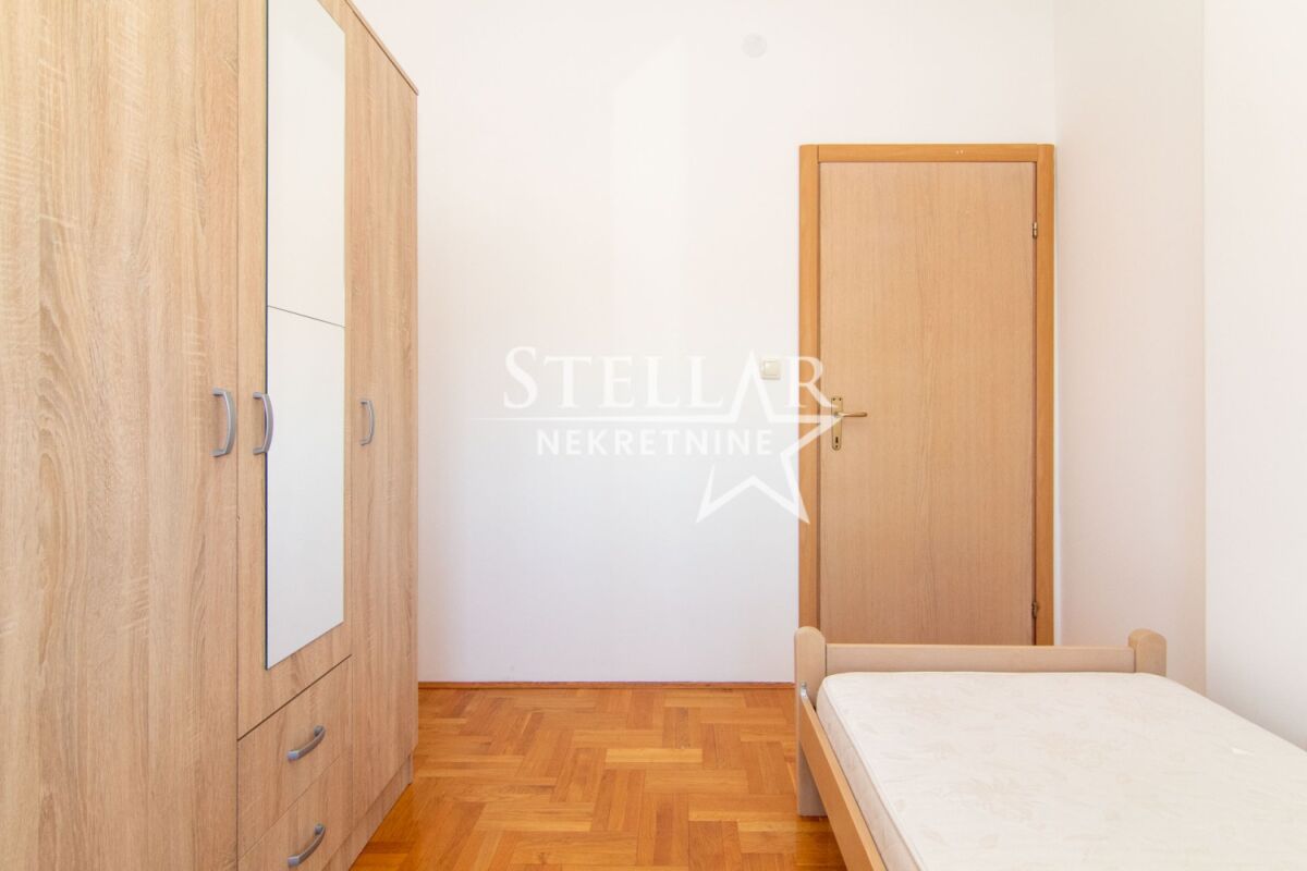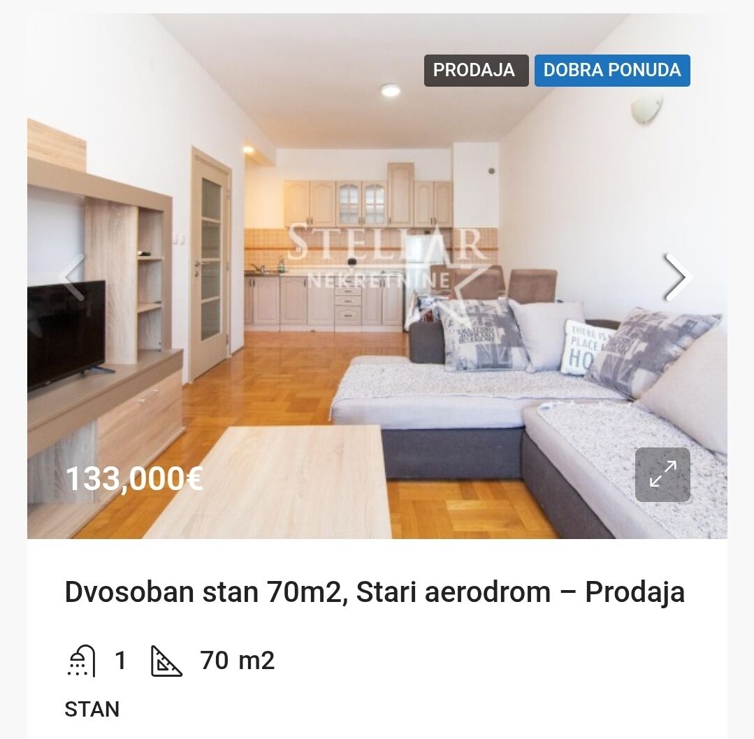 Prodaje se lijepo opremljen dvosoban stan na 6. spratu (poslednjem) u stambenoj zgradi na Starom Aerodromu. Stan ima 70m2, ima jako dobar raspored – obije spavaće sobe i dnevna soba imaju izlaz na balkon istočne orijentacije. Balkon je baš prostran, dug je 9m a širok 1.50m. Kuhinja, dnevna soba i trpezarija čine jednu veliku prostoriju, a pored kuhinje je i ostava. Hodnik je komotan i komunicira sa svim sobama, kao i sa kuhinjom i kupatilom. Zgrada je stara 12 godina i na dobroj je lokaciji – gornji dio bulevara Pera Ćetkovića kod manjeg kružnog toka. Krov je kvalitetno urađen, limeni. Stan djeluje kao da nema nikakvih problema sa vlagom i vlaženjem. Stan je idealan za višečlanu porodicu, u blizini su sve neophodne radnje, prodavnice, restorani, škole, vrtići, fudbalski stadion, igrališta, pekare itd. Zgrada ima lift, a ispred zgrade je veliki javni parking. ID nekretnine M512 +382 69 166 448