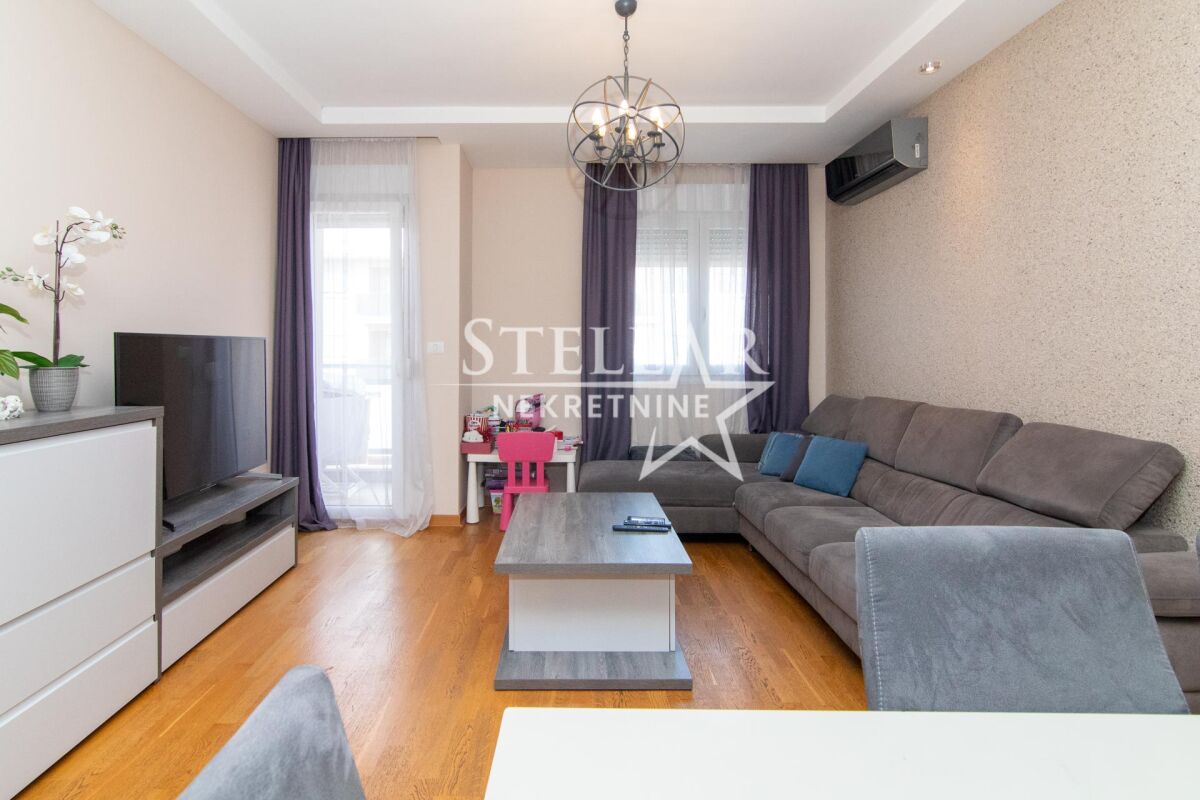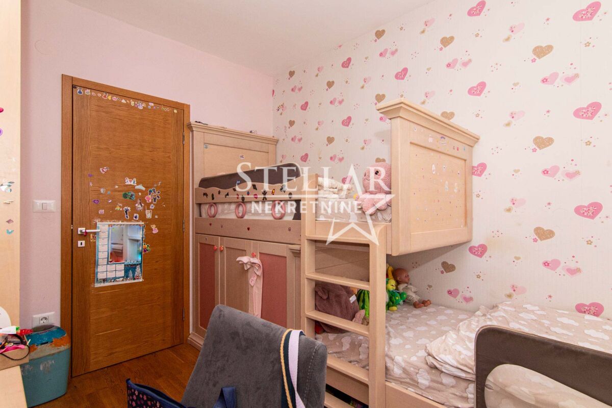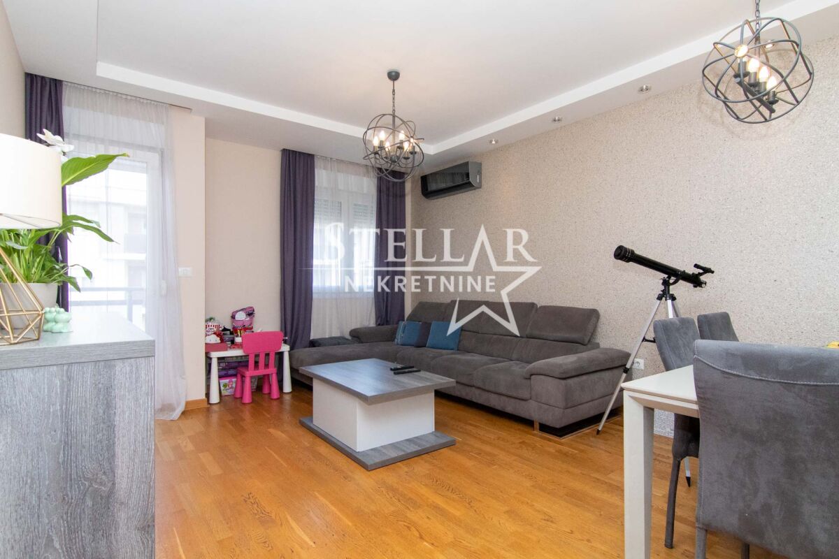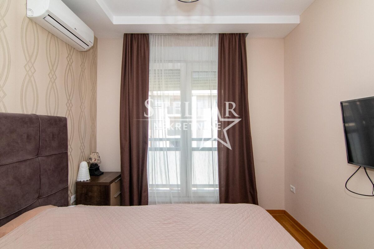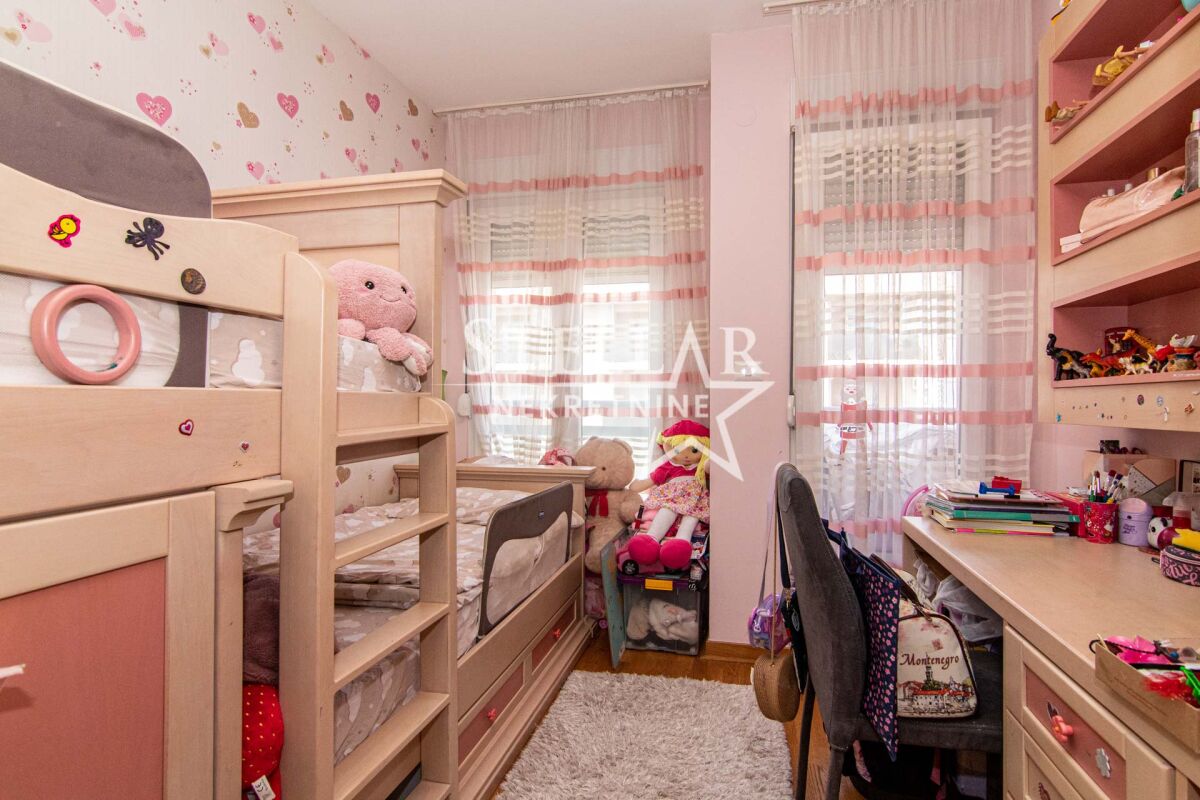 A beautiful, modern, and well-equipped two-bedroom apartment is for sale on the 6th floor (not the top) of a residential building in the Siti neighborhood. The apartment has an area of 64m2, with a southern orientation and a balcony that connects to the living room and a smaller bedroom. The apartment is air-conditioned with a split system that has 3 indoor units, one in each room. The living room, dining area, and kitchen form one large space. The kitchen is built-in, made of solid wood, and has a large refrigerator, a dishwasher, and a bar. In the larger bedroom, there is a French bed, a double wardrobe, and a French balcony, as well as a TV. In the smaller bedroom, there are 2 bunk beds (cascading), as well as a larger wardrobe. The children's room is made of solid wood. In the hallway, there is a shoe cabinet, and in addition, the apartment has a wardrobe with a sliding double wardrobe. Property ID B55 +382 67 166 448
