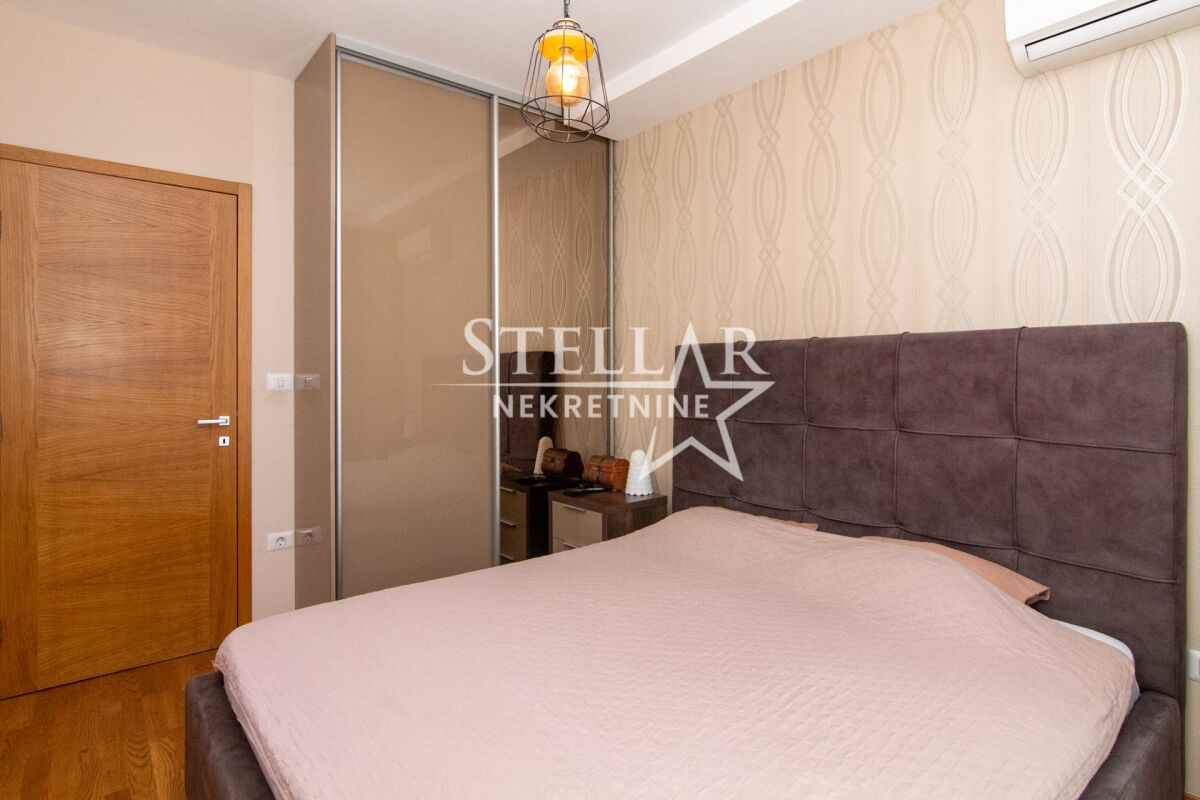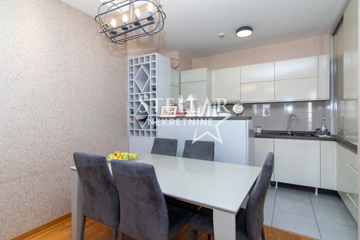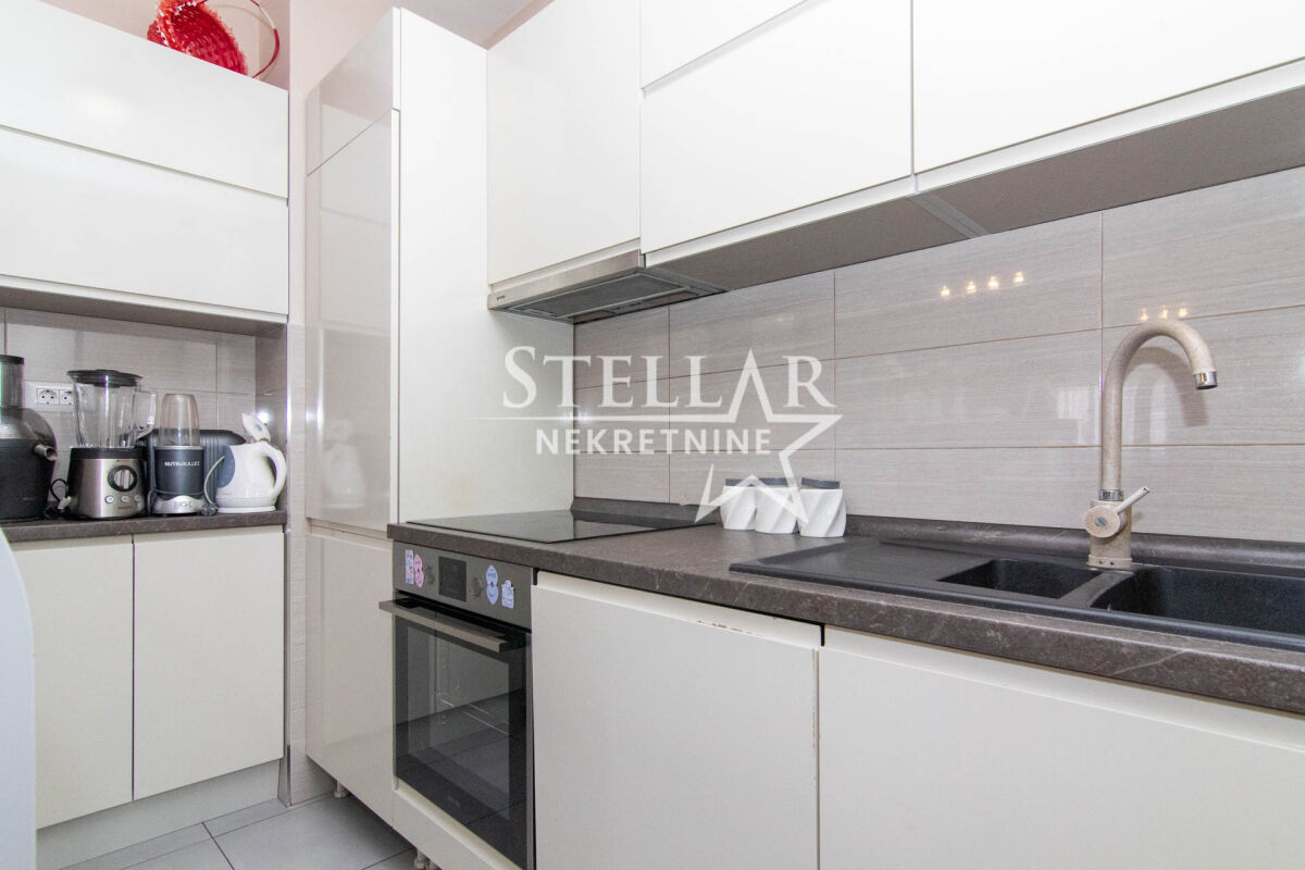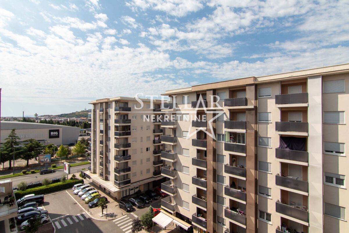 A beautiful, modern, and well-equipped two-bedroom apartment is for sale on the 6th floor (not the top) of a residential building in the Siti neighborhood. The apartment has an area of 64m2, with a southern orientation and a balcony that connects to the living room and a smaller bedroom. The apartment is air-conditioned with a split system that has 3 indoor units, one in each room. The living room, dining area, and kitchen form one large space. The kitchen is built-in, made of solid wood, and has a large refrigerator, a dishwasher, and a bar. In the larger bedroom, there is a French bed, a double wardrobe, and a French balcony, as well as a TV. In the smaller bedroom, there are 2 bunk beds (cascading), as well as a larger wardrobe. The children's room is made of solid wood. In the hallway, there is a shoe cabinet, and in addition, the apartment has a wardrobe with a sliding double wardrobe. Property ID B55 +382 67 166 448