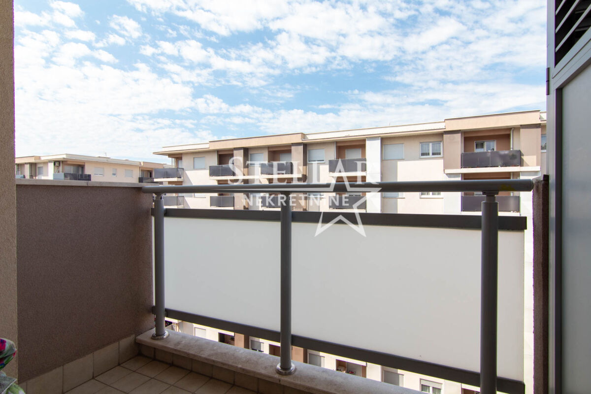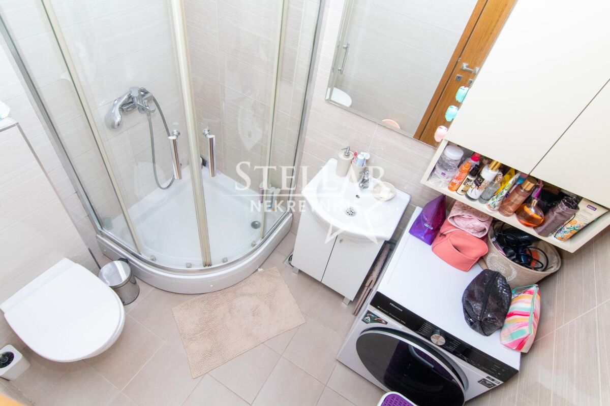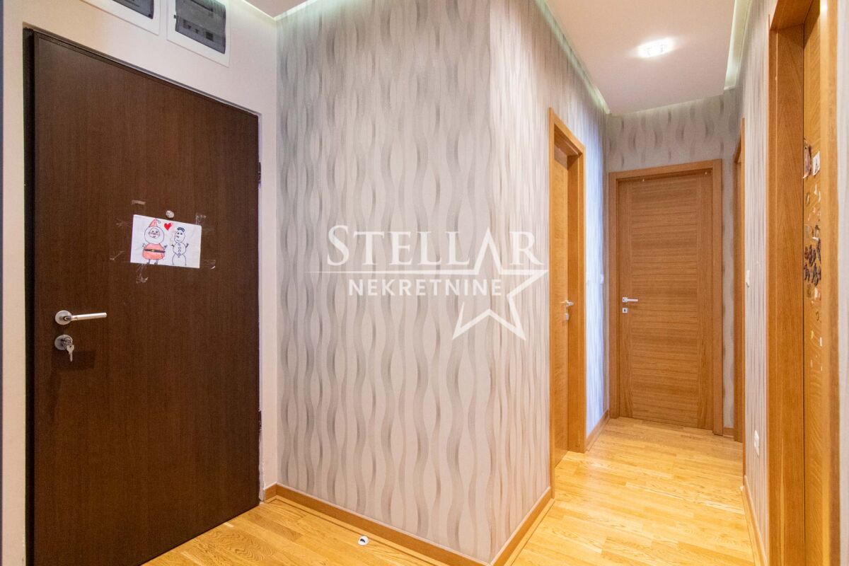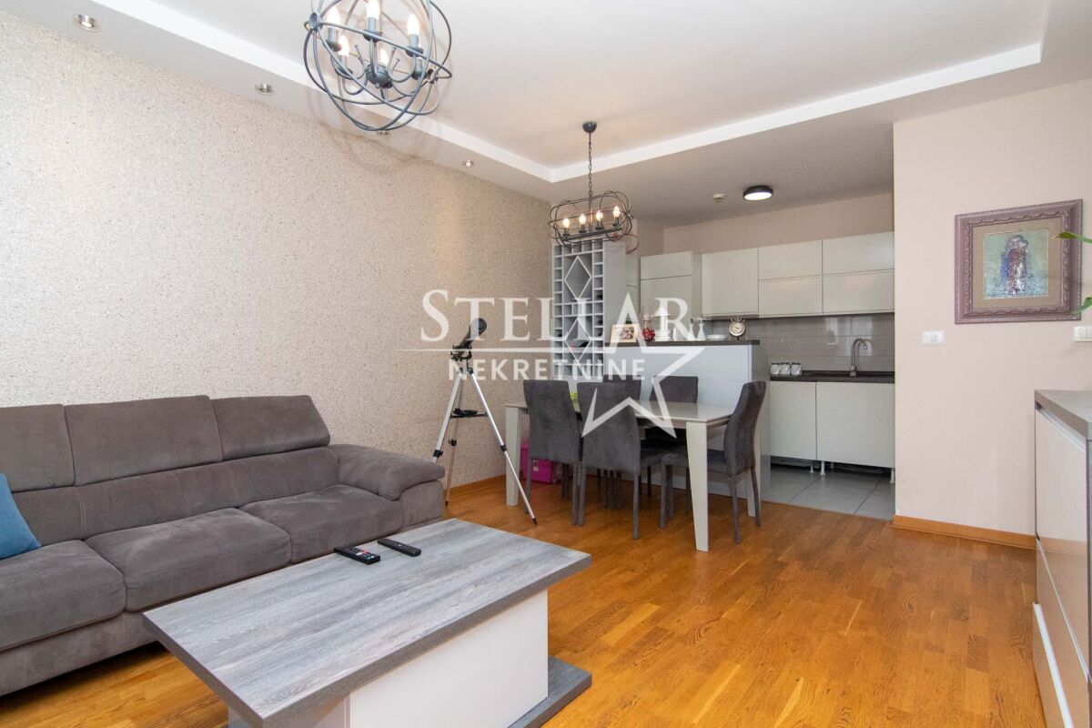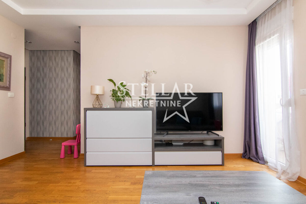 A beautiful, modern, and well-equipped two-bedroom apartment is for sale on the 6th floor (not the top) of a residential building in the Siti neighborhood. The apartment has an area of 64m2, with a southern orientation and a balcony that connects to the living room and a smaller bedroom. The apartment is air-conditioned with a split system that has 3 indoor units, one in each room. The living room, dining area, and kitchen form one large space. The kitchen is built-in, made of solid wood, and has a large refrigerator, a dishwasher, and a bar. In the larger bedroom, there is a French bed, a double wardrobe, and a French balcony, as well as a TV. In the smaller bedroom, there are 2 bunk beds (cascading), as well as a larger wardrobe. The children's room is made of solid wood. In the hallway, there is a shoe cabinet, and in addition, the apartment has a wardrobe with a sliding double wardrobe. Property ID B55 +382 67 166 448