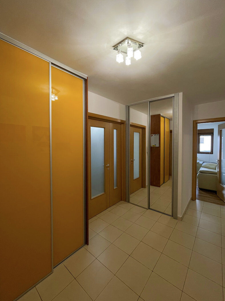A comfortable and furnished three-room apartment of 103m 2 is for sale at the Old Airport in Podgorica. The apartment is located on the 1st floor of the Zetagradnja building, which has two elevators. Structure : entrance hall, living room with dining room and kitchen, terrace, toilet, hall with 3 bedrooms, bathroom and another terrace. It is sold fully equipped. The sale price also includes a garage space of 19m2 on level -1. The apartment is located near the school, kindergarten, market, park and all important facilities. The location offers a quiet environment with excellent connectivity to the rest of the city - ideal for family life.