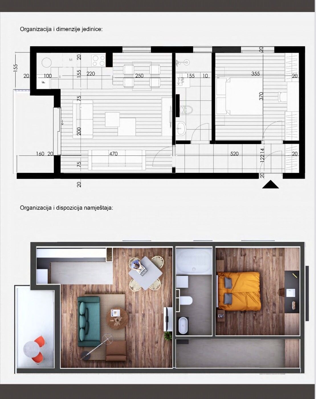 A one-room apartment under construction, 55m2, is for sale, in a new building in the Podgorica neighborhood of Momisici. The apartment is located on the 1st floor of a new residential building. The building has an elevator, and future buyers can also purchase a garage space. Apartment structure: bedroom, bathroom, living room with kitchen and dining room and terrace. The building is under construction, and the planned completion of the works is the summer of 2026. The apartment represents an excellent opportunity for peaceful and quality family housing, as well as for investment.