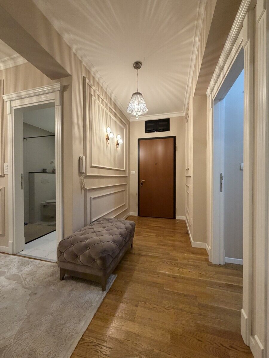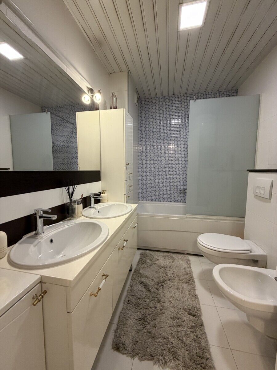 Three-room apartment for sale in City quarter, on the first floor, with a surface area of 119 m² (in the property deed registered as 111 m²). The apartment is sold with a garage space and a basement, and additional functionality is provided by two bathrooms, a laundry room, and a pantry. It is equipped with a split system, sold fully furnished, modern, comfortable, and ready to move in. The price is 357,000 EUR.
