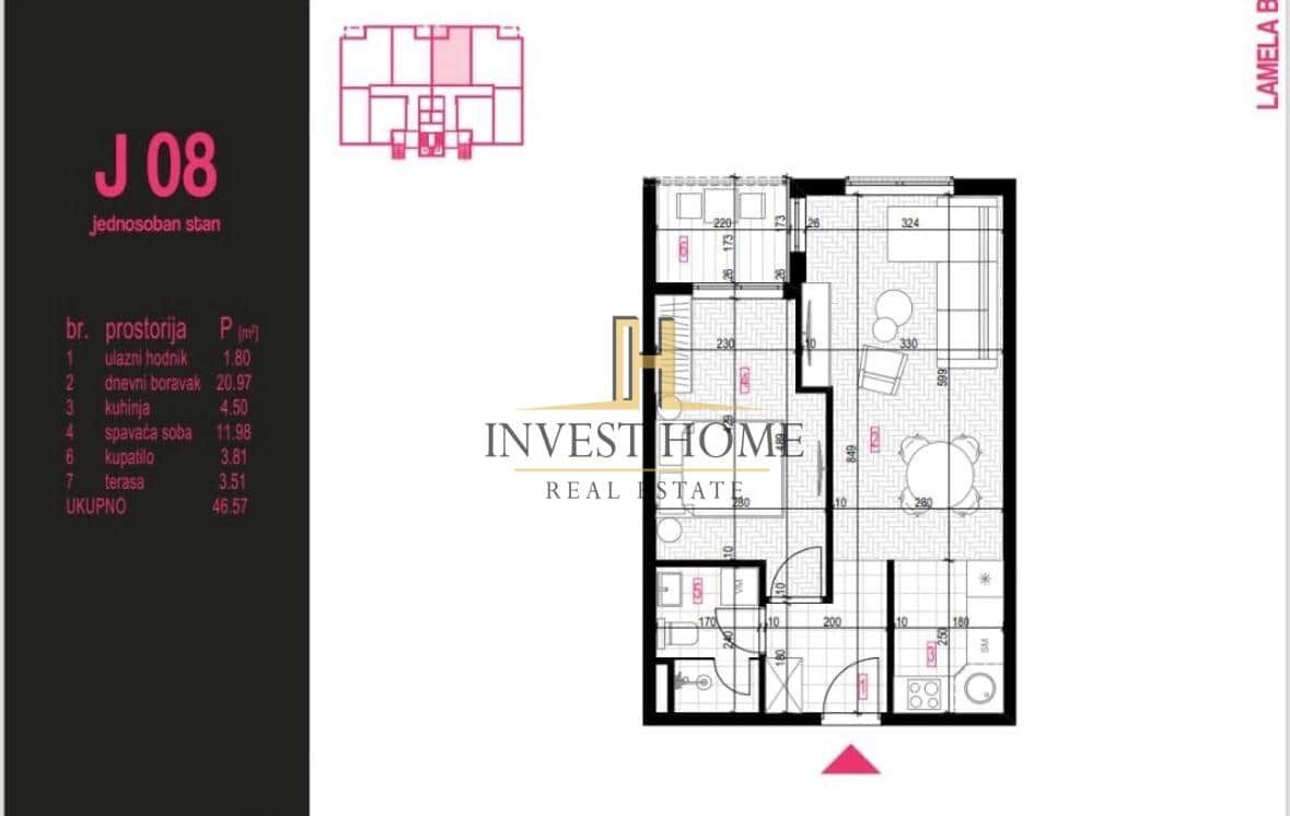 For sale one-bedroom apartment in Zabjelo, with an area of 46m2. The apartment is located on the ground floor of a residential building under construction, with completion of works expected in April 2026. Apartment layout: living room with kitchen and dining area, bedroom, hallway, bathroom, balcony. It is located near all city amenities.