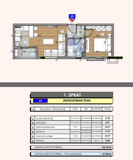 A one-room apartment under construction in Zabjelo is for sale. The apartment is 38 square meters and is located on the first floor of a new building, the building can be moved into within a month. The apartment has one bedroom, hallway, living room with kitchen and dining room and a small terrace with a view of Vojislavljevica boulevard.