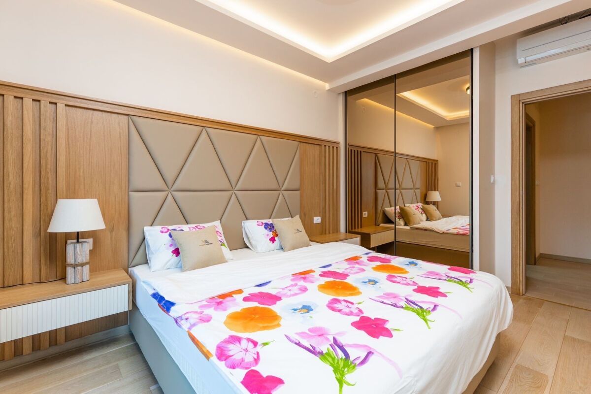 Real estate, Montenegro, Pržno A luxurious two-bedroom penthouse is for sale in Pržno, on the Budva Riviera. These wonderful apartments with an area of 96 m² are located in an exclusive area under the highway, in a residential building of hotel type, which offers a wellness center and rooftop pools. The building is only 200 meters from the sea, providing easy access to the beach and the opportunity to enjoy the beautiful surroundings. These apartments are an ideal investment opportunity due to the high rental potential in this popular tourist destination. The apartments consist of an entrance hall, two bedrooms, a bathroom, a kitchen, a living room, and a terrace with panoramic views of the sea and the city.
