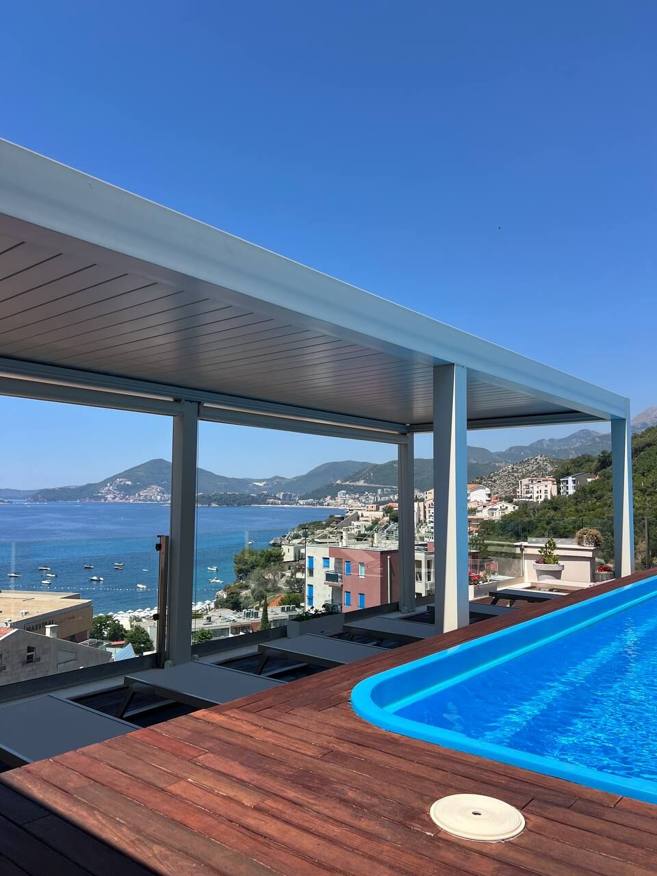 SALE We cooperate with agents Pržno, Montenegro. Modern penthouse with sea view. Area 96 m2. Bedrooms 2. Floor 5. Elevators. Hall. Reception. Pool and lounge area on the roof with a stunning view of the sea and mountains. SPA center, jacuzzi. Gym. Parking in the garage. No pets. Ideal location. Near the 5* Maestral Resort. 300 meters to the sea. Nearby supermarket. Promenade. Cafes, restaurants, beautiful beaches. Park. Everything within walking distance. Purchase without tax. ID292