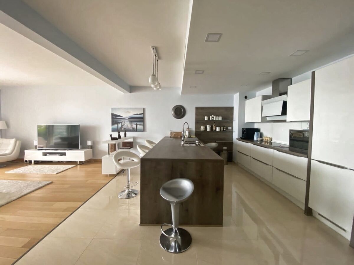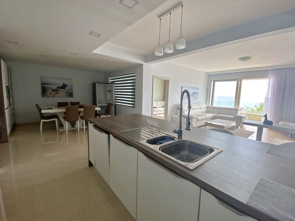 Apartment with 3 bedrooms on the very sea line in Rafailovici. Area - 149 m2 Layout: corridor, living room, kitchen, 3 bedrooms, 3 bathrooms, 2 terraces. Parking in the underground garage.