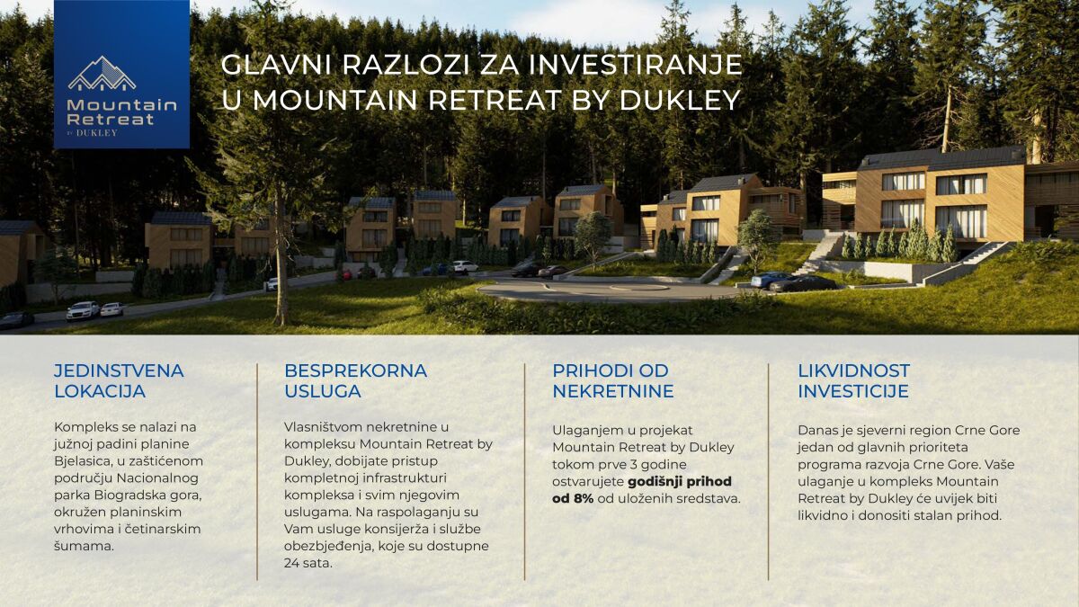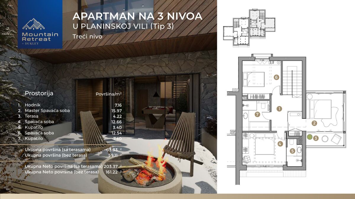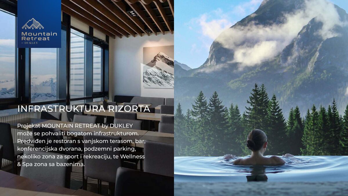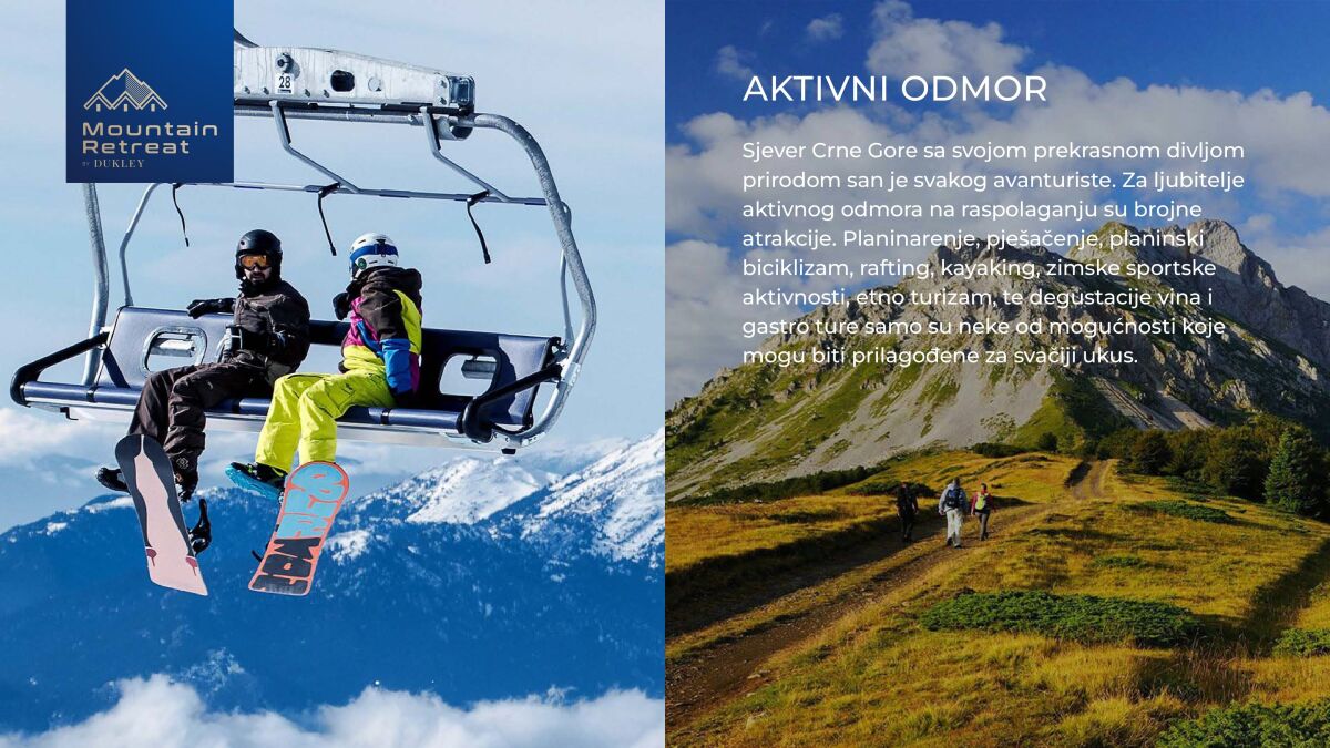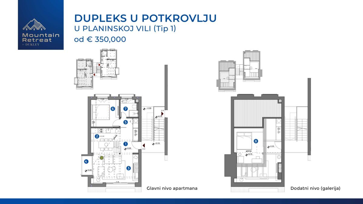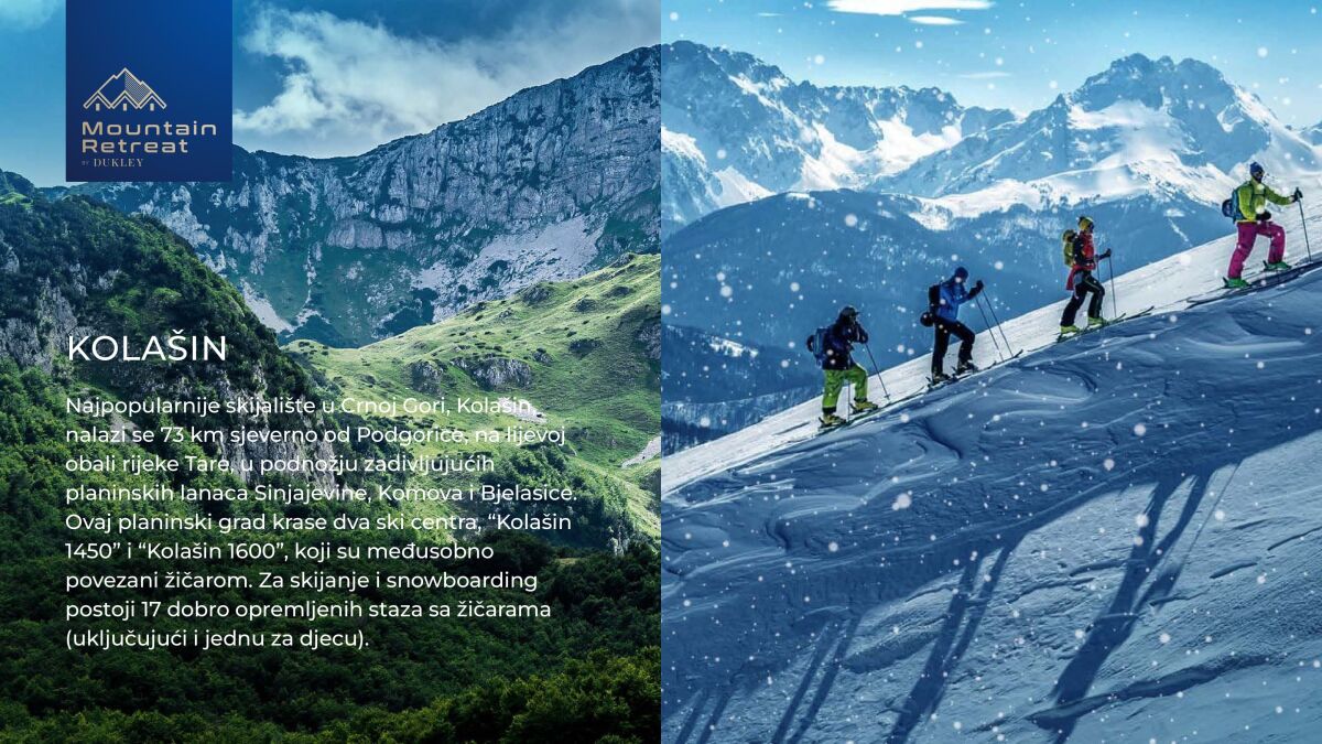 Amfora real estate offers you the opportunity to become the owner of one of the exclusive apartments in the Mountain Retreat by Dukley complex, at 1200 meters above sea level, between the center of Kolašin and the ski resort "Kolašin 1450", on the southern slope of the mountain Bjelasica, in the protected area of the Biogradska gora National Park , surrounded by mountain peaks and coniferous forests. In the Mountain Retreat by Dukley complex, there are three different types of apartments to choose from, depending on your needs and preferences. DUPLEX APARTMENT IN MOUNTAIN VILLA (Type 1) AREA 70.03m2 CONSISTS OF MAIN LEVEL AND ADDITIONAL LEVEL (GALLERY). MAIN LEVEL STRUCTURE: Entrance hallKitchen & Dining RoomLiving roomTerraceVestibuleBedroomThe bathroom ADDITIONAL LEVEL (GALLERY) STRUCTURE: BedroomToilet PRICE: EUR 350,000 This complex offers a unique opportunity to enjoy the natural beauty of Montenegro, while at the same time enjoying all the modern comforts and luxuries. The apartments are built with exceptional attention to detail and decorated with natural stone and wood aesthetics, providing a perfectly harmonized ambiance with the natural environment. Each apartment is equipped with modern furniture, elegantly designed, with spacious balconies that offer spectacular views of the surrounding mountains and forests. As an apartment owner in this complex, you can enjoy a variety of services offered, such as concierge services, 24-hour security service, as well as the use of numerous facilities offered by the complex, such as restaurants, bars, conference hall, underground parking , a sports and recreation area, and a luxurious Wellness & Spa area with swimming pools. In addition, apartment owners have the privilege of enjoying the natural beauty of the Montenegrin mountains, which are known for their untouched forests, high peaks, crystal clear mountain lakes and green meadows. Mountain Retreat is the perfect choice for those who seek peace and quiet in nature, but at the same time want to enjoy luxury and modern conveniences. Be one of the lucky ones who will become part of this exclusive complex and experience life in harmony with nature and a modern lifestyle. The most popular ski resort in Montenegro, Kolašin, is located 73 km north of Podgorica, on the left bank of the Tara River, at the foot of the stunning mountain ranges of Sinjajevina, Komovo and Bjelasica.This mountain town is decorated with two ski centers, "Kolašin 1450" and "Kolašin 1600", which are mutuallyconnected by cable car. For skiing and snowboarding, there are 17 well-equipped slopes with cable cars(including one for children).