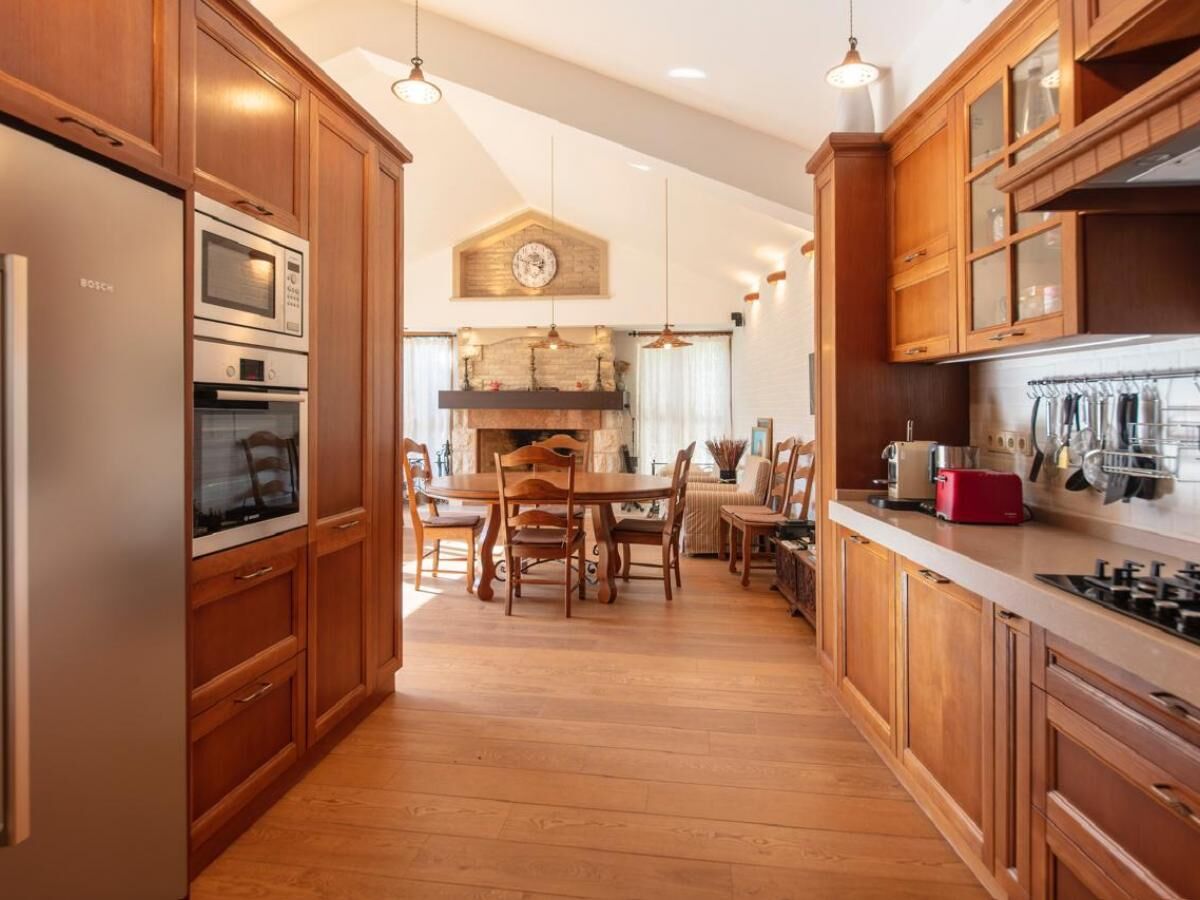 Two-story villa with an area of 186 m2, located on a plot of 364 m2, with a garage of 30 m2. On the first floor of the villa are: a large kitchen-dining room with a wood-burning fireplace and a relaxation area, equipped with all necessary household appliances (electric and gas stove, refrigerator, oven, wine cabinet) guest toilet corridor two bedrooms, each with its own bathroom and a shared relaxation room (living room) Turkish sauna (hamam) internal courtyard for dining and barbecues (wrought iron roof, water and electricity supply) On the second floor of the villa are: kitchen-dining room, equipped with all necessary household appliances (electric stove, refrigerator, oven) two bedrooms, with two toilets and a shared relaxation room. The house is equipped with an air conditioning system, underfloor heating, a generator, and an additional backup water supply system. The garage is a separate building, with access from the street. The territory of the house is fenced, with a lawn planted around the house with flowering and fruit plants (palms, magnolias, kumquat, citrus).