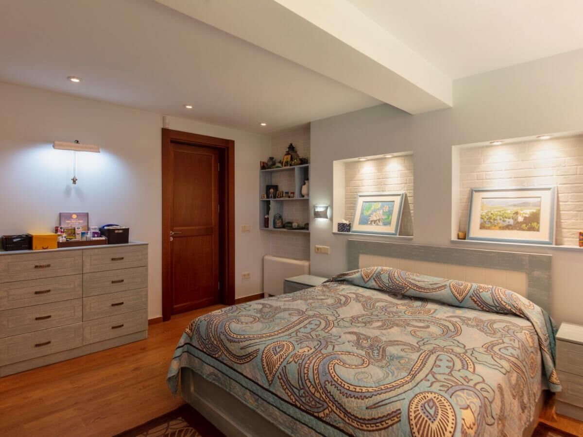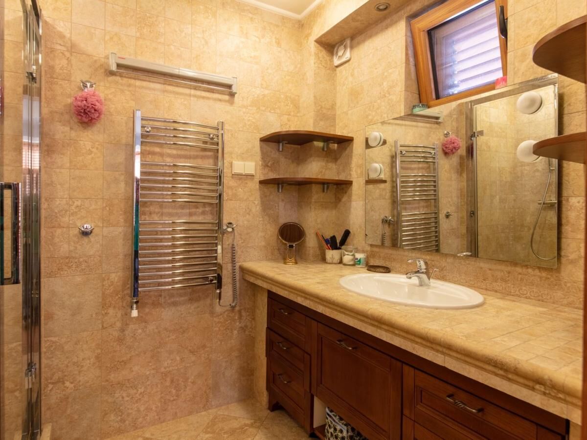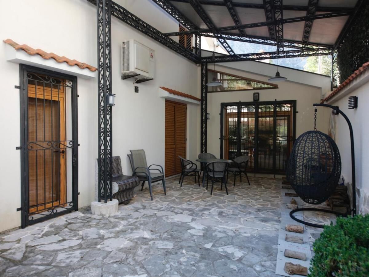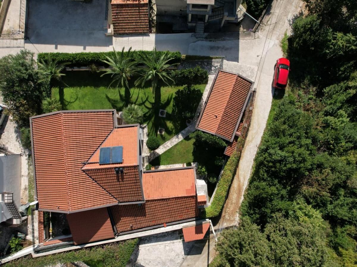 Two-story villa with an area of 186 m2, located on a plot of 364 m2, with a garage of 30 m2. On the first floor of the villa are: a large kitchen-dining room with a wood-burning fireplace and a relaxation area, equipped with all necessary household appliances (electric and gas stove, refrigerator, oven, wine cabinet) guest toilet corridor two bedrooms, each with its own bathroom and a shared relaxation room (living room) Turkish sauna (hamam) internal courtyard for dining and barbecues (wrought iron roof, water and electricity supply) On the second floor of the villa are: kitchen-dining room, equipped with all necessary household appliances (electric stove, refrigerator, oven) two bedrooms, with two toilets and a shared relaxation room. The house is equipped with an air conditioning system, underfloor heating, a generator, and an additional backup water supply system. The garage is a separate building, with access from the street. The territory of the house is fenced, with a lawn planted around the house with flowering and fruit plants (palms, magnolias, kumquat, citrus).