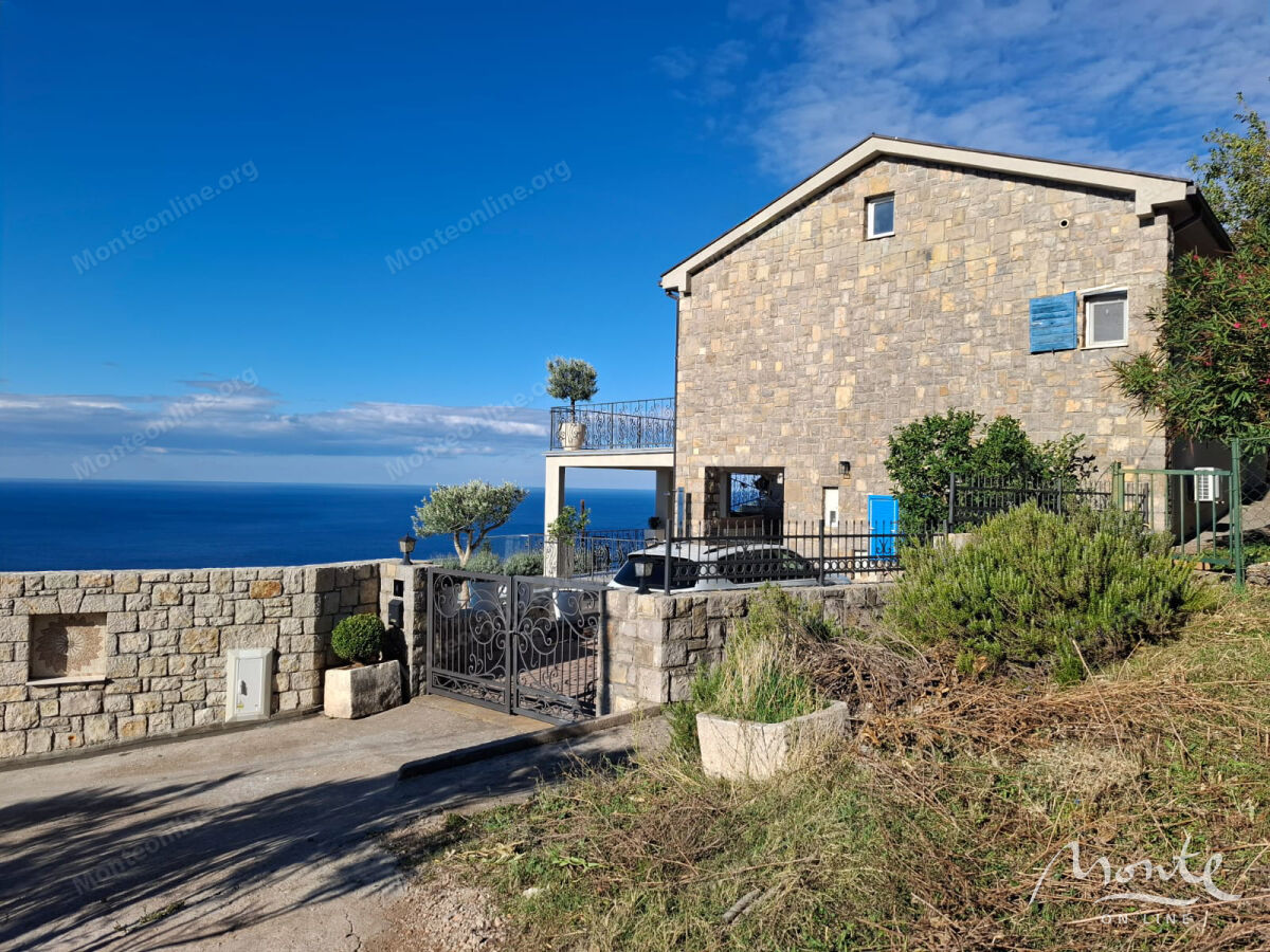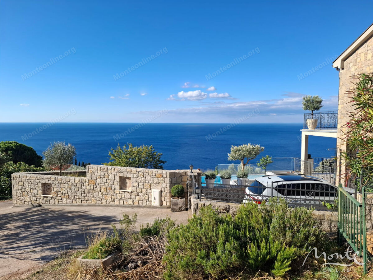 This stone villa is located in the heart of nature, on a high point of the ancient village of Rezevici-Katun. From the windows, there is a 180-degree view of the sea, and you can enjoy breathtaking sunsets on the Adriatic coast every day. This building was constructed legally and has a building permit from 2016. The location is perfect for people who love peace away from the crowds of tourists. It is the last house on the hill, next to stone ruins at an altitude of 170 meters above sea level. A small road leads to the house, which is rarely used by anyone. This place is undoubtedly one of the best on the Adriatic coast of Montenegro. There is municipal water supply. Next to a small street, there is a stylish landscape pool with seawater. Under the pool, there is a garage. Behind the house, there is an old garden shed and a vegetable garden. Right behind the house, there is a small historical village fountain built in the 1930s. On the first floor of the house, you will find a kitchen, dining room, and living room. They are combined into one large open-plan space. On the second floor, there are two very large bedrooms. Each floor has a bathroom, one of which has a shower, and the other has a corner bathtub. The house has a large storage room in the attic. The building's structure is good, and the facade is in good technical condition. • Living area 116 m². • 2 terraces on 2 floors with an area of about 90 m² + terrace by the pool. • Garage 25 m². • Land plots of about 600 m². The price includes a digital design and a complete renovation plan for this house, developed by an interior designer. Rezevici-Katun is a small, very quiet village located halfway between Budva and Bar. It has a bus stop. The Rezevici Monastery is just a few minutes' walk away. The nearest shops, restaurants, pharmacies, bakeries, and gas station are in Petrovac, 3 km away.