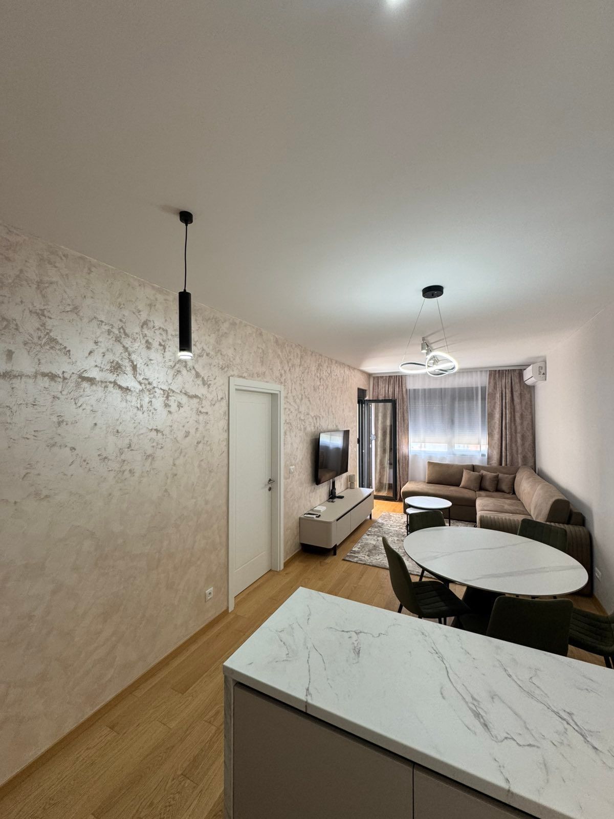A newly built two-bedroom apartment is for rent, located in the Bečići area, with a beautiful sea view. This property has an area of 71 m² and consists of a spacious living room with dining area, two bathrooms, two bedrooms, and a terrace with sea view. The apartment is in an excellent location, with many amenities nearby. Supermarkets, shops, restaurants, cafés, and other facilities are easily accessible, providing convenience and comfort for everyday living. The apartment is rented with a parking space included in the price.