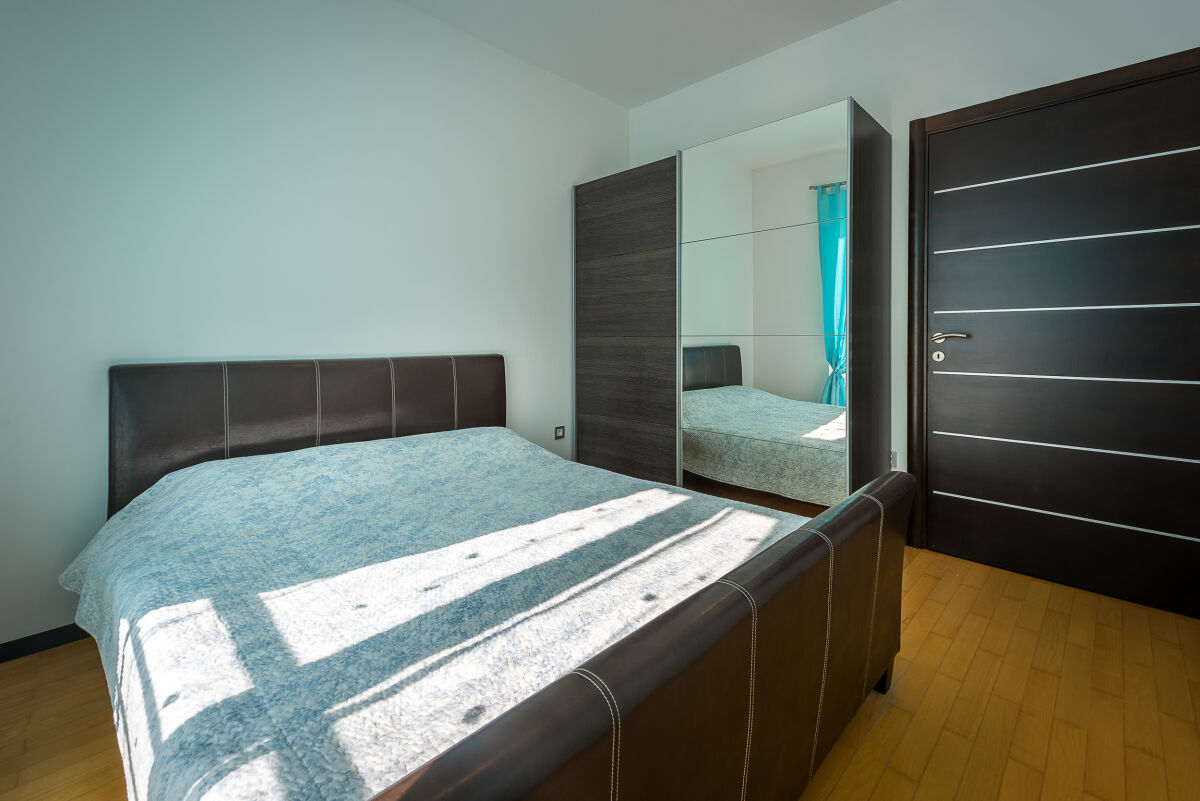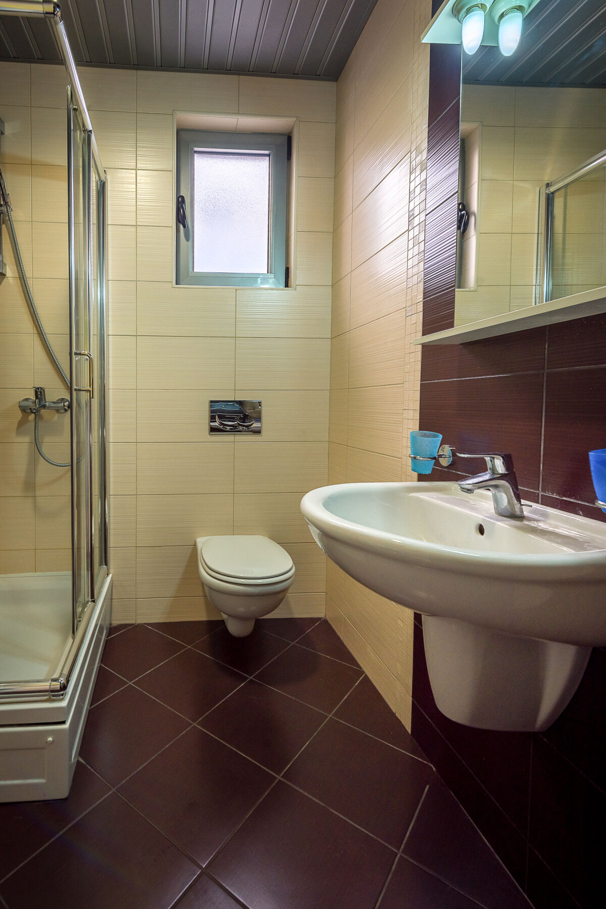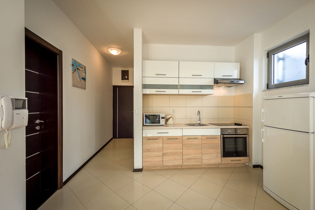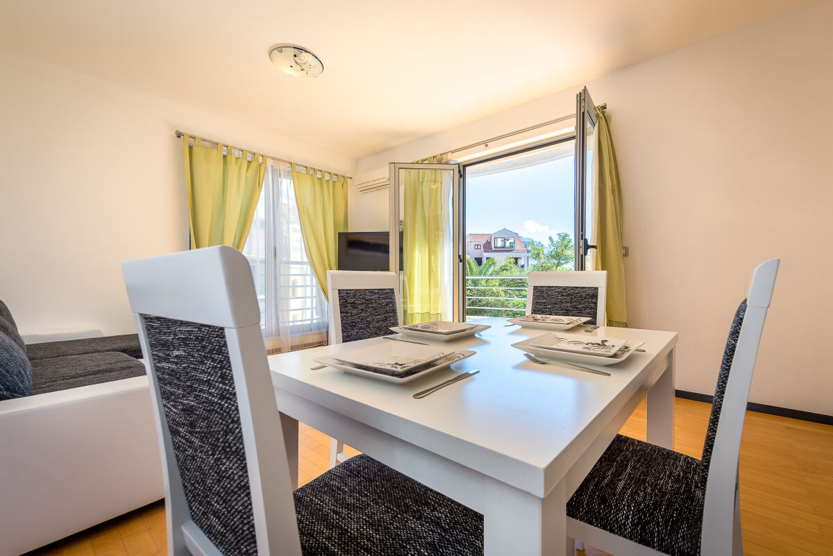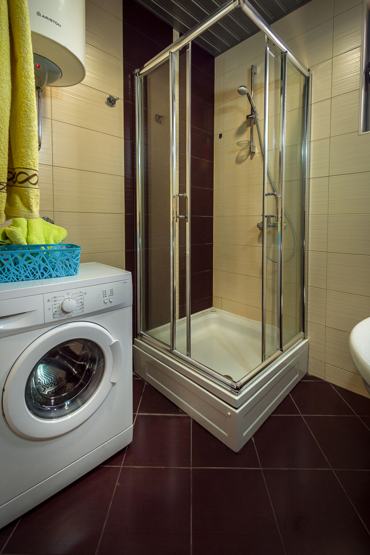 Rental until summer. The apartment has 1 bedroom and a living area combined with the kitchen. There is access to the terrace from the living room. The apartment with an area of 50 m2 has a living room combined with the kitchen, a terrace, and a bathroom with a shower cabin. In the bedroom, there is a large double bed and a spacious wardrobe. In the living room, there is a sofa for 2 persons. In the kitchen, there is a stove, microwave, refrigerator, and a set of dishes. There is air conditioning, cable television, internet-mobile WiFi router, and a washing machine. It takes 5-7 minutes to walk to the sea. Sremskog Fronta Street has an incline. A large supermarket is 5 minutes away, a pharmacy, and small shops and fruit stalls are within a 2-3 minute walk. Nearby is a water park and the five-star hotel "Splendid," which has a year-round SPA center. There are playgrounds by the sea. From the apartments, you can walk to the Old Town of Budva in 30-40 minutes along the seashore or take a car for 5-6 minutes, and it takes 10-15 minutes to reach the village of Rafailovici with many restaurants right by the sea.