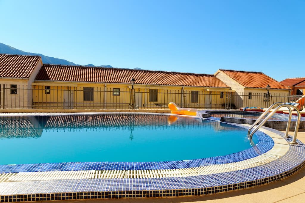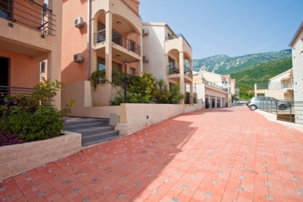 Rental until summer. Complex with 2 swimming pools. The apartment has 2 bedrooms and a living area combined with a kitchen. The apartment has a kettle, microwave, washing machine, air conditioner, hairdryer, iron, ironing board, and clothes dryer. In bedroom 1 — a large double bed. In bedroom 2 — a double bed of 140. The living area — a convertible sofa for 2 persons. From the living room, there is access to a spacious terrace. In the kitchen — a stove with 4 burners, an oven, a microwave, and a large refrigerator. It takes up to 10 minutes to walk to the sea. The street Ive Lole Ribara has an incline. A large supermarket and pharmacy are 10 minutes away, and there are small shops and fruit stalls within a 2-3 minute walk. Nearby is a water park and the five-star hotel "Splendid," which has a year-round SPA center. From the apartments, you can walk to the Old Town of Budva in 30-40 minutes along the seashore or take a car for 5-6 minutes, and it takes 15 minutes to reach the village of Rafailovici with many restaurants right by the sea.