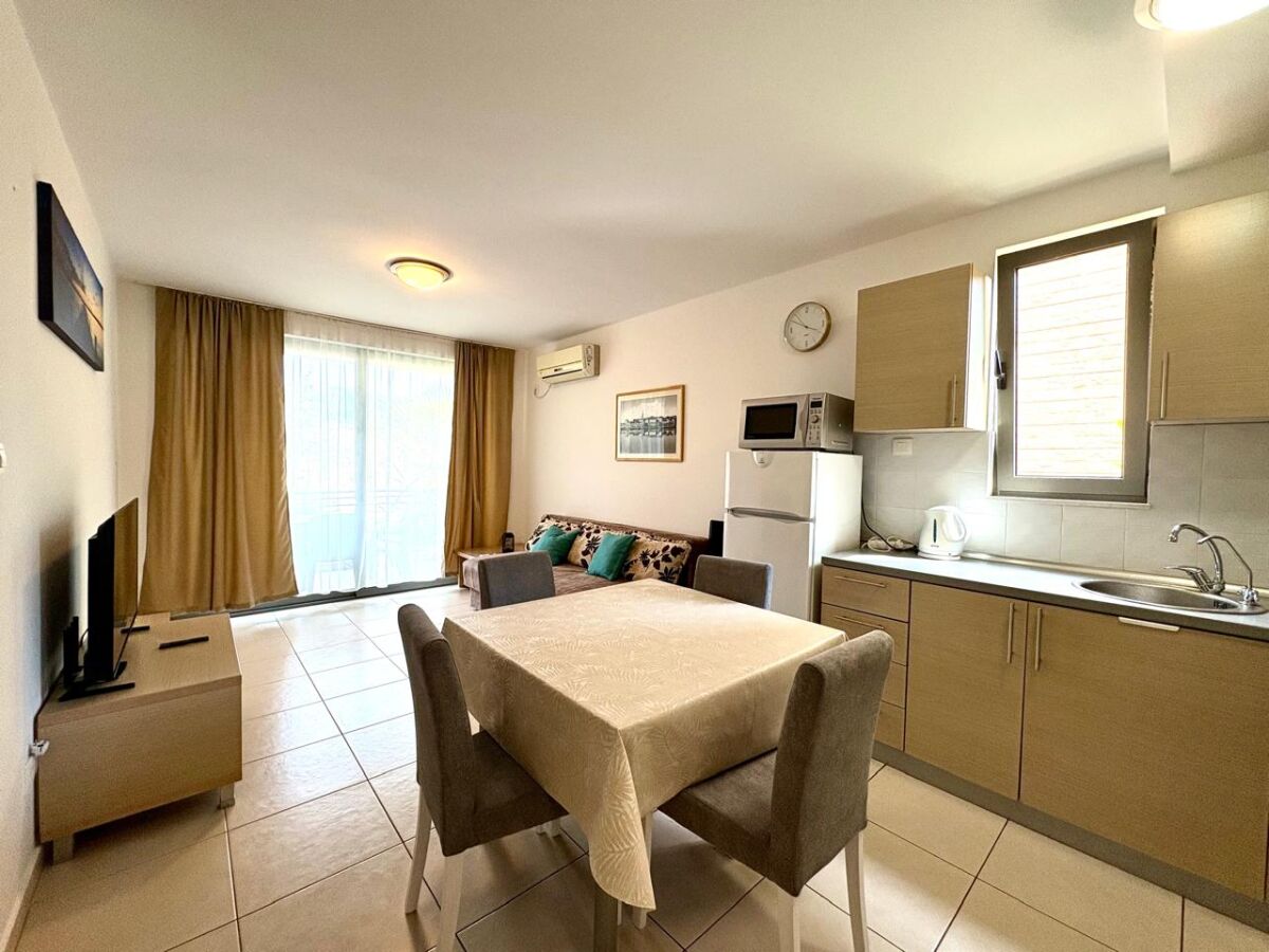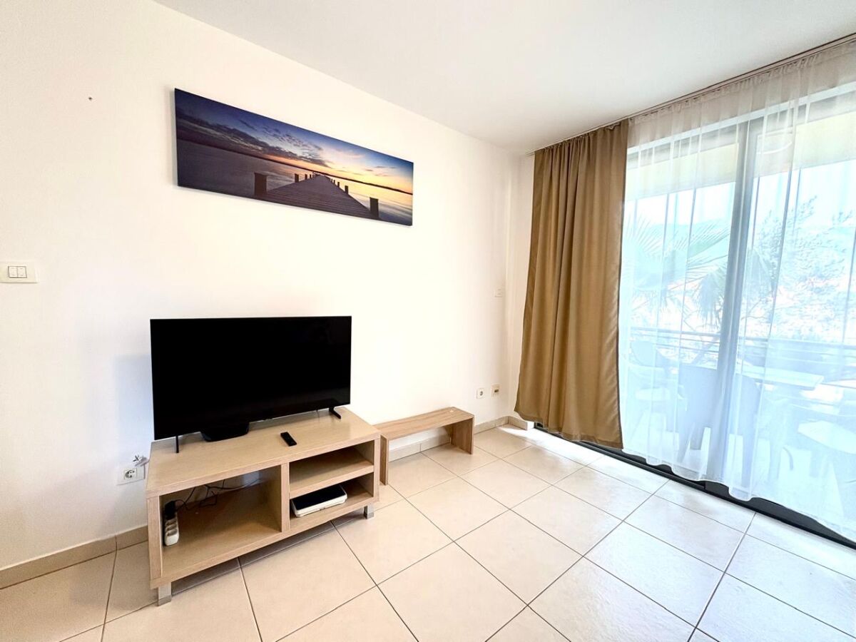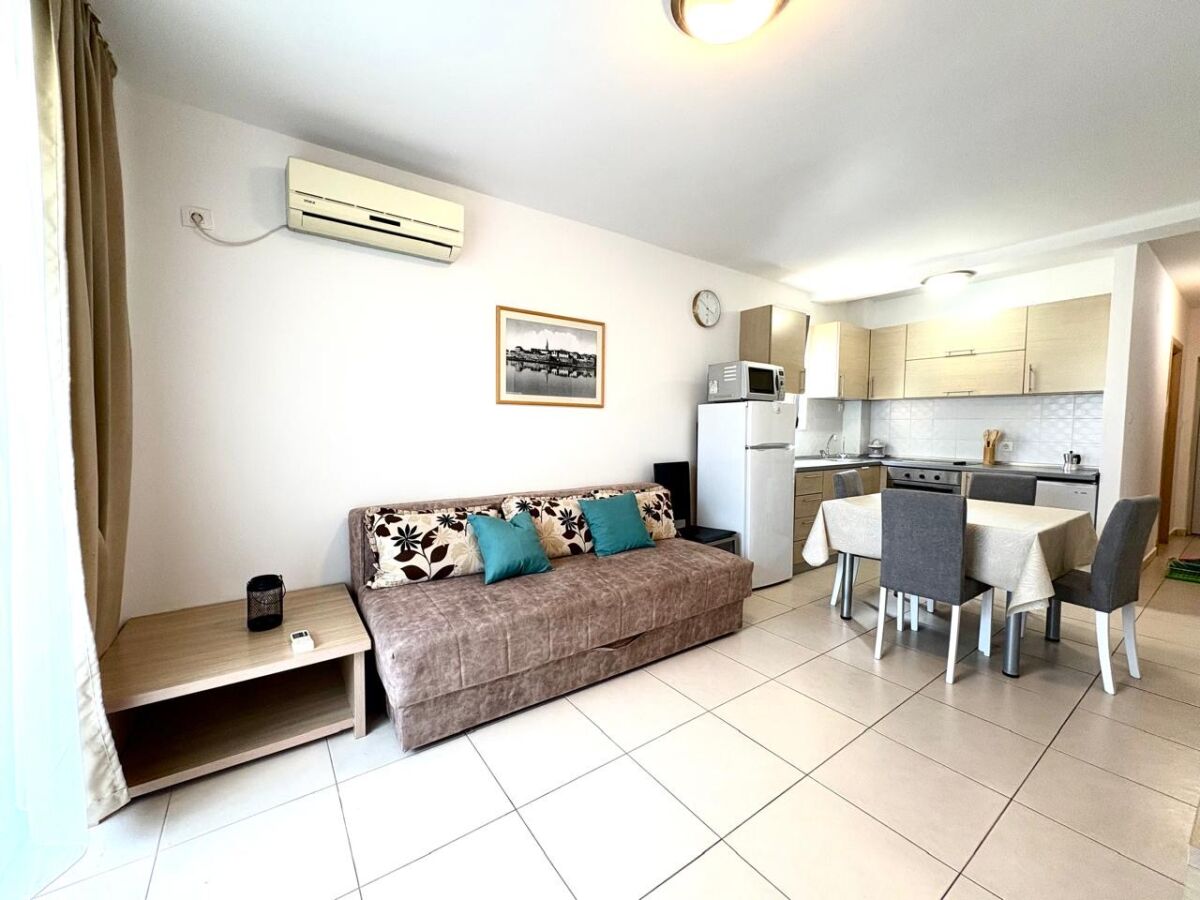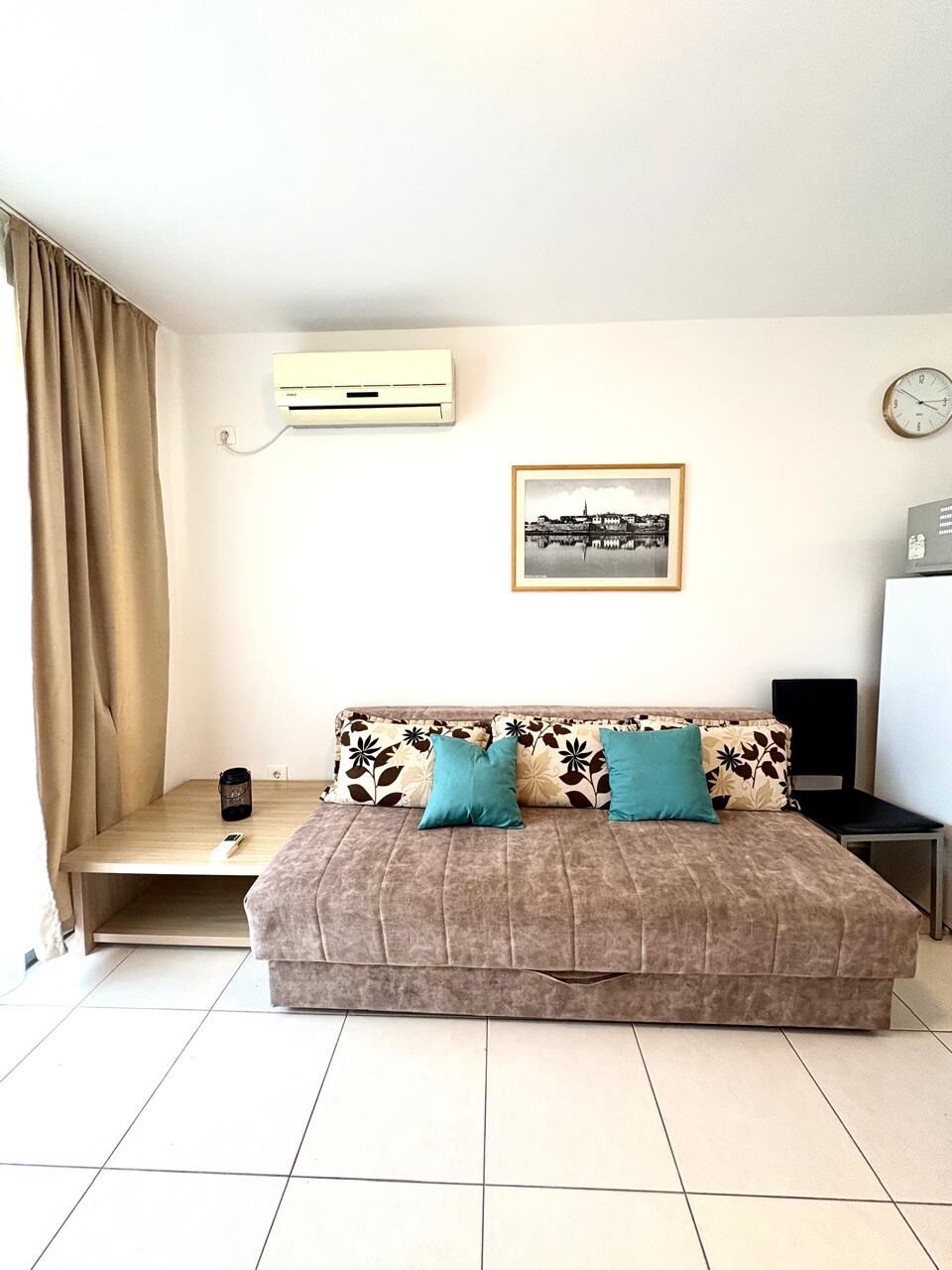 Rental until summer. Complex with 2 swimming pools. The apartment has 2 bedrooms and a living area combined with a kitchen. The apartment has a kettle, microwave, washing machine, air conditioner, hairdryer, iron, ironing board, and clothes dryer. In bedroom 1 — a large double bed. In bedroom 2 — a double bed of 140. The living area — a convertible sofa for 2 persons. From the living room, there is access to a spacious terrace. In the kitchen — a stove with 4 burners, an oven, a microwave, and a large refrigerator. It takes up to 10 minutes to walk to the sea. The street Ive Lole Ribara has an incline. A large supermarket and pharmacy are 10 minutes away, and there are small shops and fruit stalls within a 2-3 minute walk. Nearby is a water park and the five-star hotel "Splendid," which has a year-round SPA center. From the apartments, you can walk to the Old Town of Budva in 30-40 minutes along the seashore or take a car for 5-6 minutes, and it takes 15 minutes to reach the village of Rafailovici with many restaurants right by the sea.