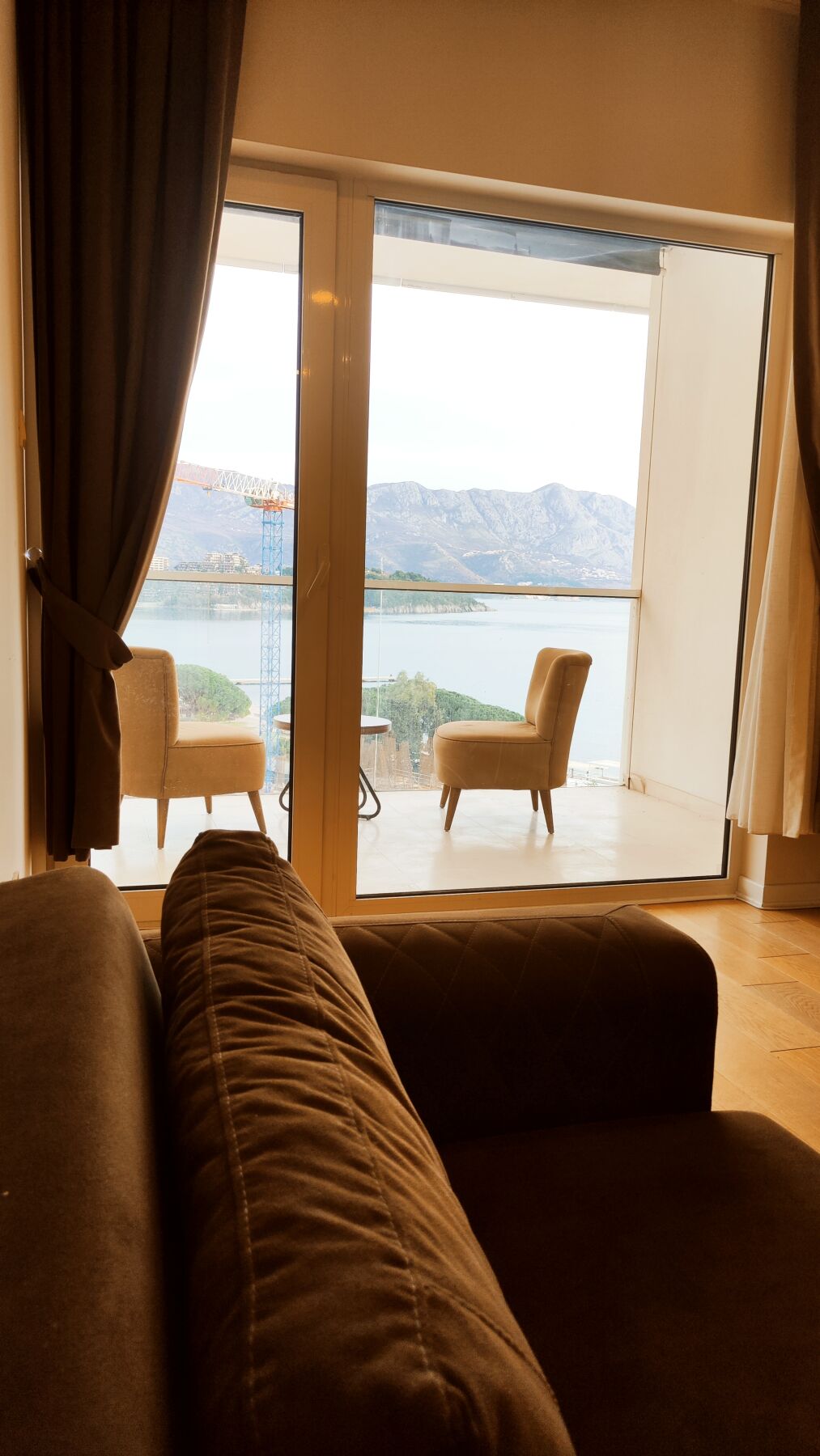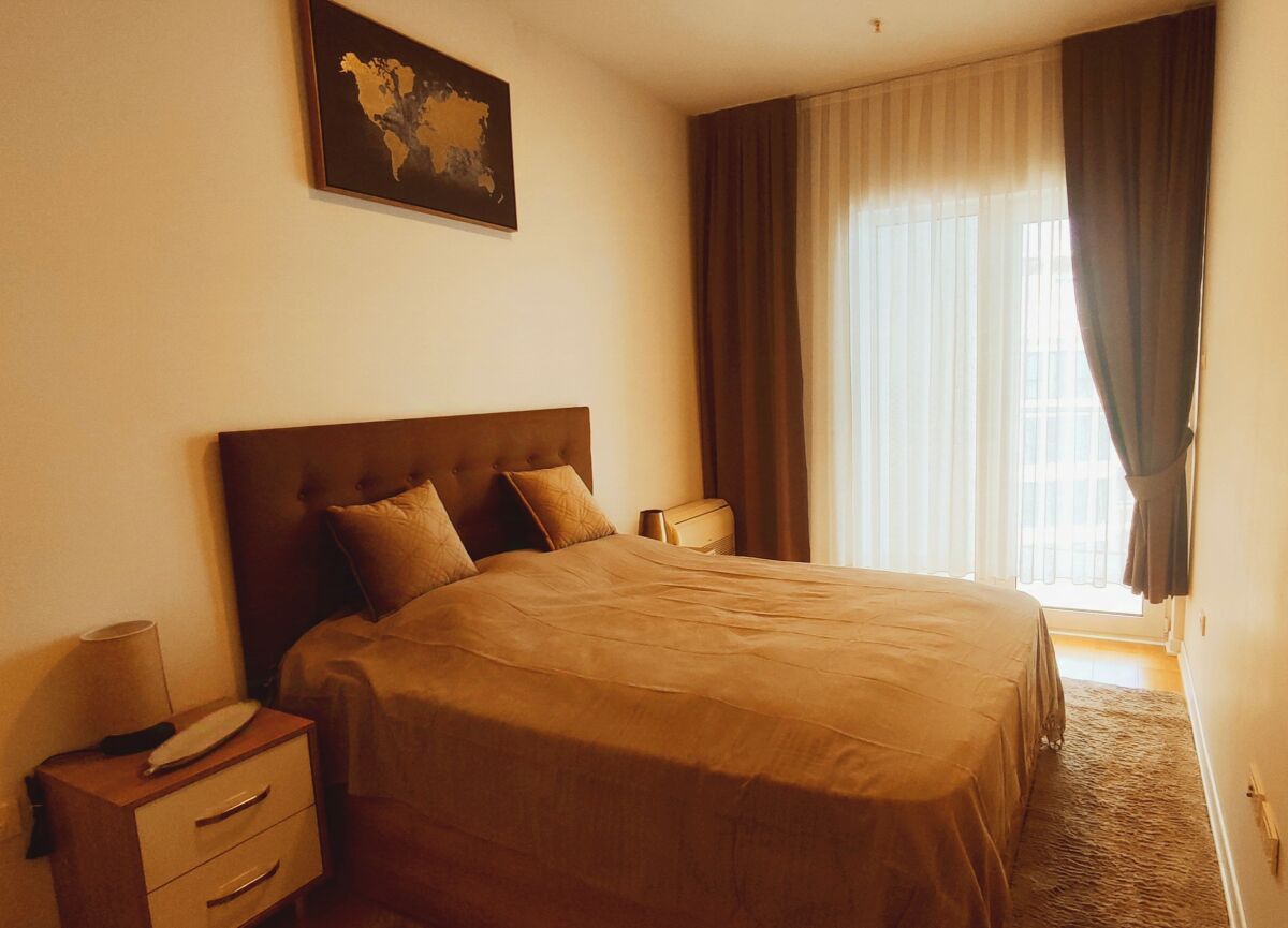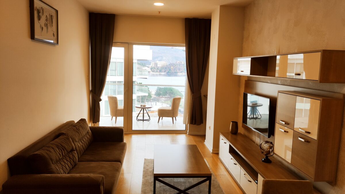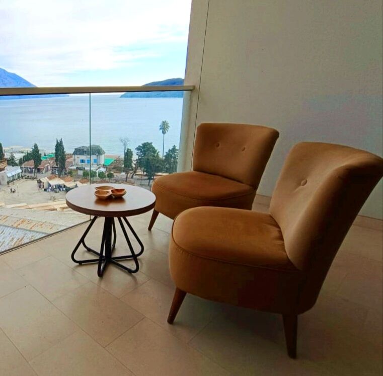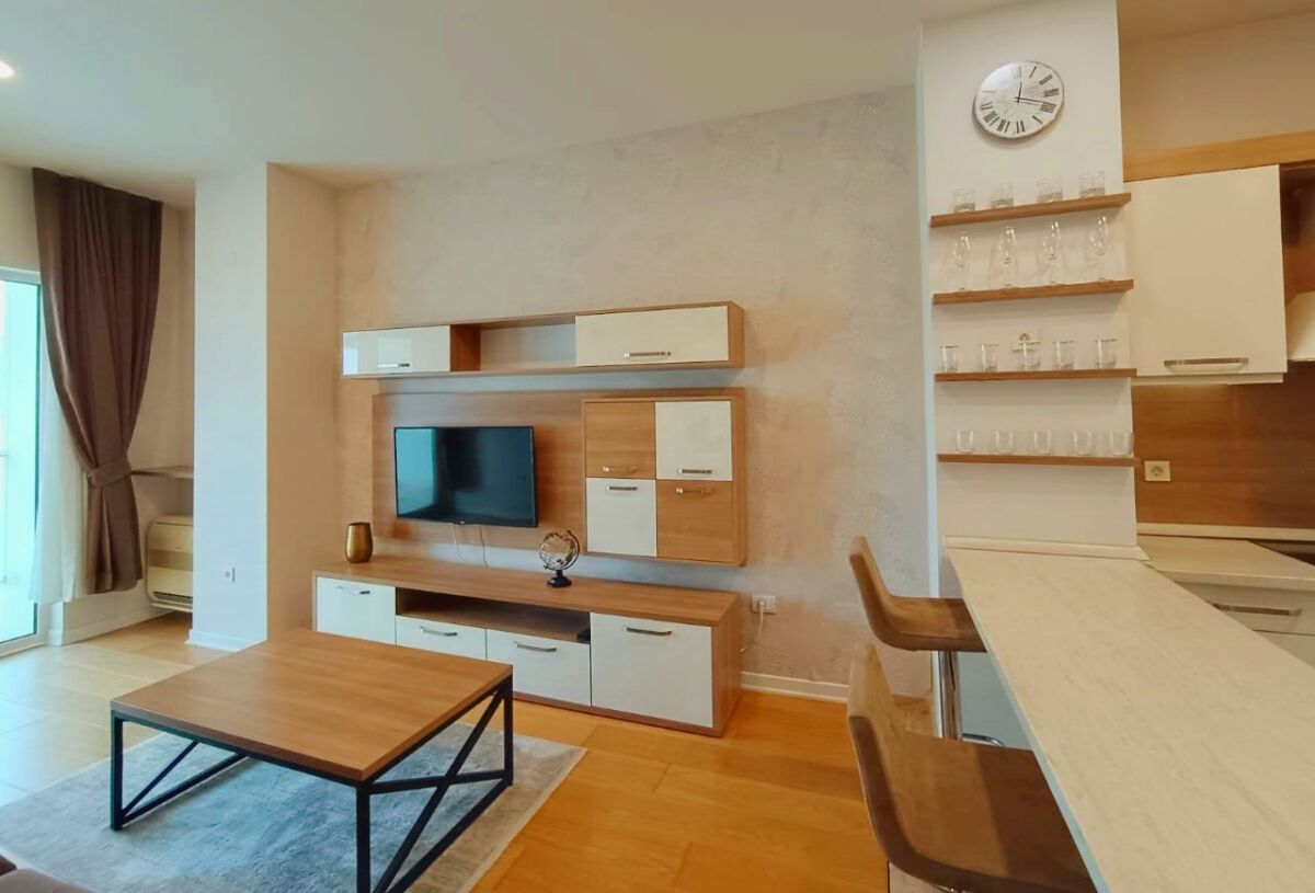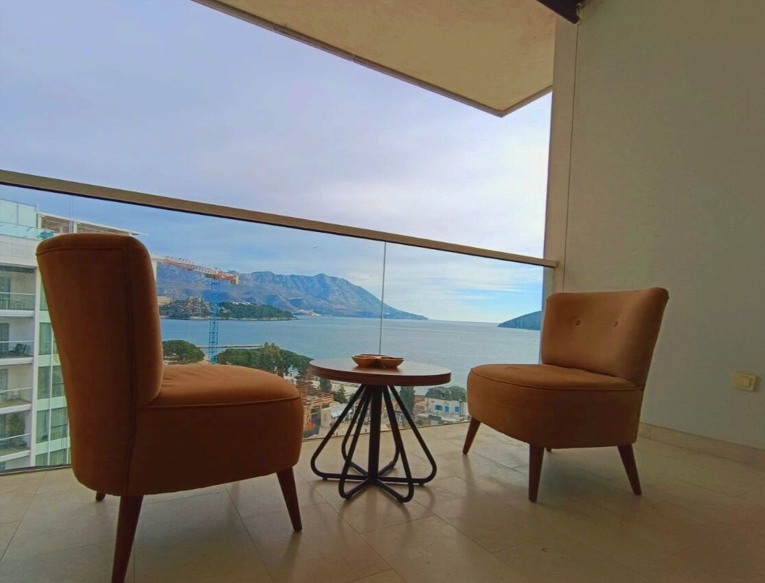 One-bedroom apartment with a view on the first line in the 4* Tre Canne hotel. Location: hotel on the Budva embankment, the beach is 50 meters from the hotel complex, to the left of the hotel is the largest park in Budva, 10 minutes walk along the embankment is the Old Town. Tre Canne Hotel: luxury 4-star hotel, modern architecture, spacious halls, reception, security system (fire alarm, entrance to the complex strictly by cards), shopping gallery (shops, restaurants, beauty studios), private parking. The complex consists of three towers, on the roof of the central tower there are a luxury restaurant, swimming pool and spa, each of the side towers has its own swimming pool and recreation area. Apartment: high floor, modern design, exclusive furniture, all necessary household appliances, large bedroom, full kitchen, living room, spacious terrace. Direct sea view.