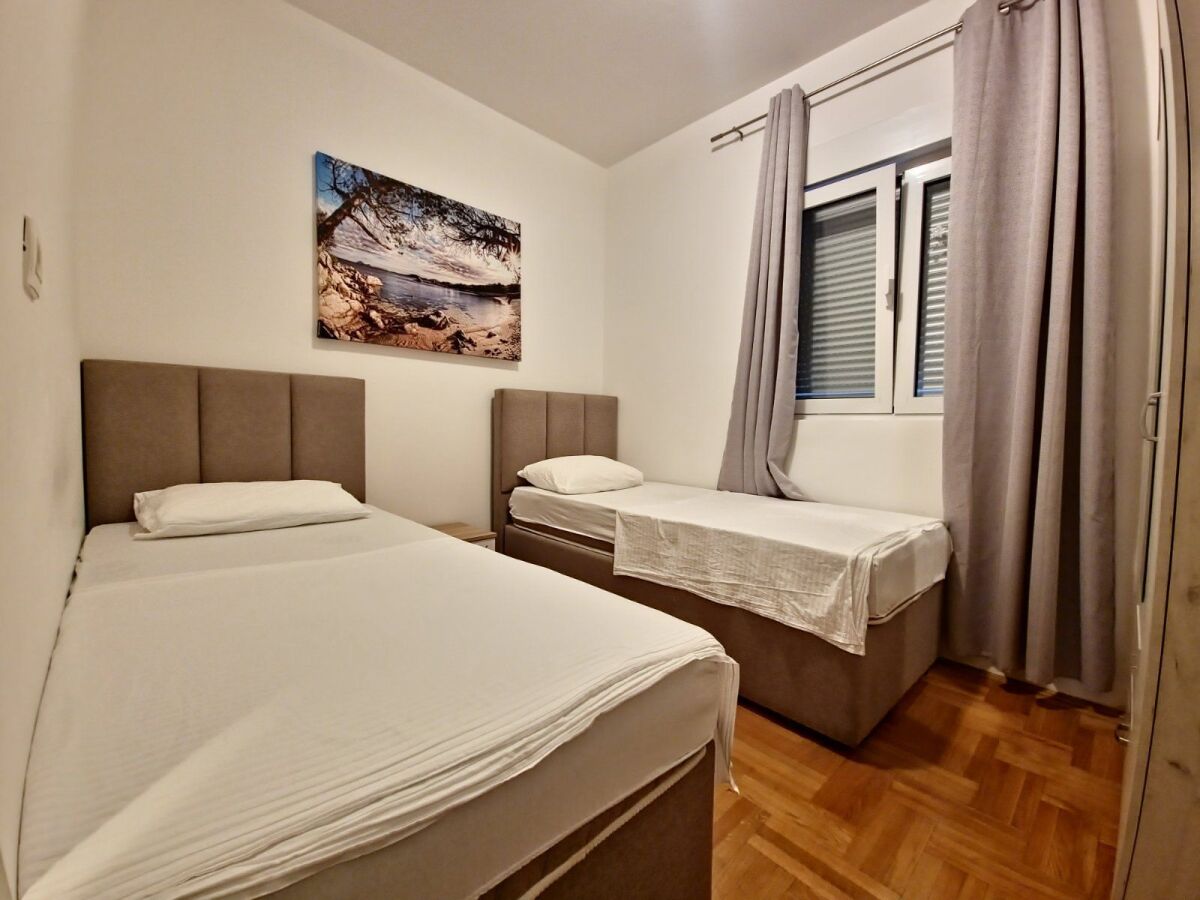 A modernly furnished two-bedroom apartment with a total area of 50 m² is for rent. The apartment is located in a fantastic location above the Milmedika clinic and the Eko gas station on the main boulevard in Budva. By structure, it is a two-bedroom apartment and consists of: a living room with a kitchen and dining area, two bedrooms, a hallway, a bathroom and a terrace. The apartment is well-preserved and furnished with quality equipment. The building is located in an excellent location, only 300 m from the beach. Payment terms: one-year contract, payment in advance – first and last rent, as well as a deposit in the amount of one monthly rent. Possibility to rent a garage space for €100 per month.