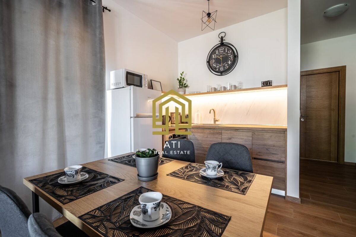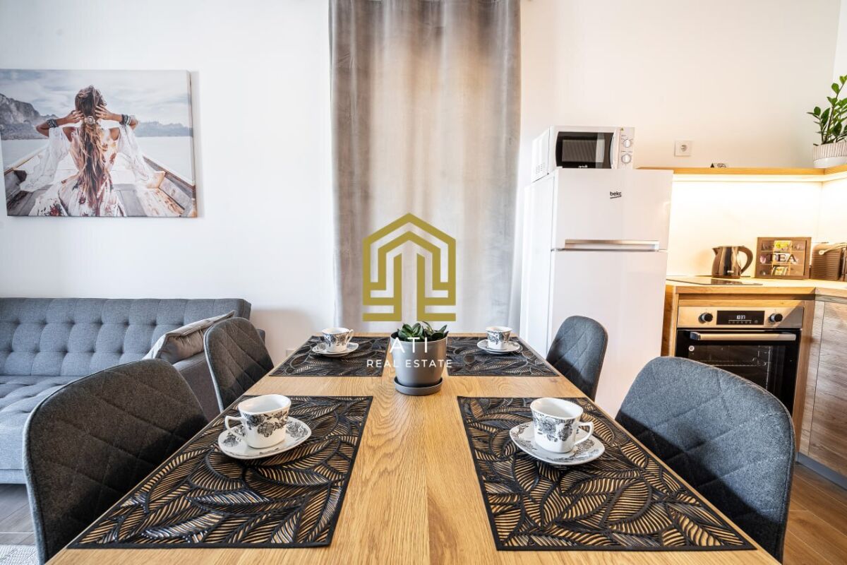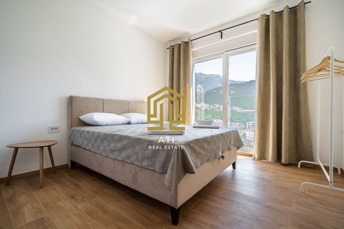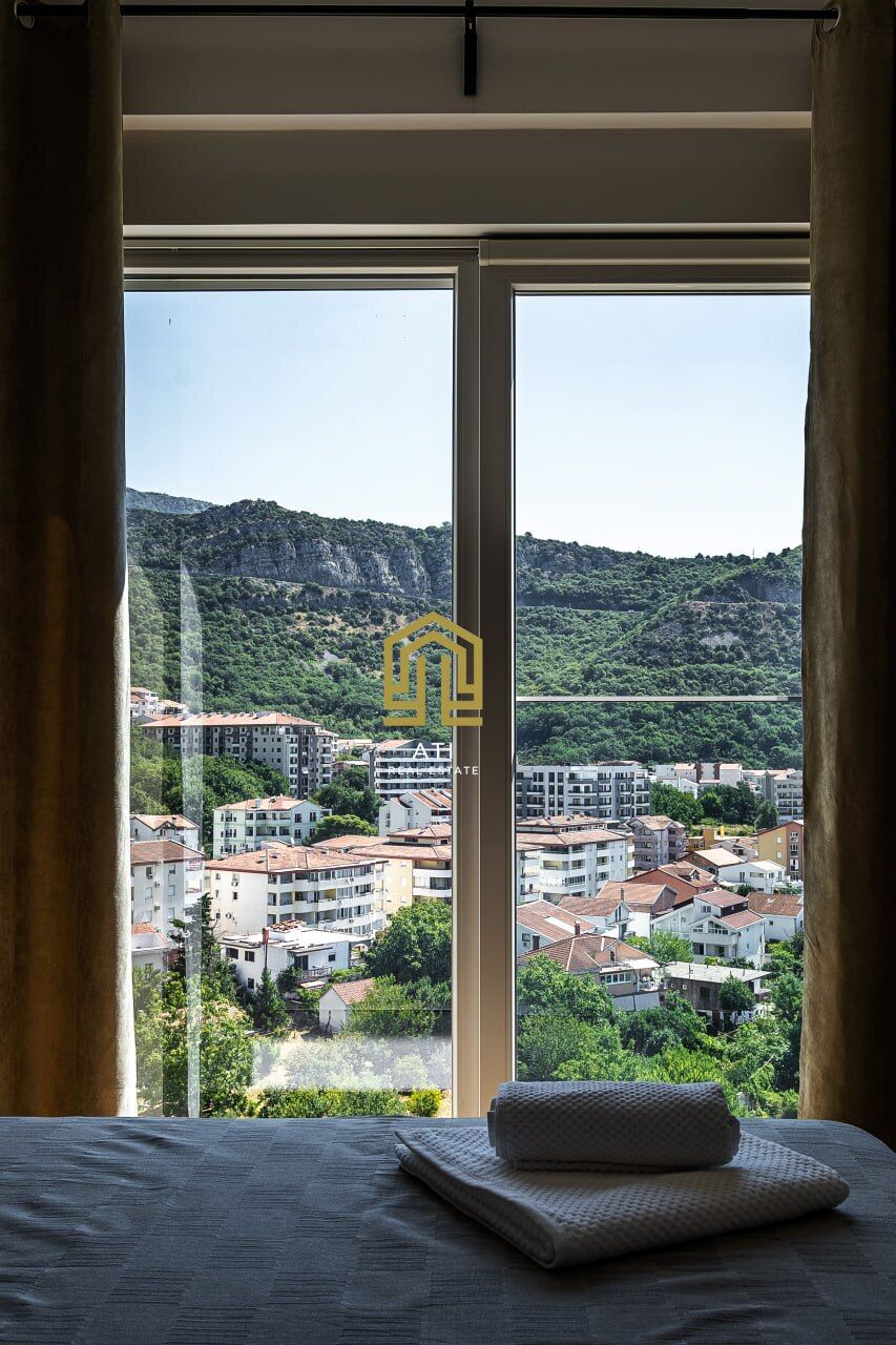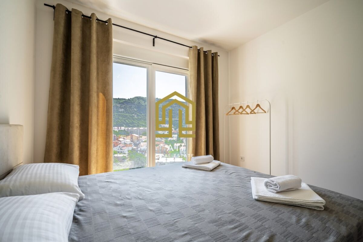 Budva, upper quarter (new center, next to Mega Mall) - 9th floor, panoramic windows, bright, quiet and incredibly beautiful! ID-539 The appearance is perfect: Large studio with separate bedroom, bathroom and hallway, Fully equipped kitchen with all appliances (including dishwasher!), Renovated in modern Scandinavian style, Large balcony with view of the city and mountains. Excellent location: 1 min walk - Russian store "Mixmarket" and lots of supermarkets, Restaurants, cafes, bars - everything is below the house, Mega Mall - 2 minutes on foot, Beach and Old Town are 10 minutes by car. The building is new, gated area, elevator, parking in the yard. Long-term lease (minimum 1 year), 1 monthly deposit + deposit. The apartment is currently available - come and live like on Pinterest!