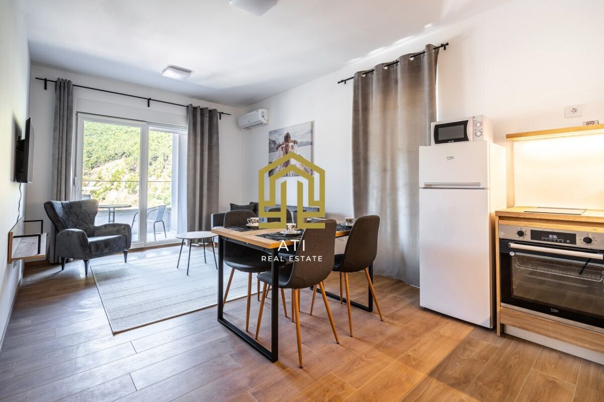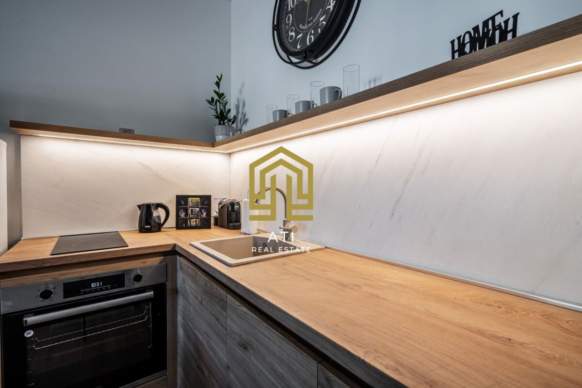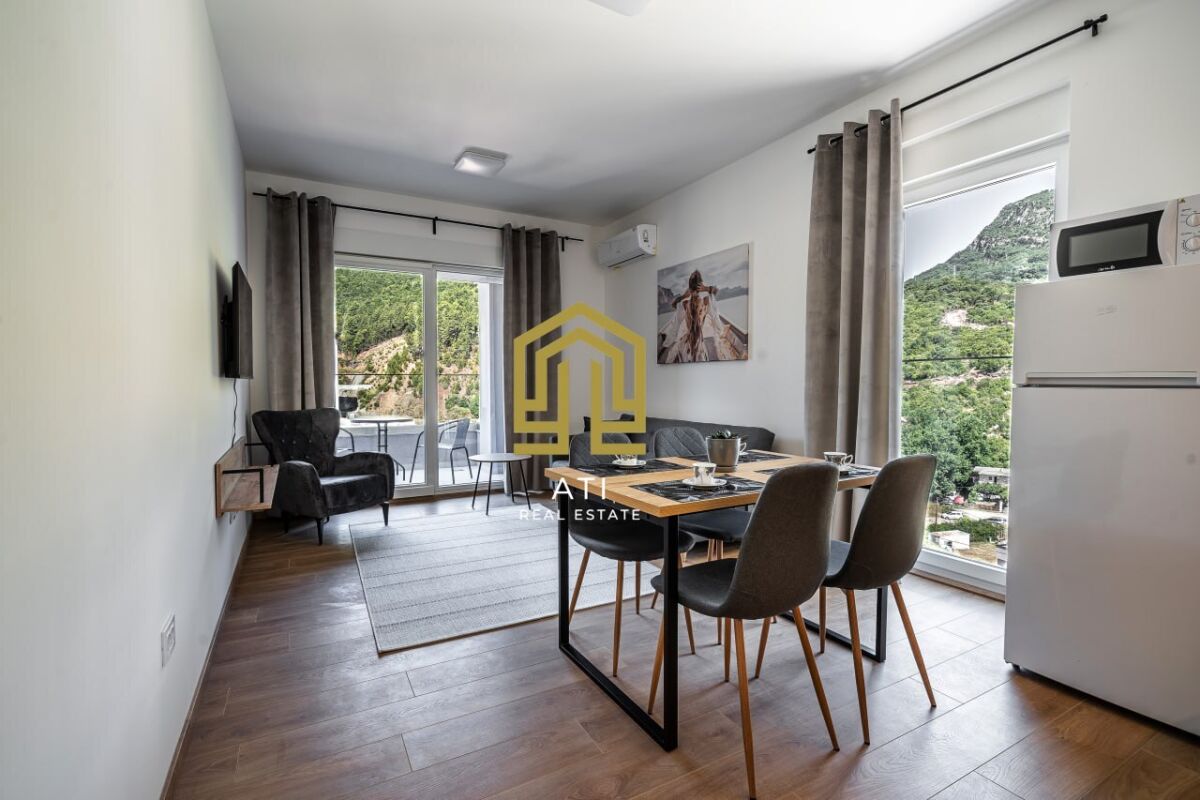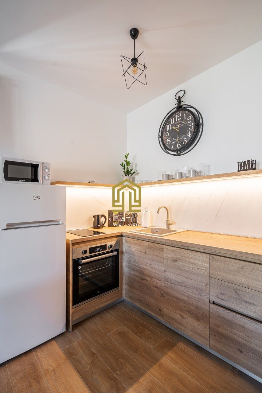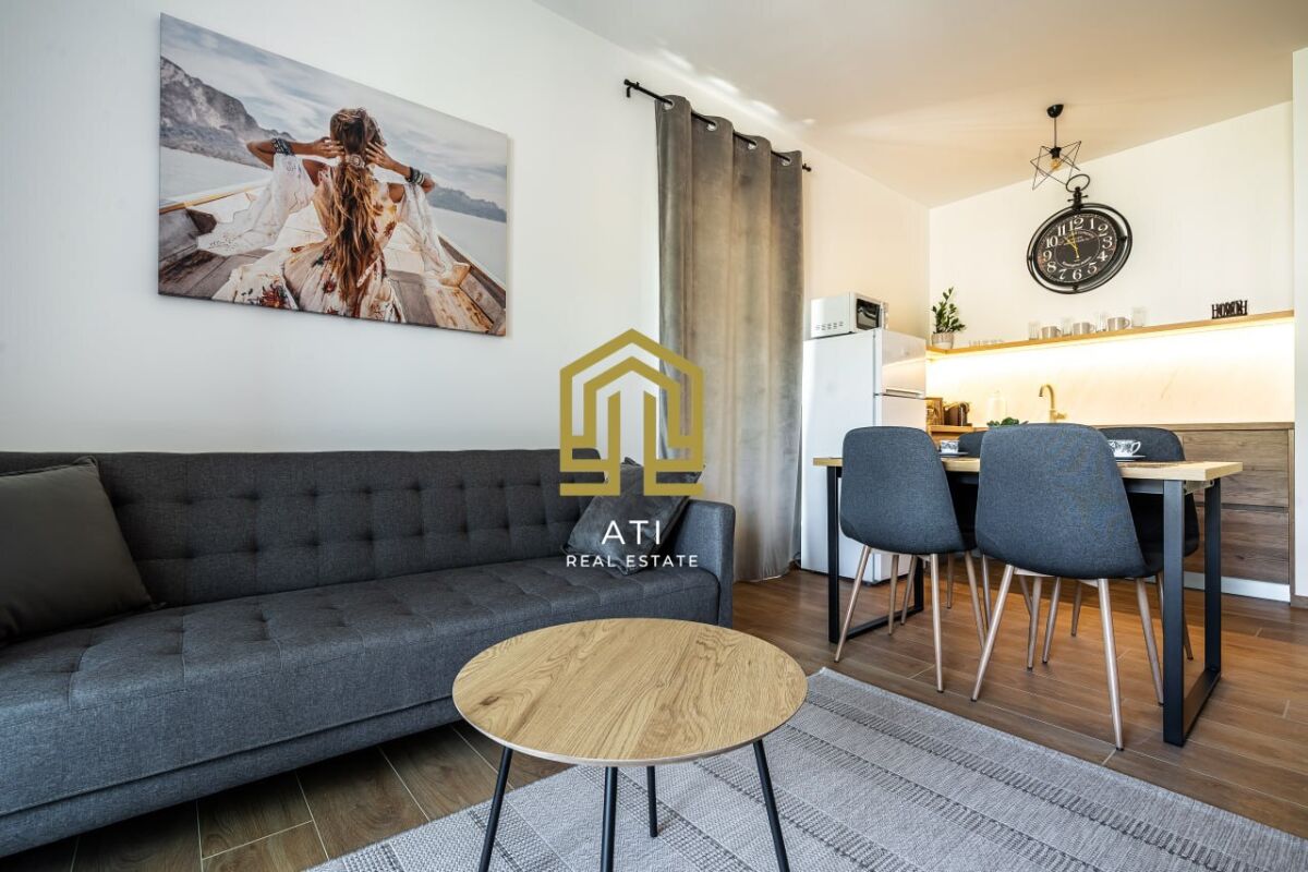 Budva, upper quarter (new center, next to Mega Mall) - 9th floor, panoramic windows, bright, quiet and incredibly beautiful! ID-539 The appearance is perfect: Large studio with separate bedroom, bathroom and hallway, Fully equipped kitchen with all appliances (including dishwasher!), Renovated in modern Scandinavian style, Large balcony with view of the city and mountains. Excellent location: 1 min walk - Russian store "Mixmarket" and lots of supermarkets, Restaurants, cafes, bars - everything is below the house, Mega Mall - 2 minutes on foot, Beach and Old Town are 10 minutes by car. The building is new, gated area, elevator, parking in the yard. Long-term lease (minimum 1 year), 1 monthly deposit + deposit. The apartment is currently available - come and live like on Pinterest!
