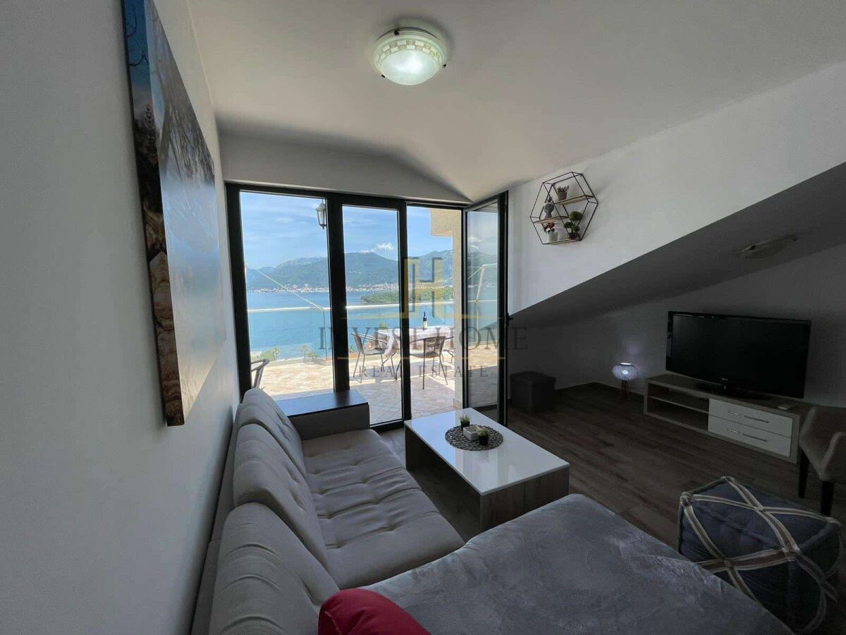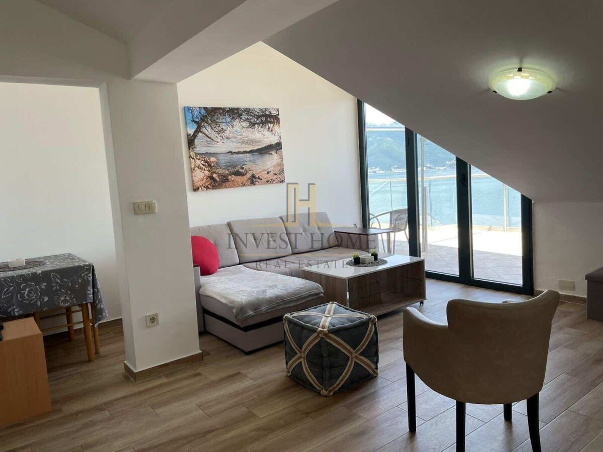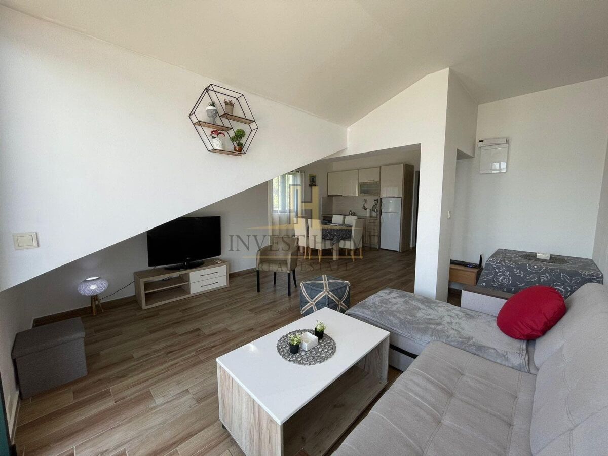 For rent two-bedroom apartment in Djurasevici, area 73m2. The apartment is located on the first floor of a small residential building that does not have an elevator. Apartment layout: living room with kitchen and dining room, two bedrooms, bathroom, hallway, and two terraces. It is located not far from the sea and includes a parking space as part of the price.