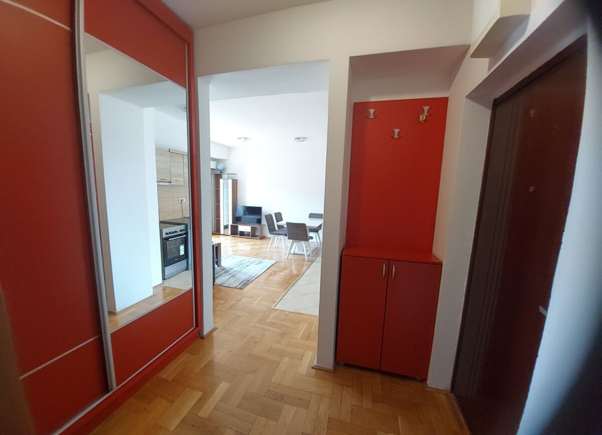 Two-room apartment for rent in Blok 9. It is located on the 4th floor and has 62m2. It is south oriented. The apartment is spacious and lit throughout the day. The building has good insulation, the entrance and elevator are regularly maintained. There is a large number of parking spaces around the building. The neighborhood is quiet, in the immediate vicinity there are markets, schools, kindergartens, playgrounds.