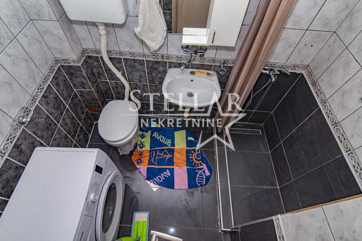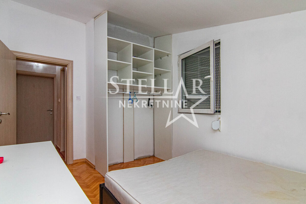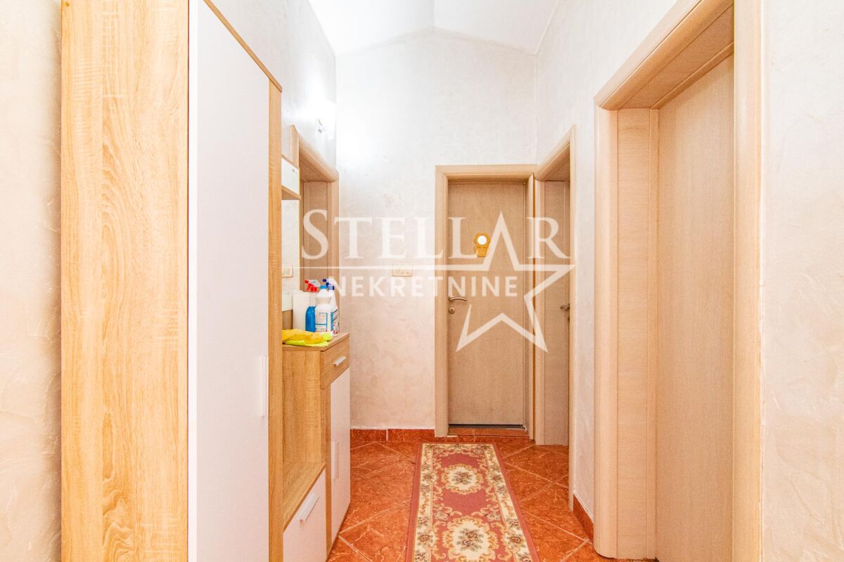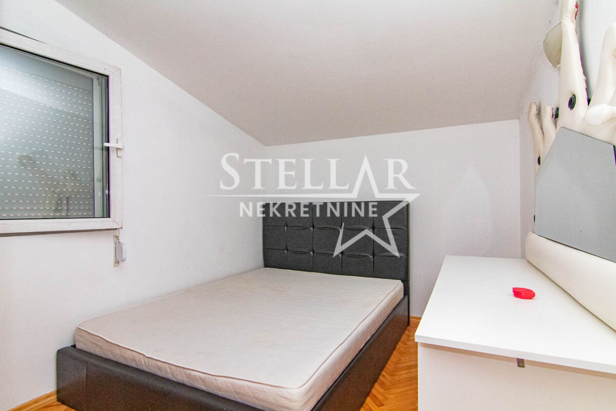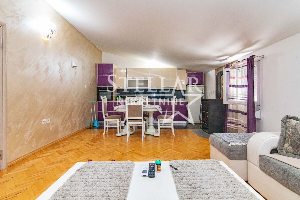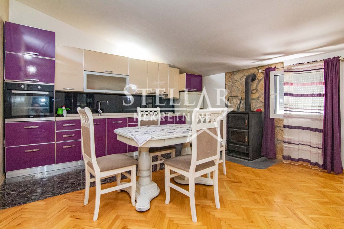 A furnished two-bedroom apartment is for rent on the floor of a house in Tološi. It has an area of 75m2 plus a terrace. It has air conditioning for cooling and heating, and there is also a wood stove. The bedrooms have French beds, and both rooms have windows and wardrobes. In the bathroom, there is a washing machine, and in the kitchen, there is a dishwasher. It is rented for a longer period with a mandatory deposit. Property ID M267 +382 69 618 445