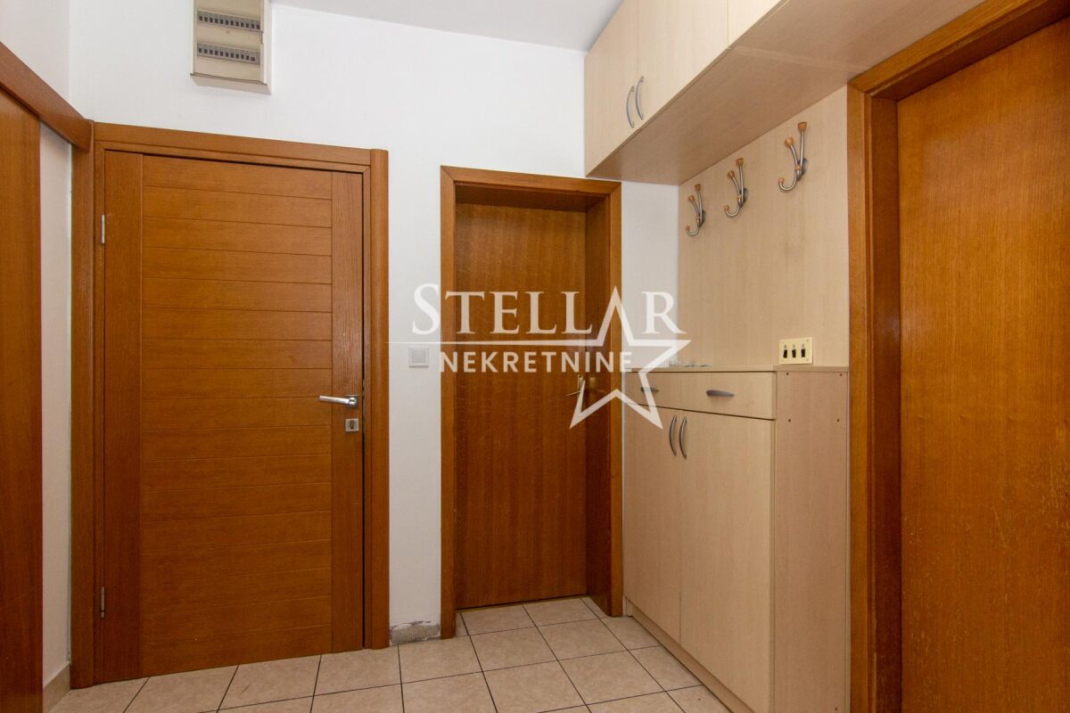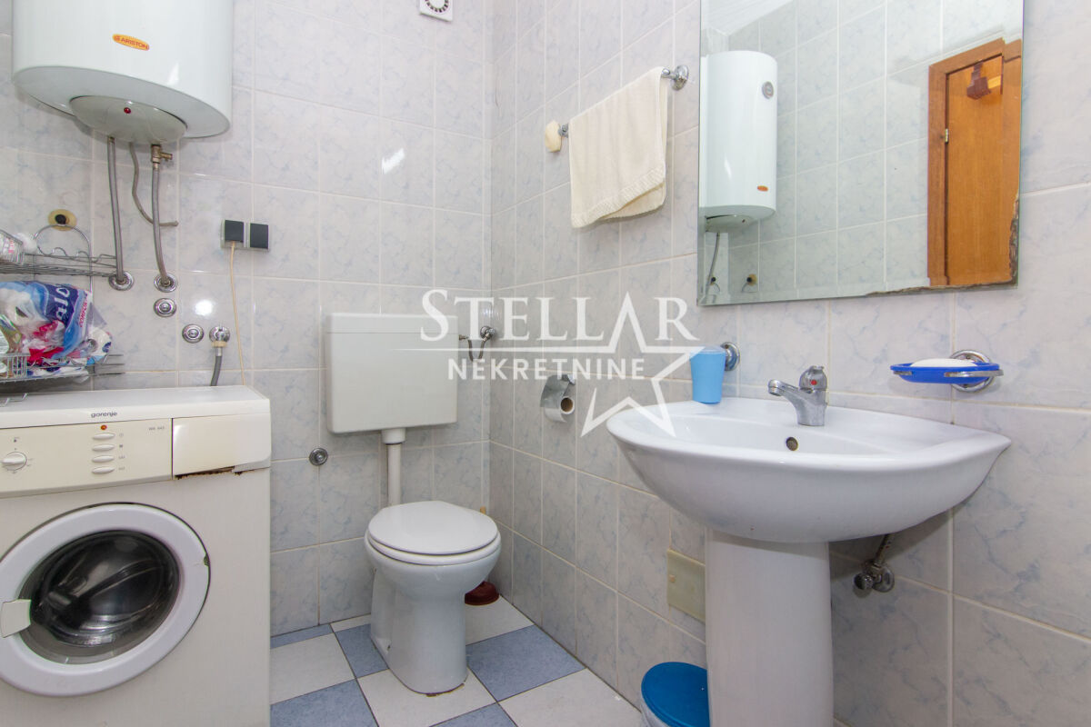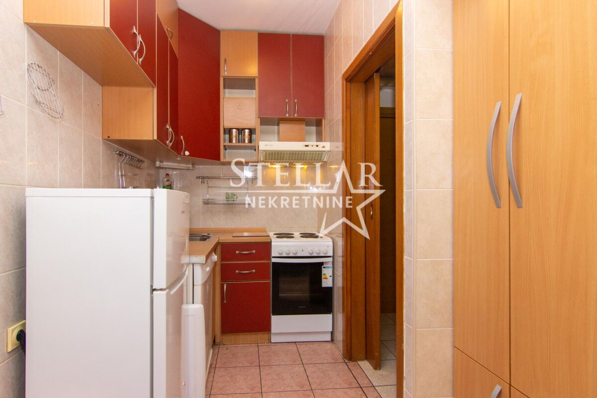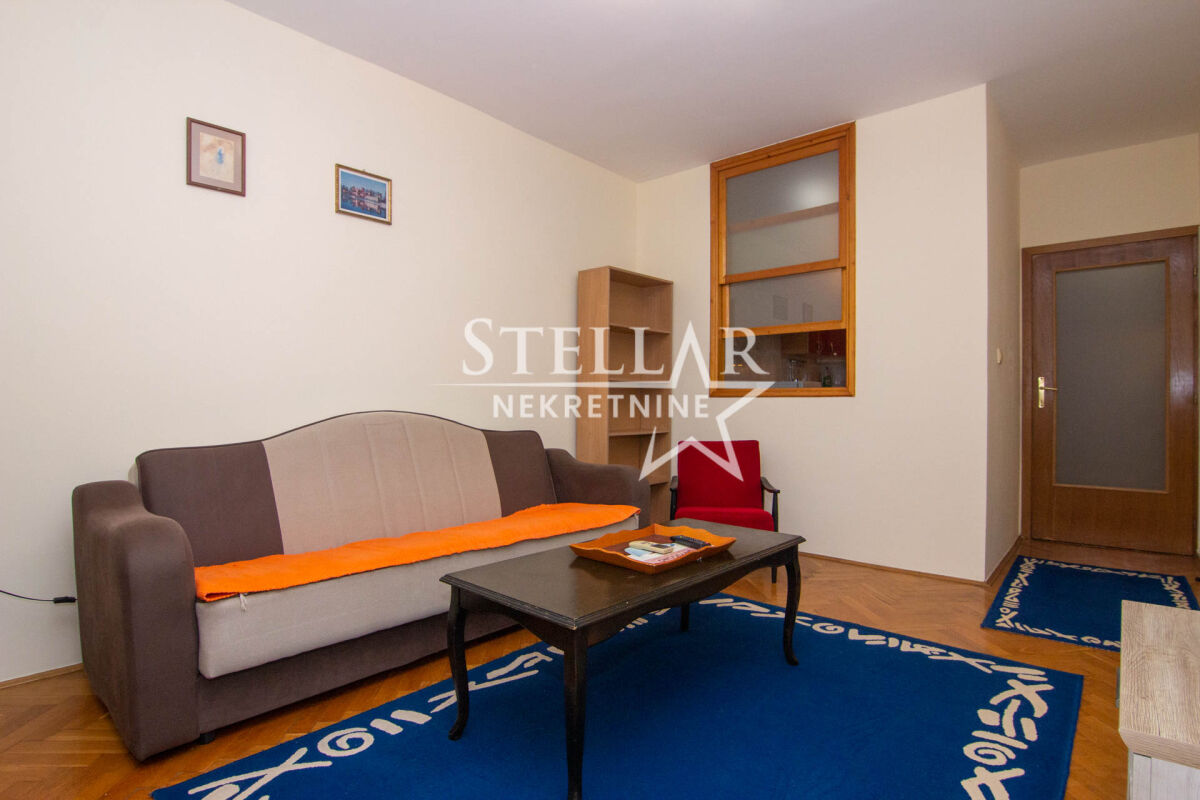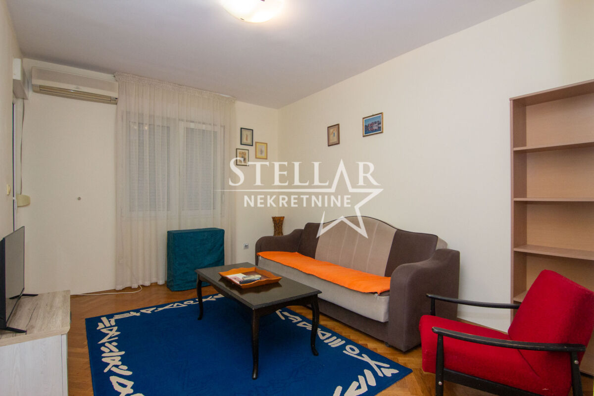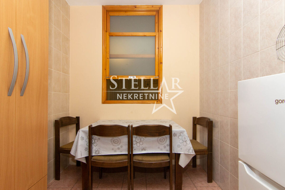 A fully furnished apartment of 58m2 is for rent. The apartment is located on the second floor of a building with an elevator. The living room has an air conditioning unit, and other appliances include a washing machine and a dishwasher. The living room is completely separated from the dining area and kitchen. Small pets are allowed in the apartment. The apartment is in an excellent location, with shops, markets, cafes, restaurants, hair salons, gyms, and schools nearby. Parking is public and available all around the building. It is available for a longer period with a mandatory deposit. Property ID S77 +382 69 618 445