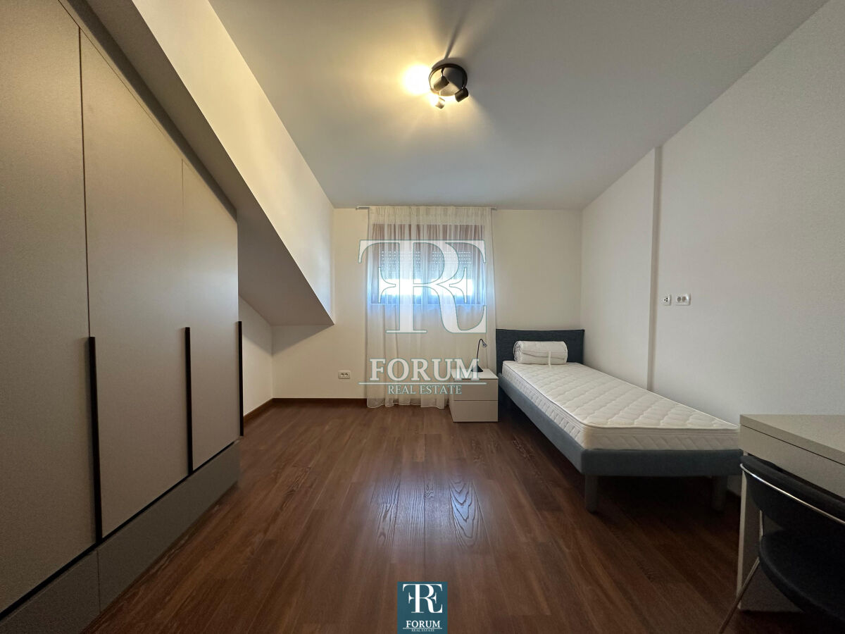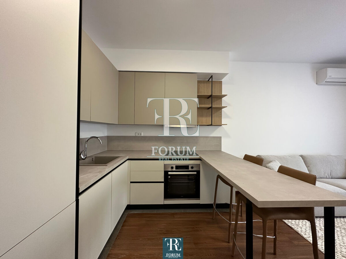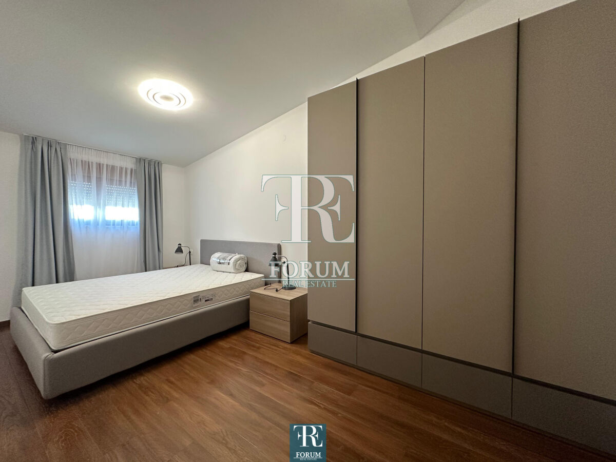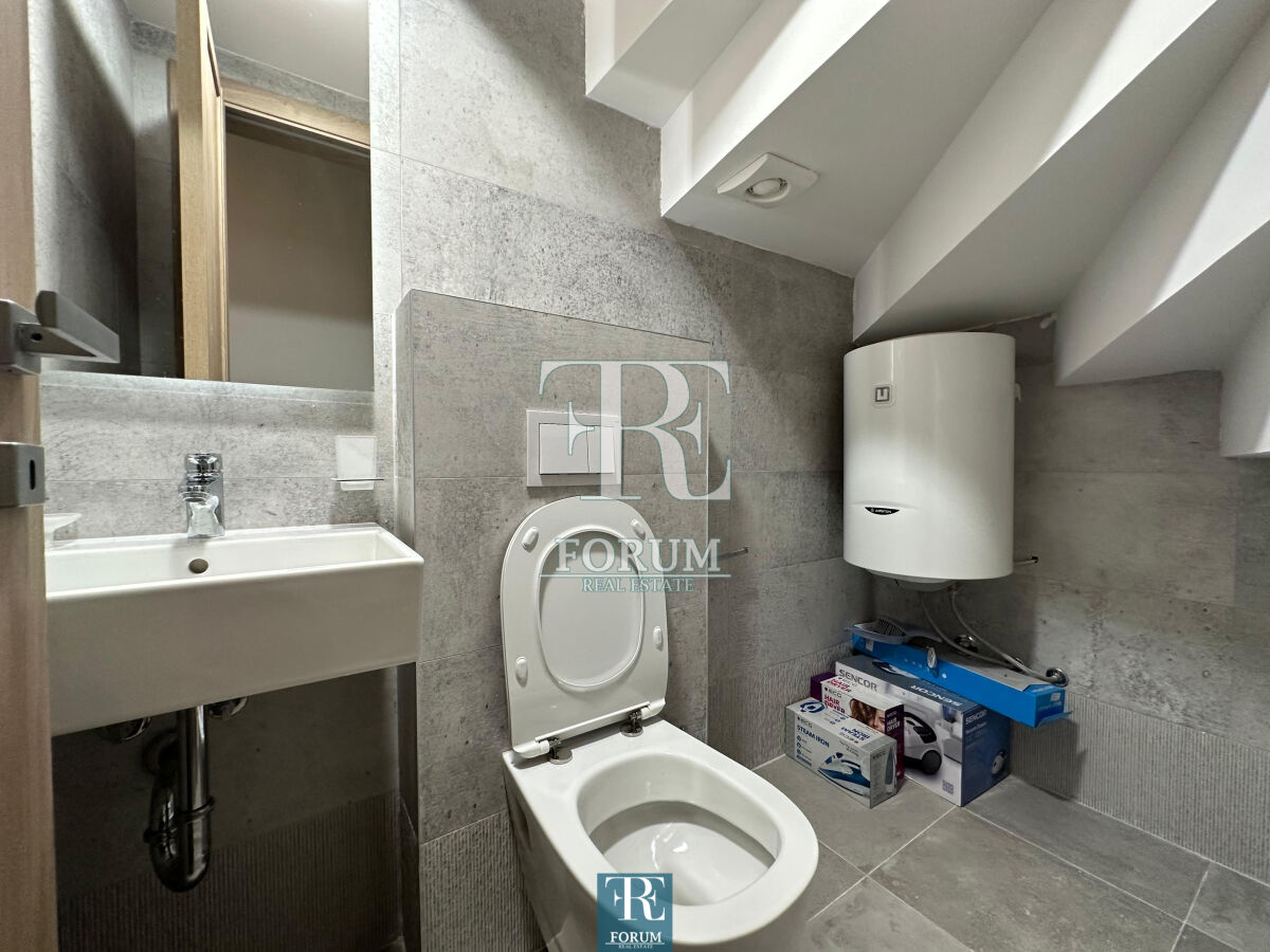 A nicely furnished two bedroom duplex apartment of 70 m² is for rent, located on the ninth floor of a modern building with two elevators, in the renowned Master Kvart complex. The apartment consists of an entrance hall, a bright living room connected to the kitchen and dining room, two comfortable bedrooms, a bathroom, an additional toilet and a terrace with a pleasant view. A garage space is included in the price. Modern design, quality equipment and exceptional location make this apartment ideal for a pleasant and comfortable life.