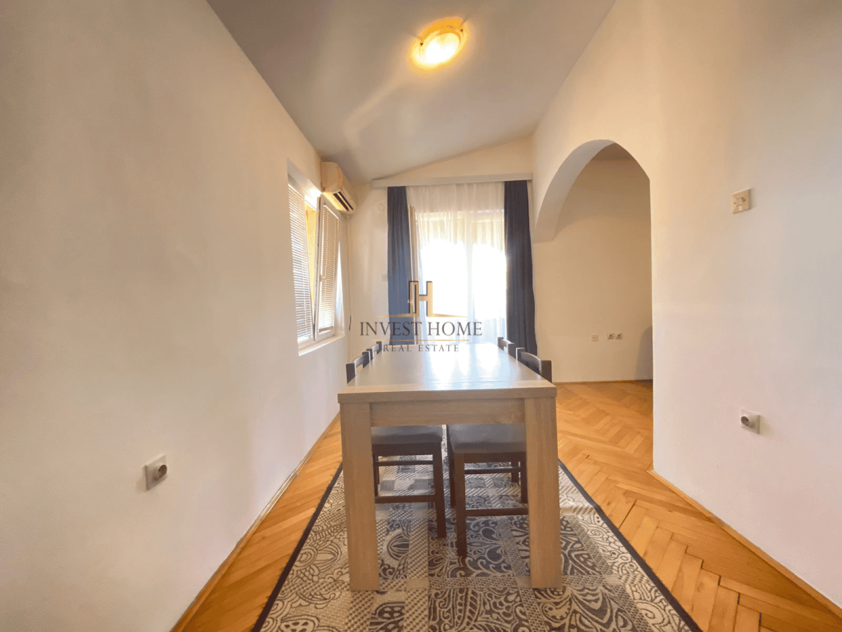 For rent is a one-bedroom apartment, Stari aerodrom, with an area of 65m2. The apartment is located on the second floor of a smaller residential building that does not have an elevator. The layout of the apartment includes a living room, kitchen, dining area, hallway, bedroom, bathroom, and terrace. It is in close proximity to cafes, restaurants, markets, schools, kindergartens, and other essential city amenities.