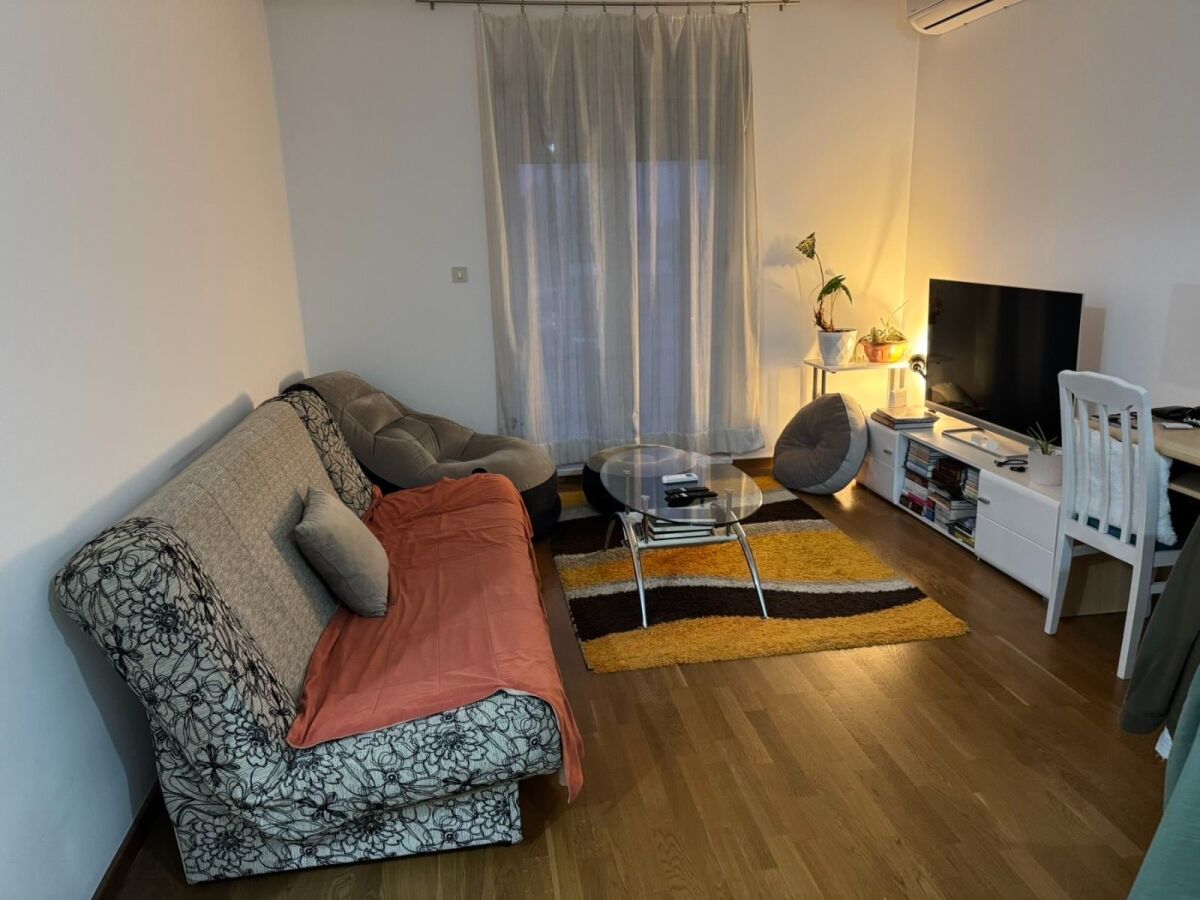 Furnished one-bedroom apartment 45m2 for rent in the Juzna Kapija building in Zabjelo, Podgorica. The apartment is located on the 2nd floor of a residential building with an elevator. Parking available in front of the building. The apartment is available from January 1.