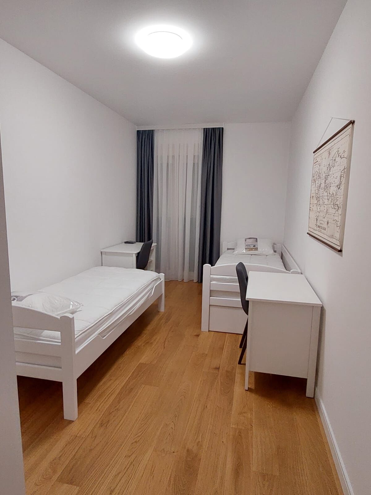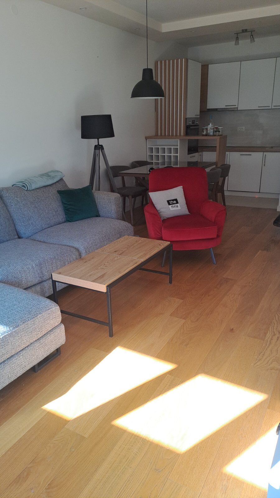 Two bedroom apartment for rent in Central Point. It is located on the 7th floor and looks towards the shopping center. It has 70m2 and includes a garage space. Available from February 1.