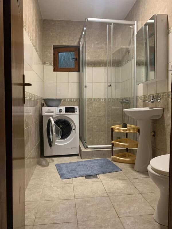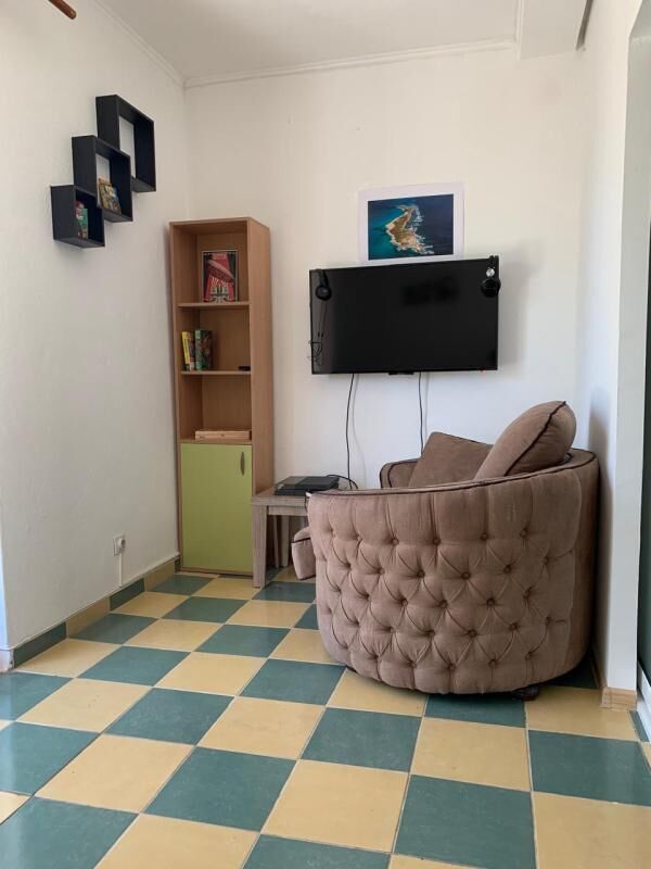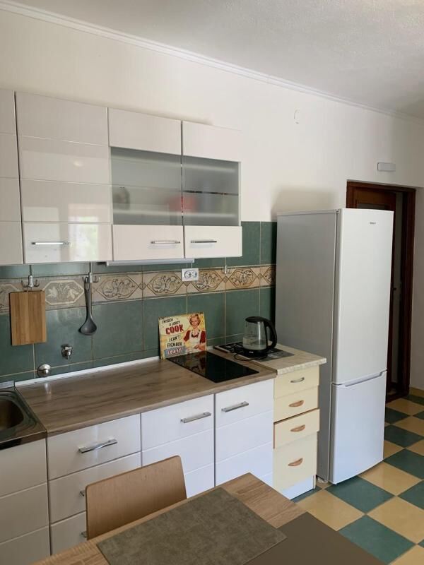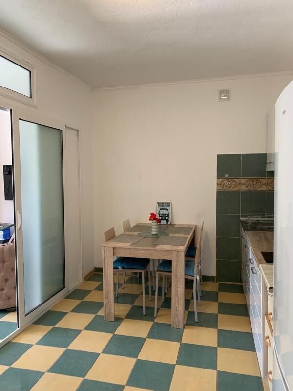 One-bedroom apartment with its own stone-lined terrace of 20 m2, facing south towards the sea. Ground floor, area 65m2. Room 1: a large bedroom with a double bed, a wardrobe, a work space; room 2: a kitchen-dining room with a large refrigerator, an electric kettle, a hob with 2 burners, a large dining table for 6 people. A living room with a pull-out sofa (2 beds), a TV, and an exit from the living room to its own outdoor sunny terrace. Workplace. The apartment has 2 air conditioners. Large bathroom with shower and its own washing machine. The building is 600 meters from the beach and the BB restaurant. There is a powerful dehumidifier, bed linen, kitchen utensils, etc., Internet - unlimited Wi-Fi. Within walking distance of a school, kindergarten, private shops and chain stores - Idea and Aroma. Payment per month, plus utilities, payment at once: first month + last two + deposit. Parking is available - payment for parking space separately.