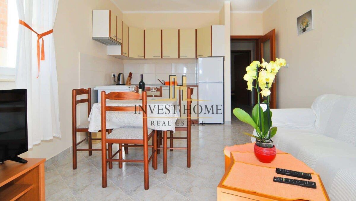 For rent one-bedroom apartment in Tivat, area 48m2. The apartment is located on the first floor of a house with a separate entrance. Apartment layout: living room with kitchen and dining room, bedroom, hallway, bathroom, terrace. It is located near all city amenities. It has a parking space.