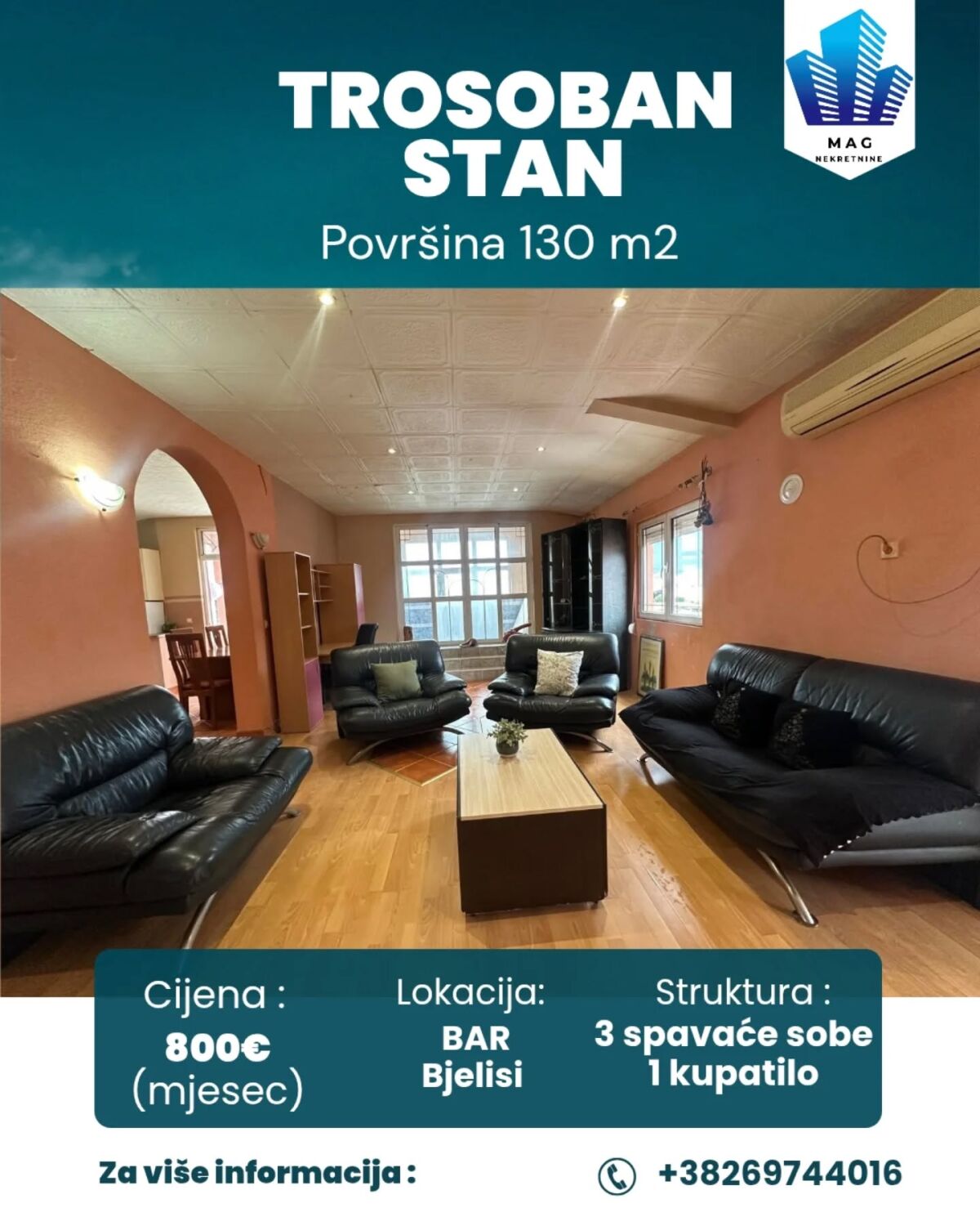 Сдача меблированной трехкомнатной квартиры площадью 130м2, Бар (возле автобусной станции). ✔️гостиная с столовой и кухней, три спальни, две террасы, ванная комната и туалет. Второй этаж небольшого здания без лифта. Свободная парковка. Можно заехать сразу. Цена составляет 800евро. +38269744016 #barmontenegro #apartmentforrent